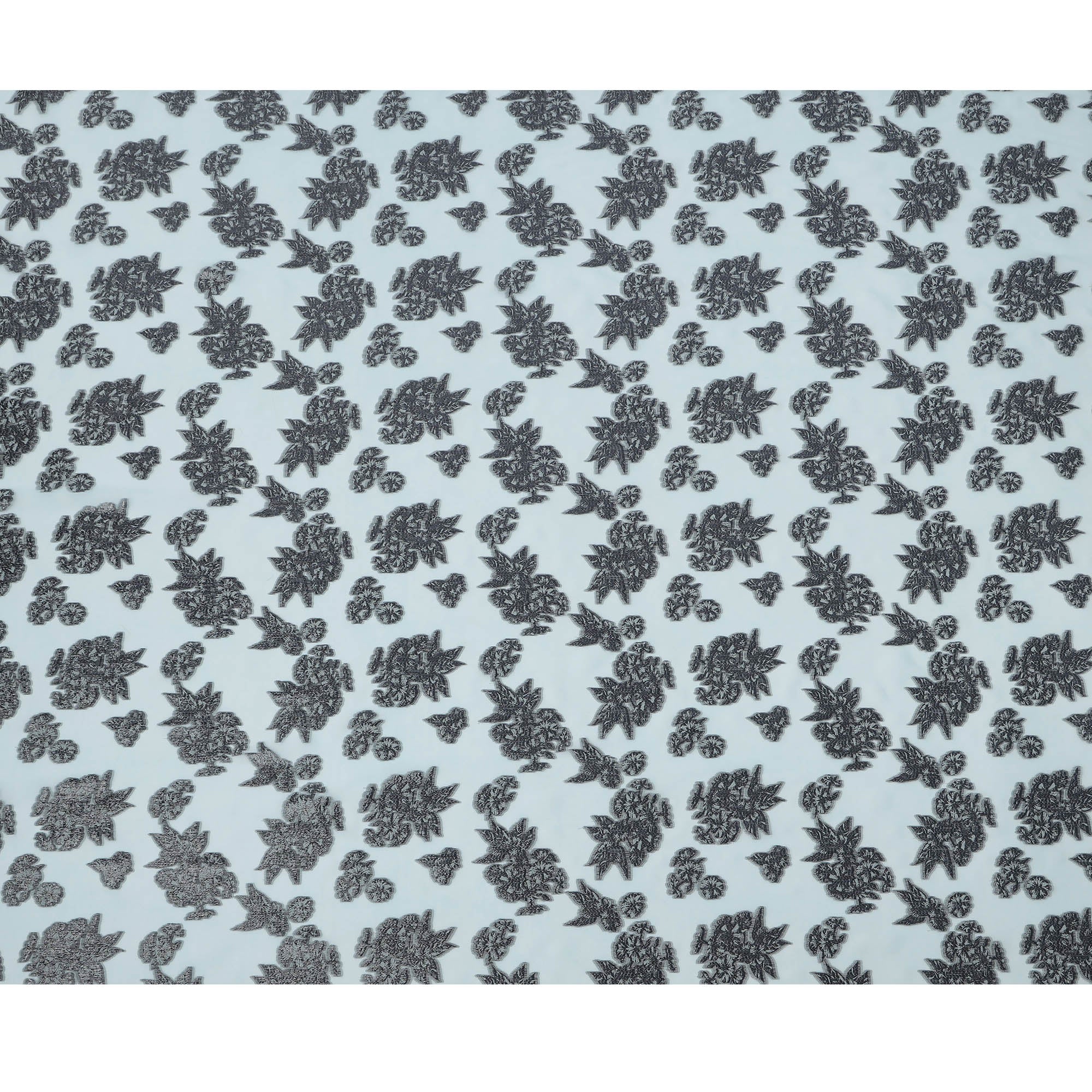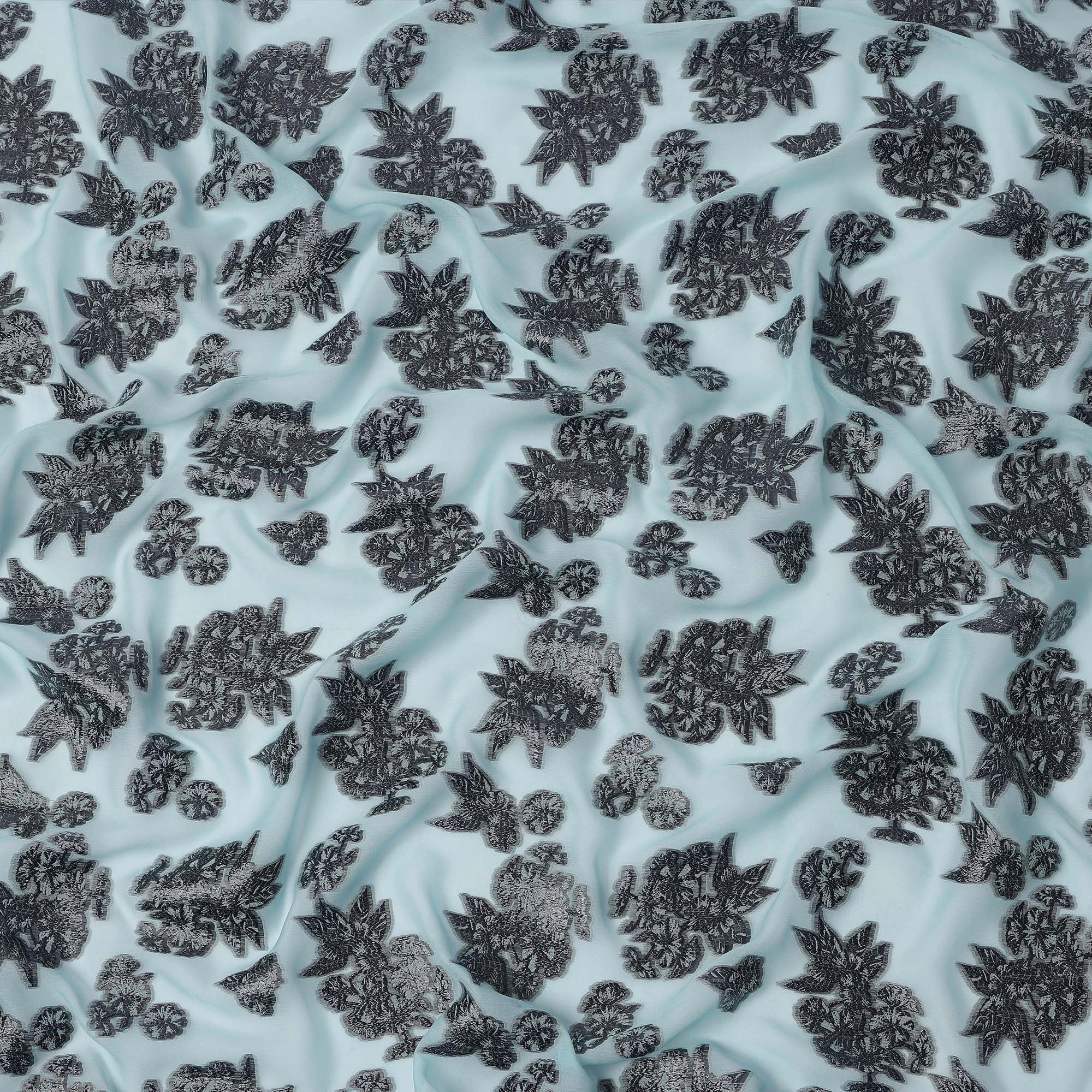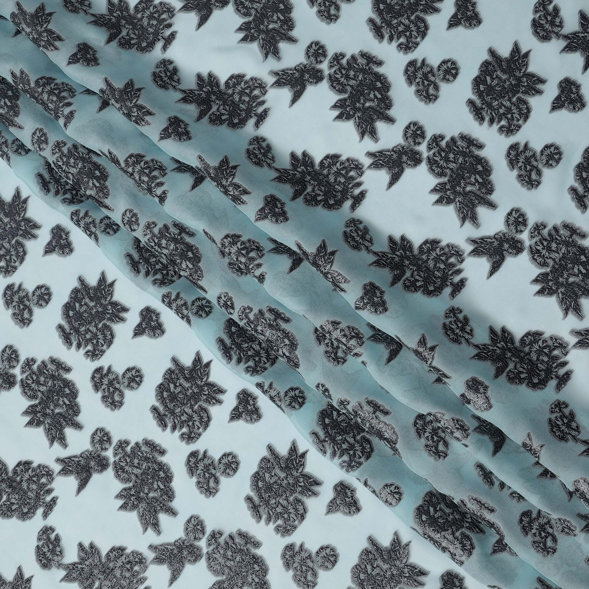 This light blue silk chiffon fabric with metallic lurex floral motifs is a stunning blend of elegance and modern charm. The airy chiffon base in a soft light blue tone adds a refreshing appeal, while the metallic black floral designs bring depth, contrast, and a shimmering sophistication. Lightweight, semi-sheer, and fluid, this fabric drapes gracefully, making it ideal for sarees, dupattas, gowns, overlays, and evening ensembles. The metallic detailing enhances its glamorous look, perfect for festive occasions, designer outfits, and couture wear. Made in South Korea, it reflects premium craftsmanship and luxury.