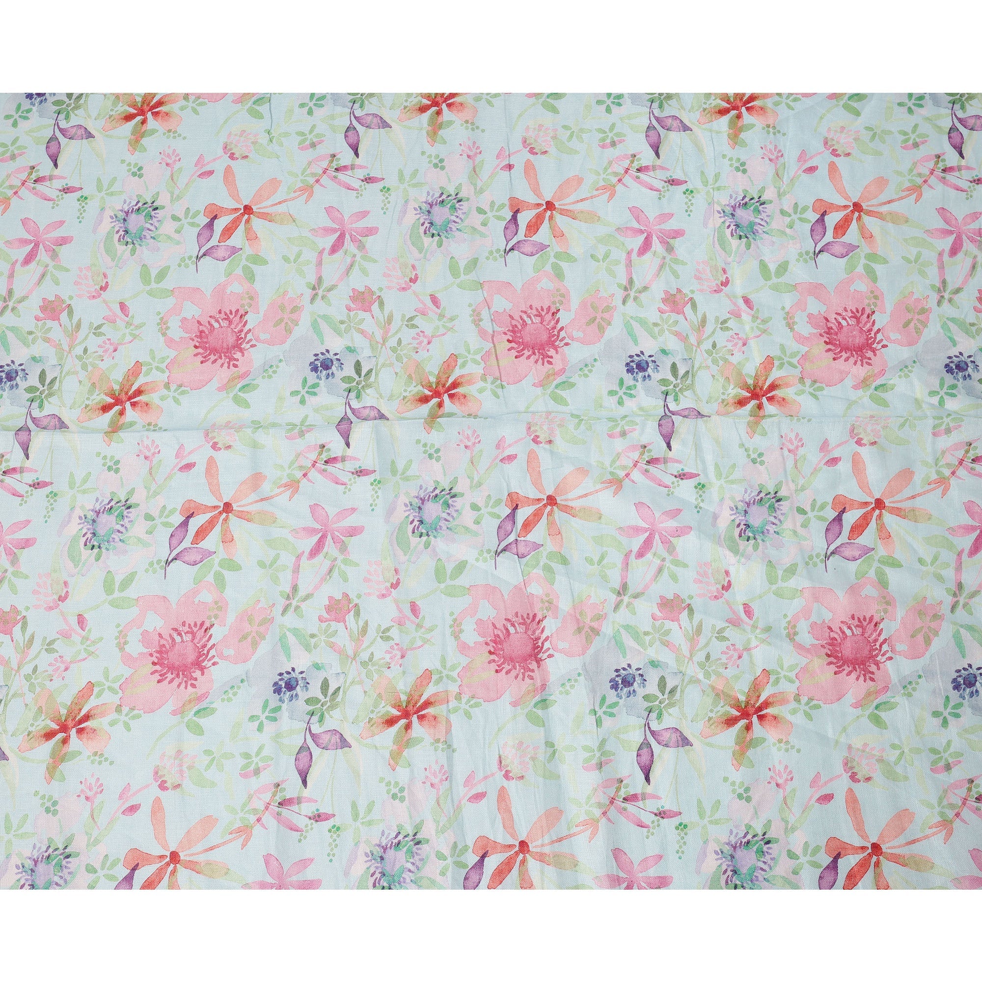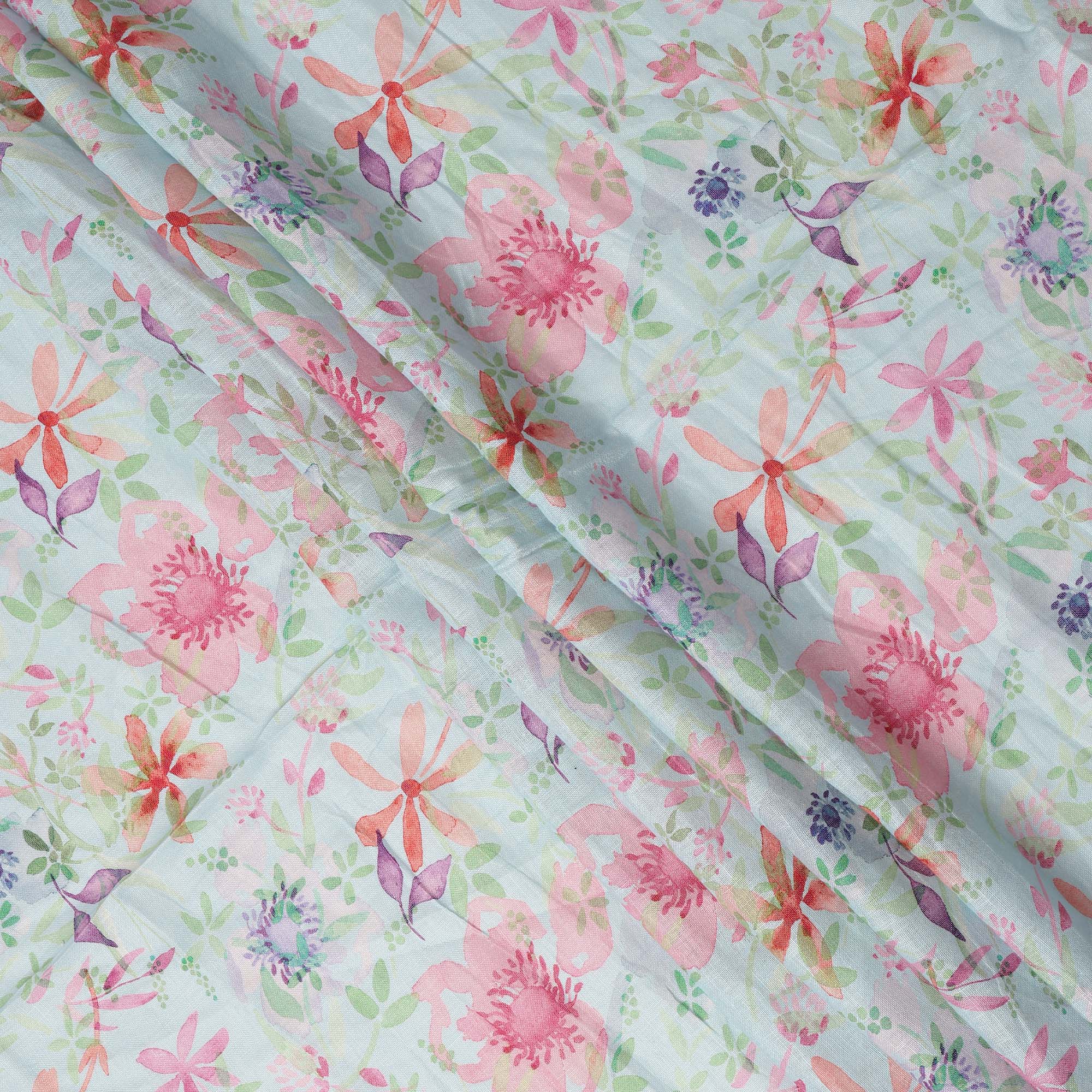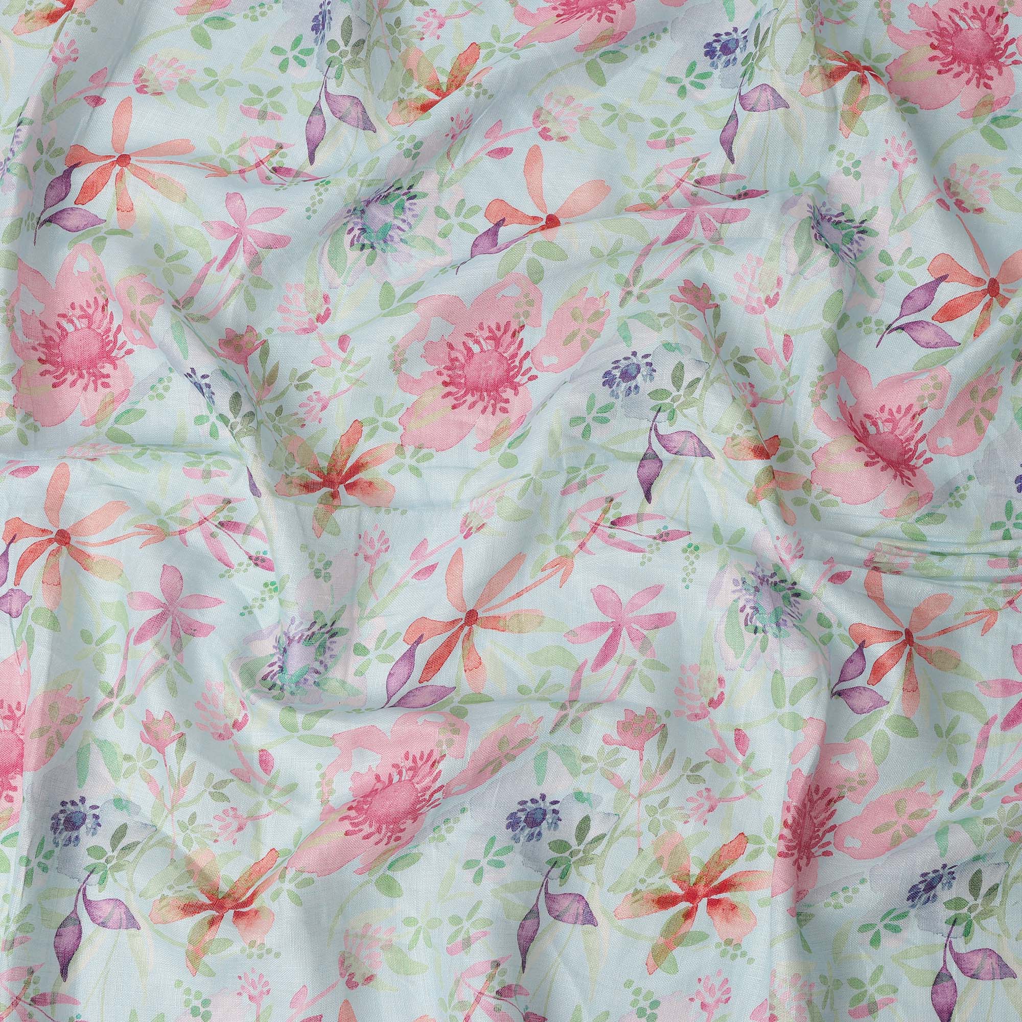 Light Blue Multicolor Watercolor Floral Print Blended Linen Fabric, 110 Cms Width, Made in India-D26192