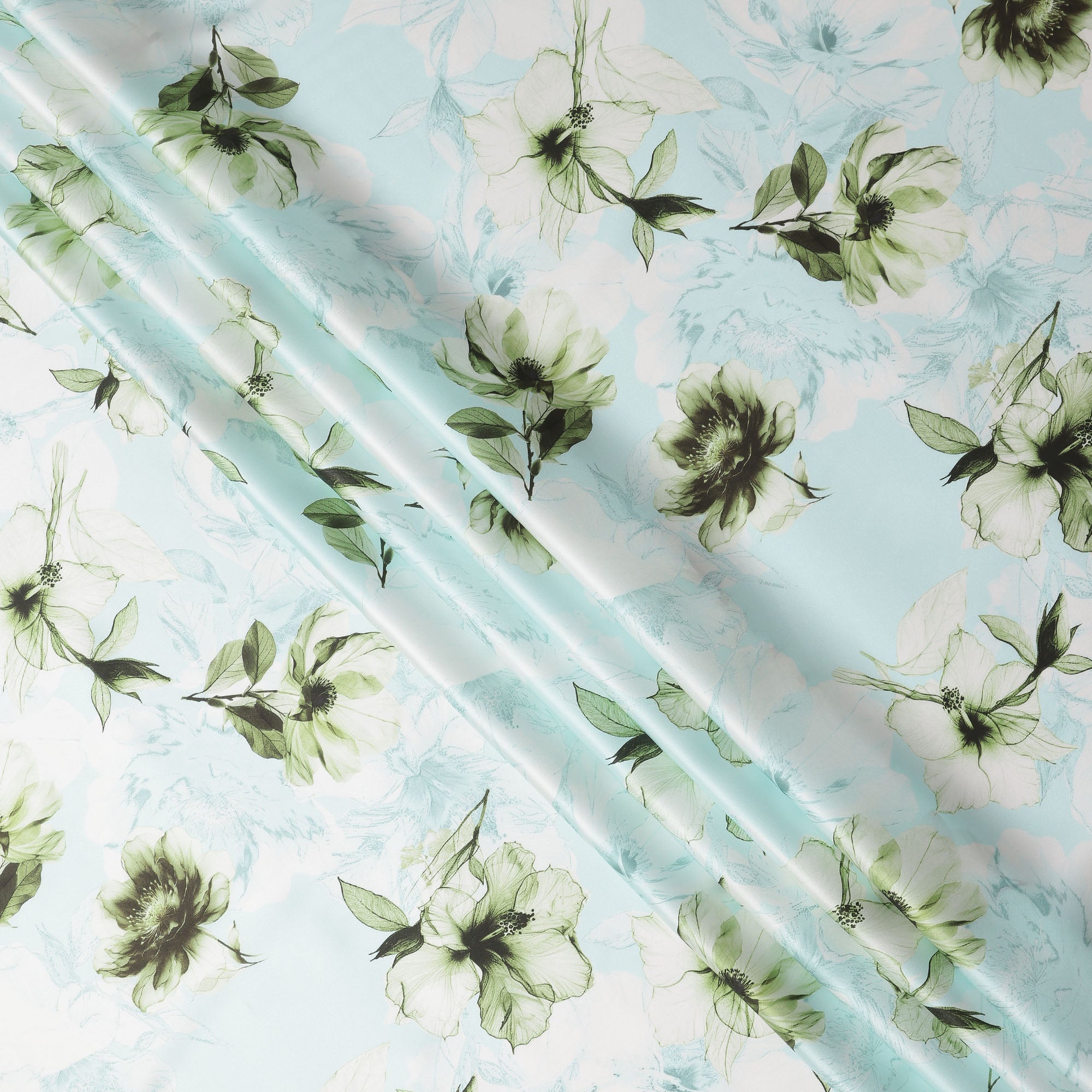 Light Blue Pure Silk Satin Fabric with Green Floral Print, 140 Cms Width, South Korea-D25355