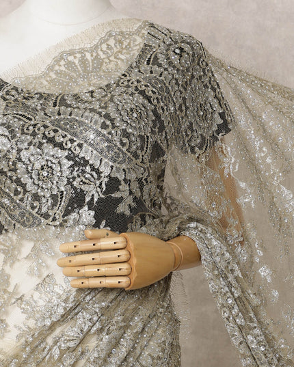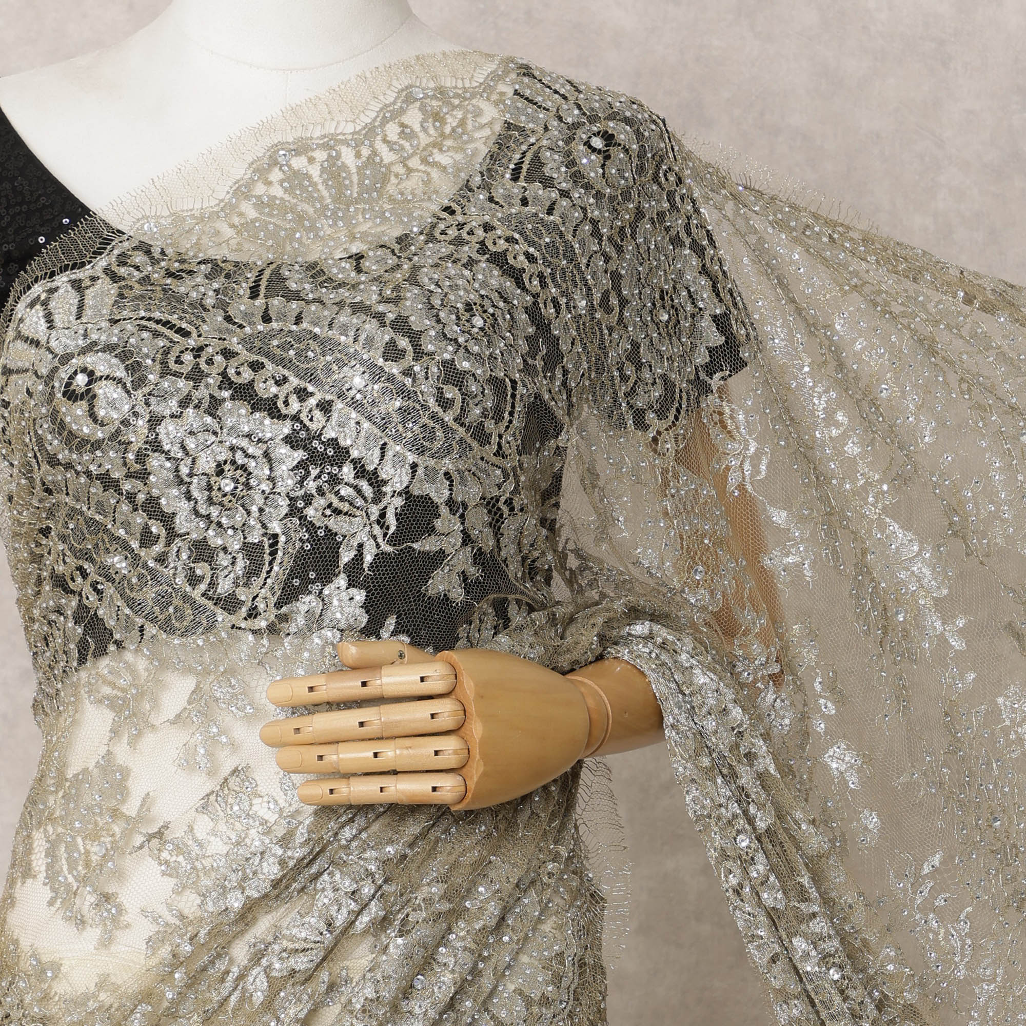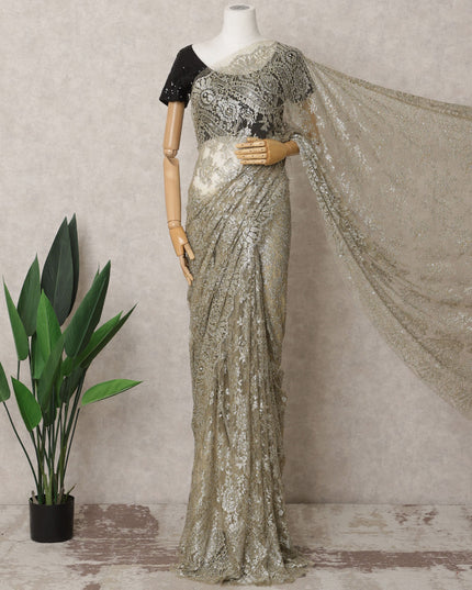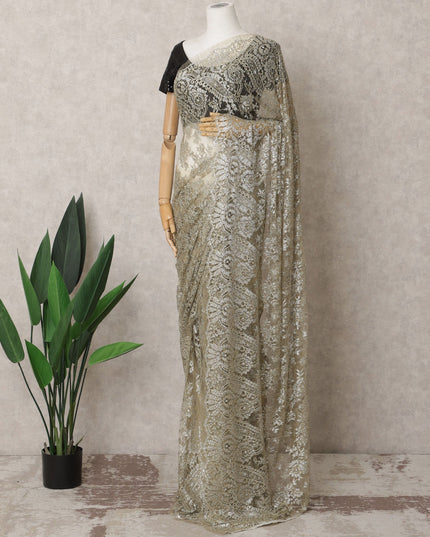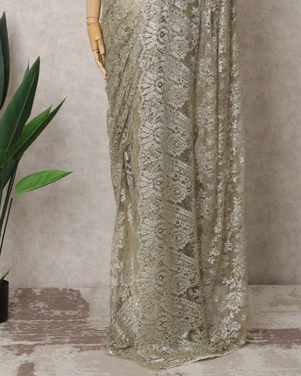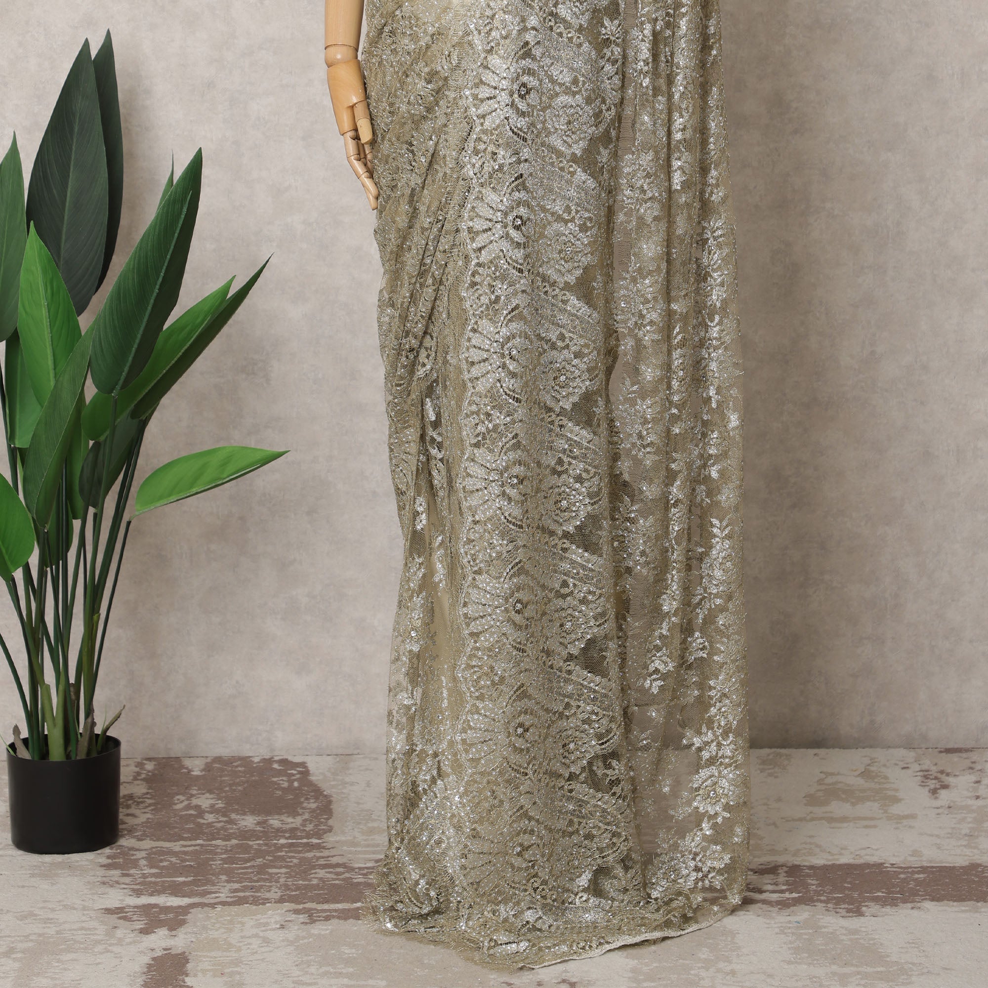 Light Gold Premium French Metallic Chantilly Lace Saree – 5.5 Meters, Stone Work-D21863