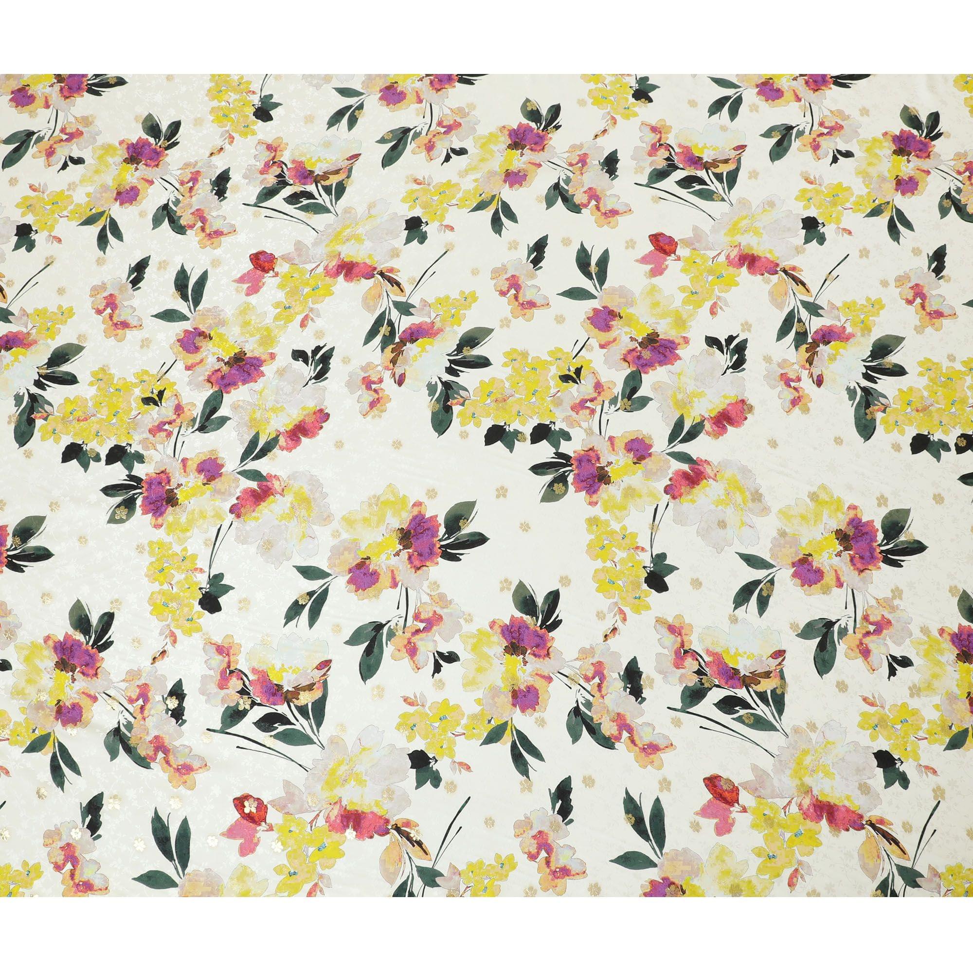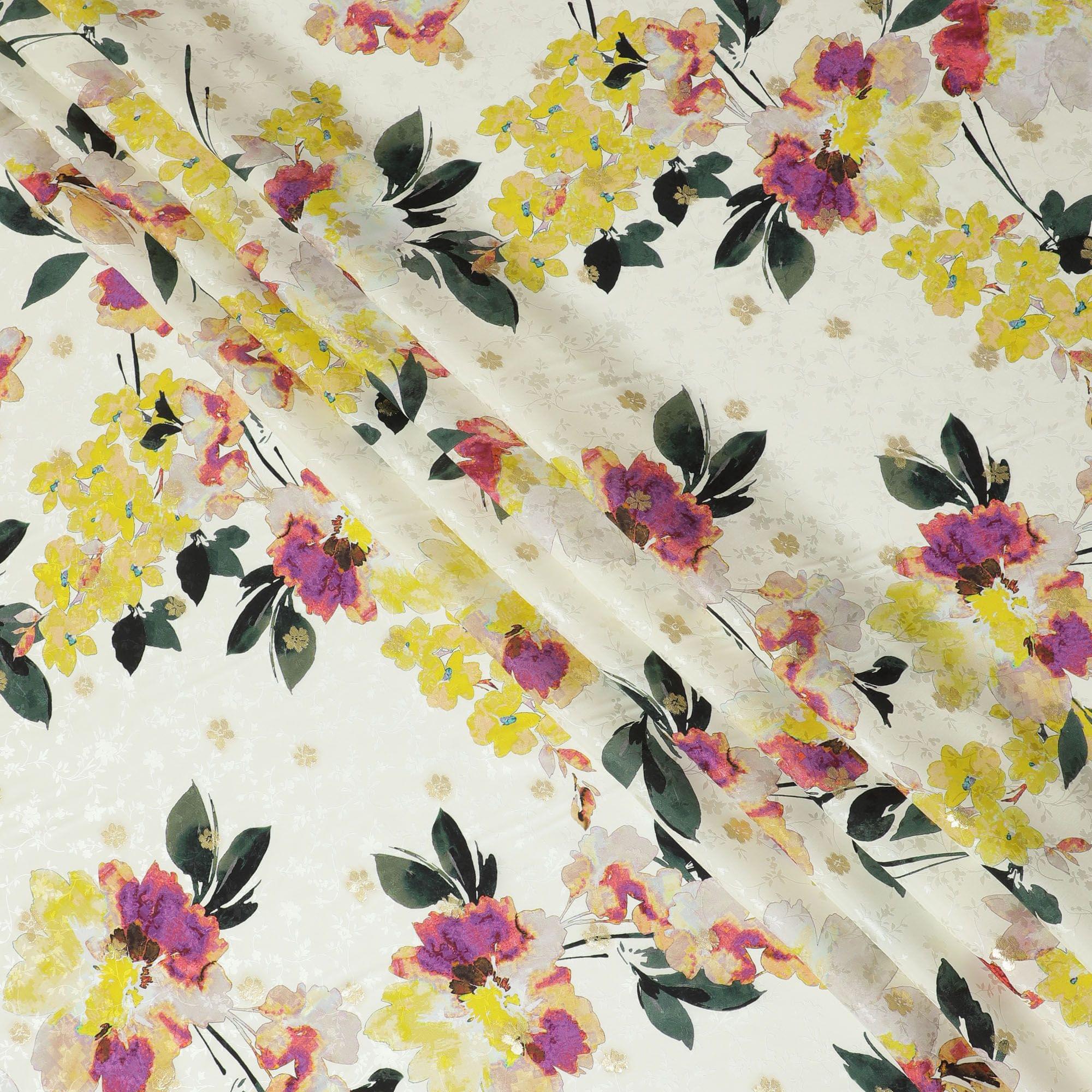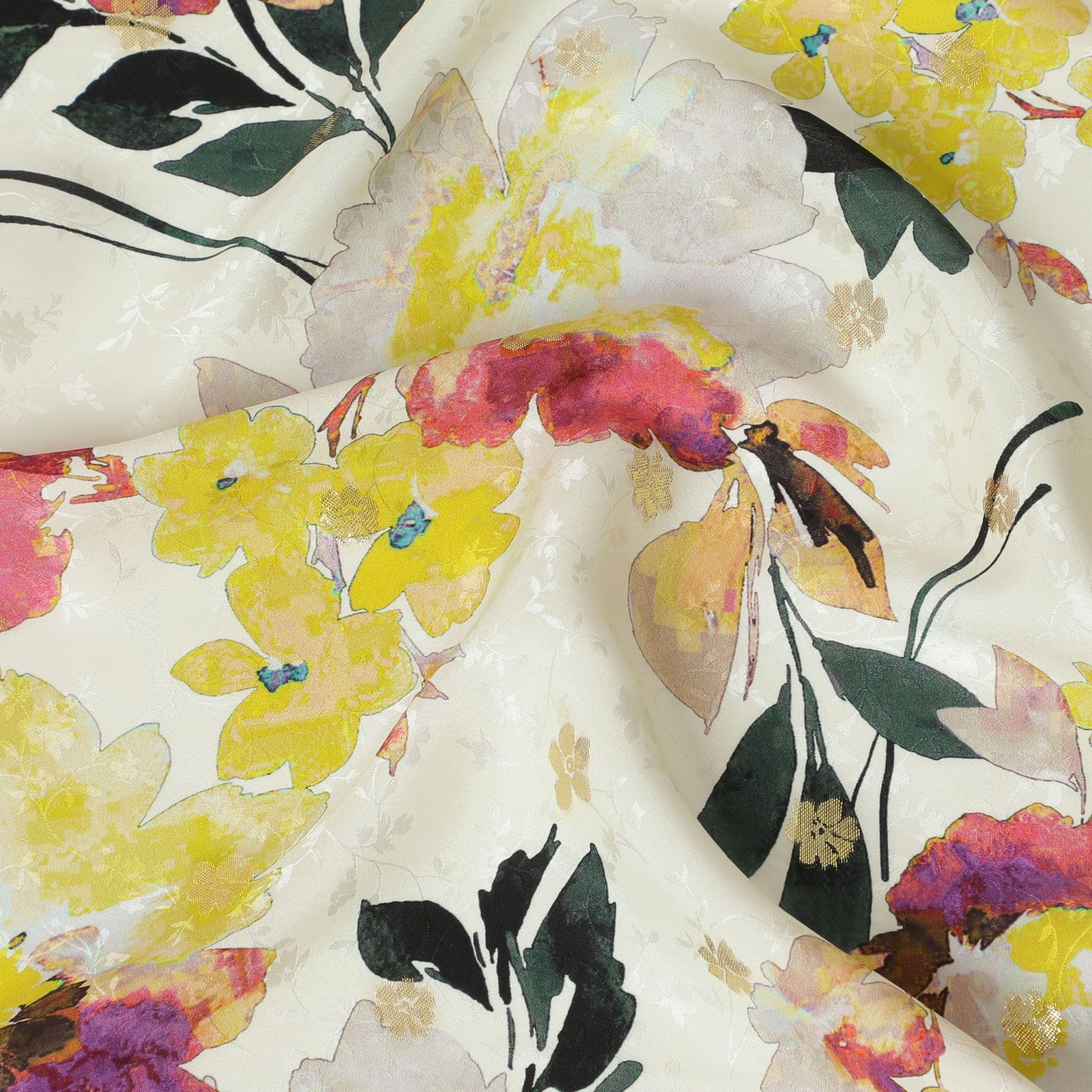Light gold Premium pure silk crepe fabric with same tone jacquard having multicolor print gold metallic lurex in floral design-D15739