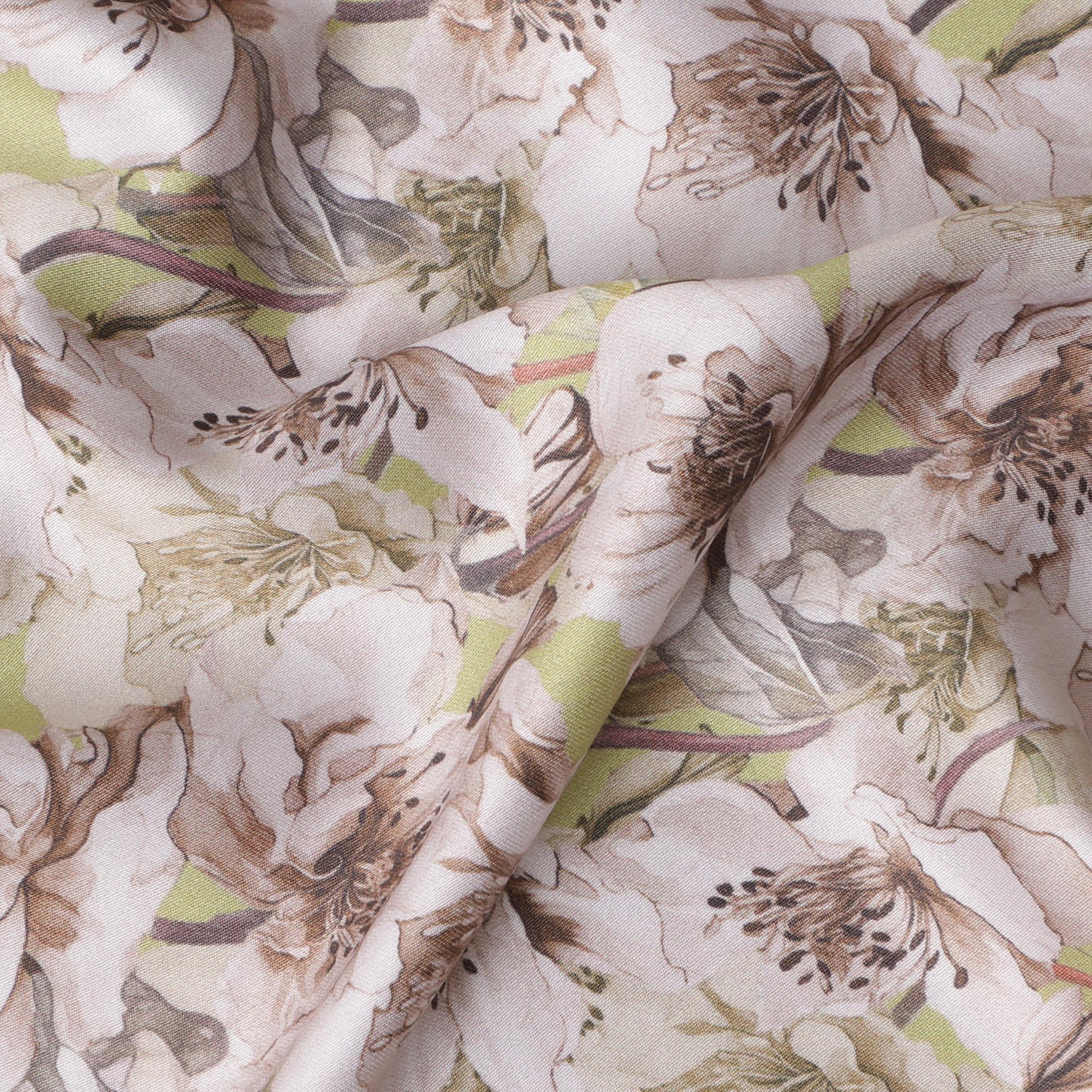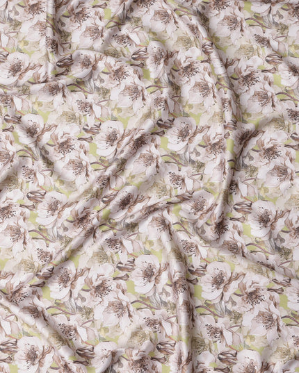 Enhance your creations with this light green cotton satin fabric, adorned with a delicate white and beige floral print that exudes elegance and charm. Imported from India, this high-quality fabric features a silky smooth texture, subtle sheen, and fluid drape, making it perfect for designer apparel, stylish tops, ethnic wear, and refined home décor. The soft floral pattern, set against a soothing green backdrop, creates a graceful and timeless appeal suitable for both modern and classic designs. With a 110 cm width, this fabric offers excellent versatility, while its breathable, lightweight, and skin-friendly properties ensure superior comfort. Shop online today to bring sophistication and beauty to your wardrobe or interiors.