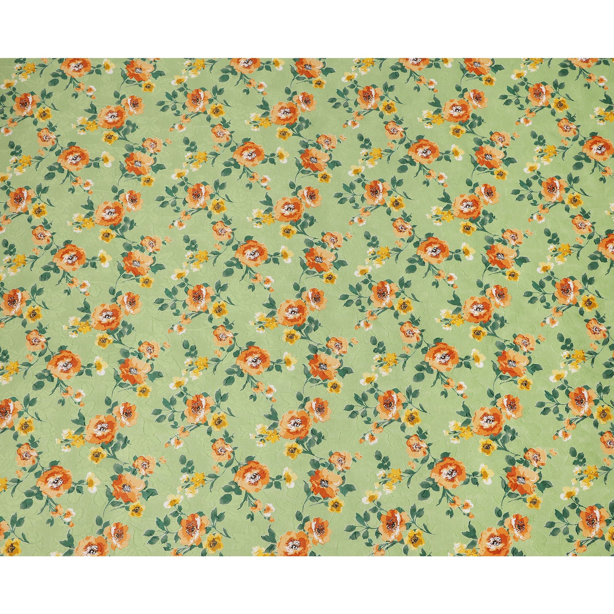 Soothing light green base with vibrant orange, yellow, and white floral prints