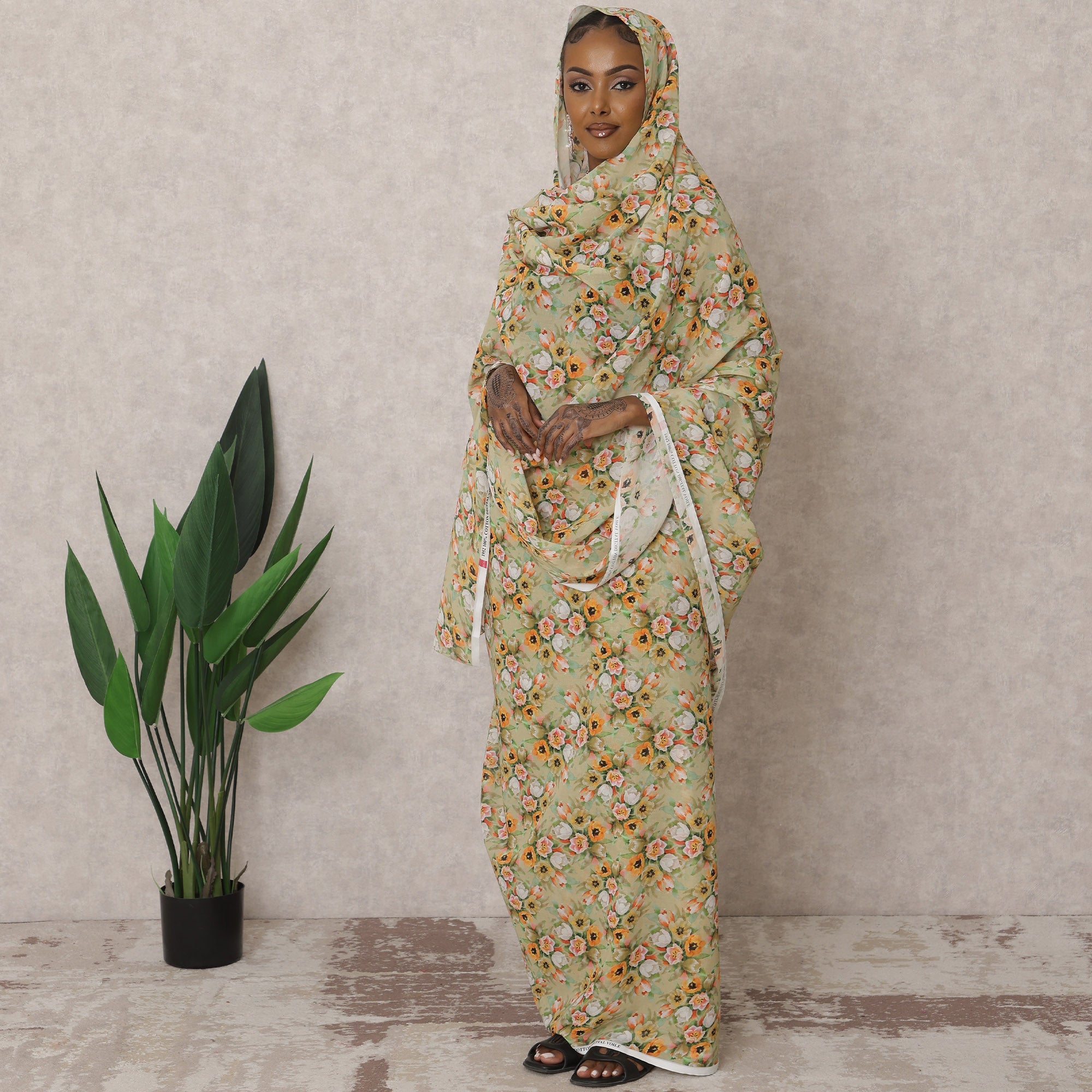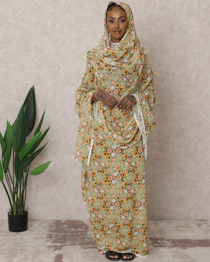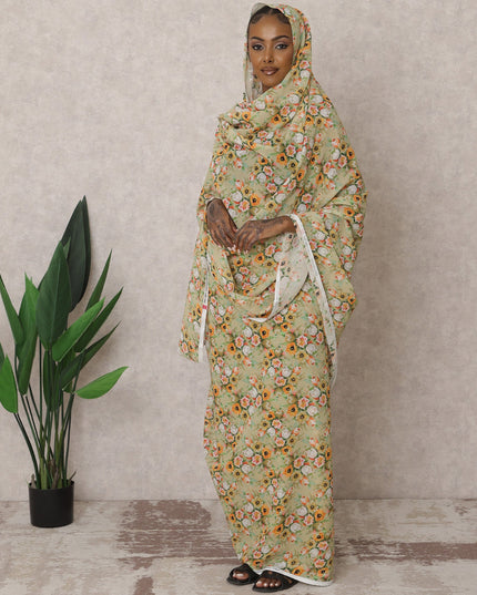 Step into elegance with this exquisite light green traditional Sudanese thobe, crafted from premium pure cotton voile fabric for a soft, breathable, and lightweight feel. The 4.5-meter-long fabric drapes gracefully, offering a modest yet stylish silhouette perfect for cultural gatherings and everyday wear. Adorned with vibrant floral prints in shades of yellow, pink, and white, this thobe blends tradition with a contemporary touch, making it a timeless wardrobe essential. With a width of 110 cm, it ensures full coverage while maintaining a comfortable and airy fit. Expertly crafted in India, this high-quality thobe is easy to wash and retains its softness and color vibrancy, ensuring lasting beauty and elegance.