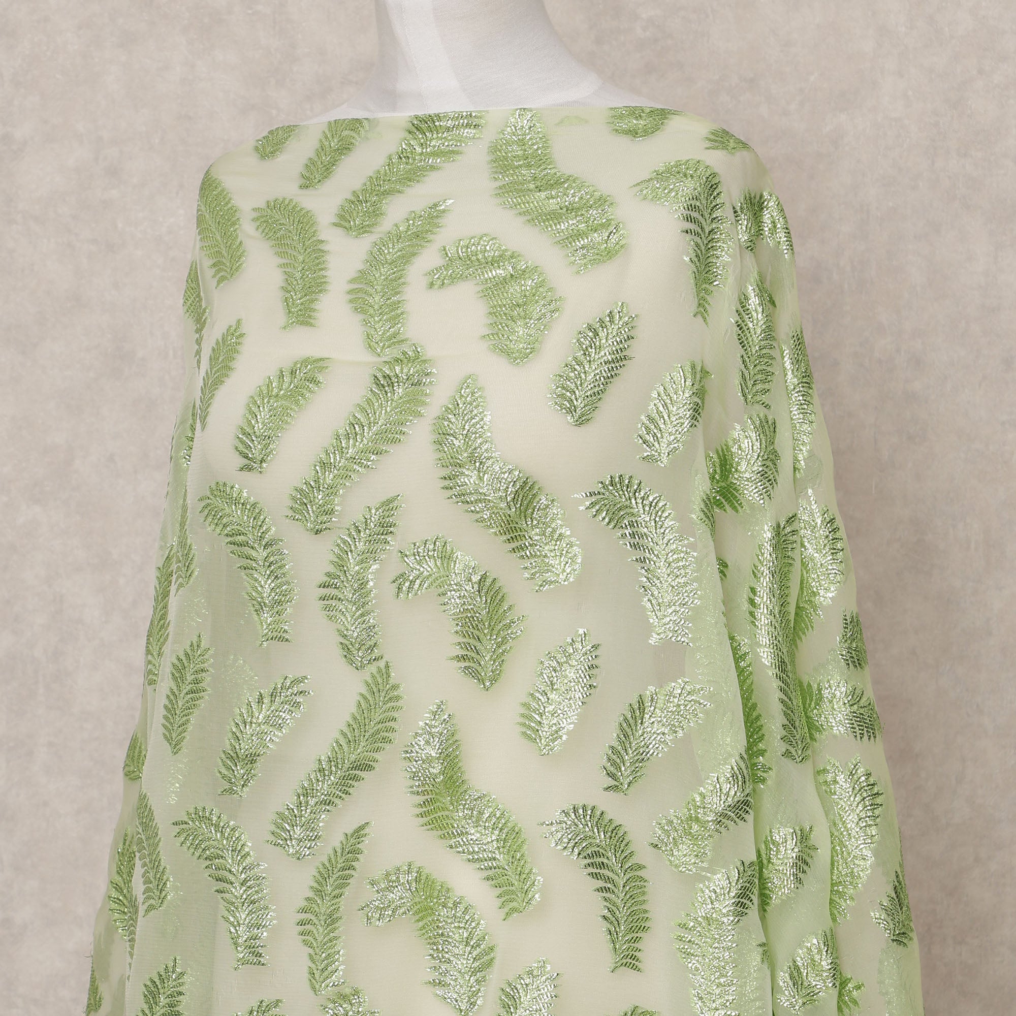 Premium metallic green lurex leaf motifs add a rich, decorative appeal