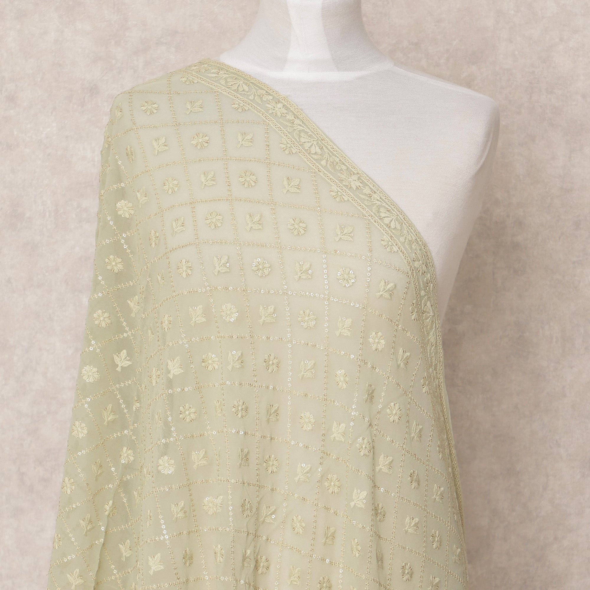 This light green geometric floral embroidered sequin work synthetic georgette dupatta is an elegant and timeless piece that blends traditional artistry with a refined modern touch. Crafted in India, this dupatta features a unique grid pattern embellished with delicate floral embroidery, further enhanced by subtle sequin detailing that adds a graceful shimmer. The soft light green hue exudes freshness and sophistication, making it perfect for festive occasions, weddings, and celebratory gatherings. Designed in lightweight synthetic georgette, the dupatta drapes beautifully, offering both comfort and elegance. Its size of 210X90 cms provides generous coverage, while the finely detailed border adds structure and refinement. Whether paired with ethnic suits, lehengas, or sarees, this dupatta elevates your overall look effortlessly, combining traditional embroidery with contemporary elegance in a versatile accessory.
