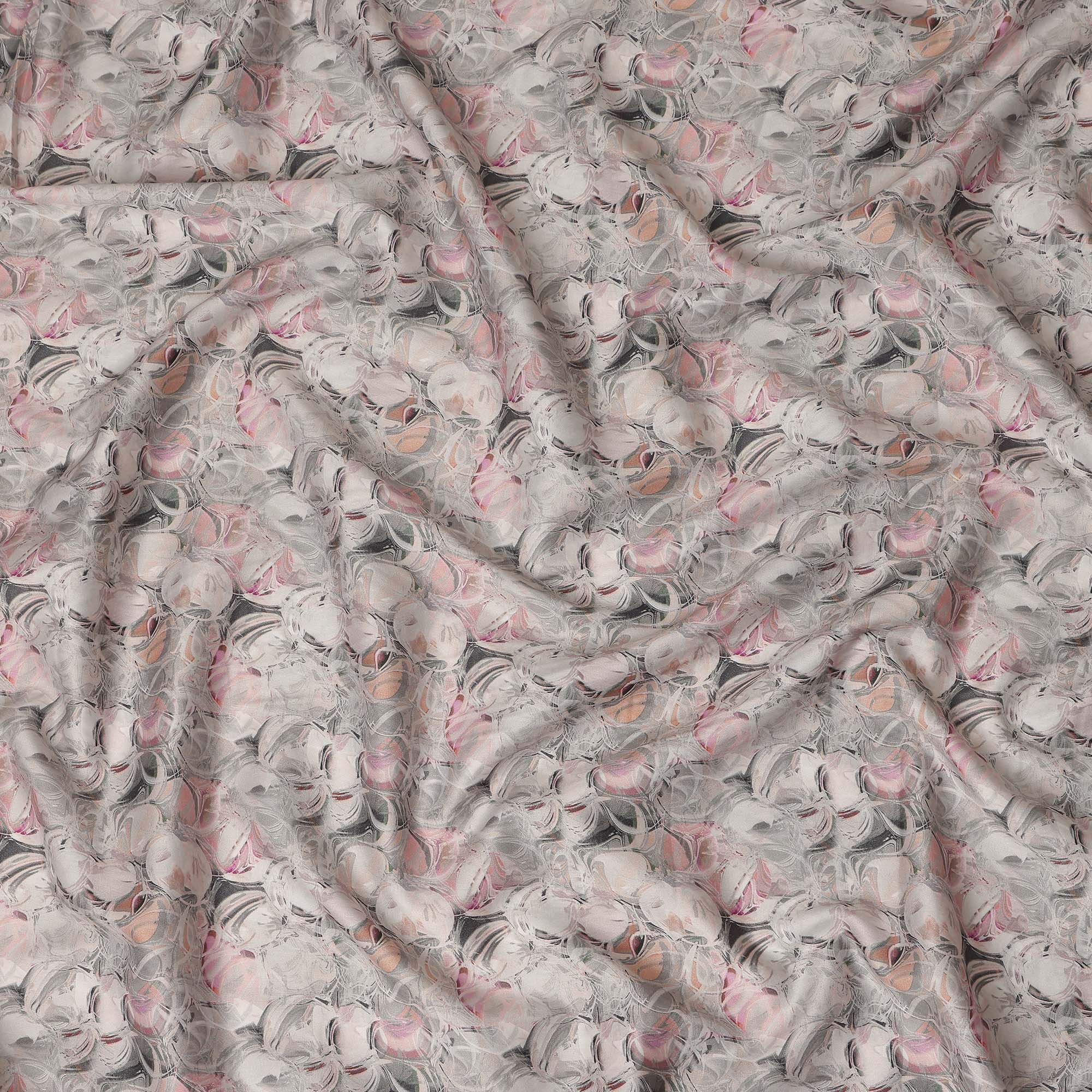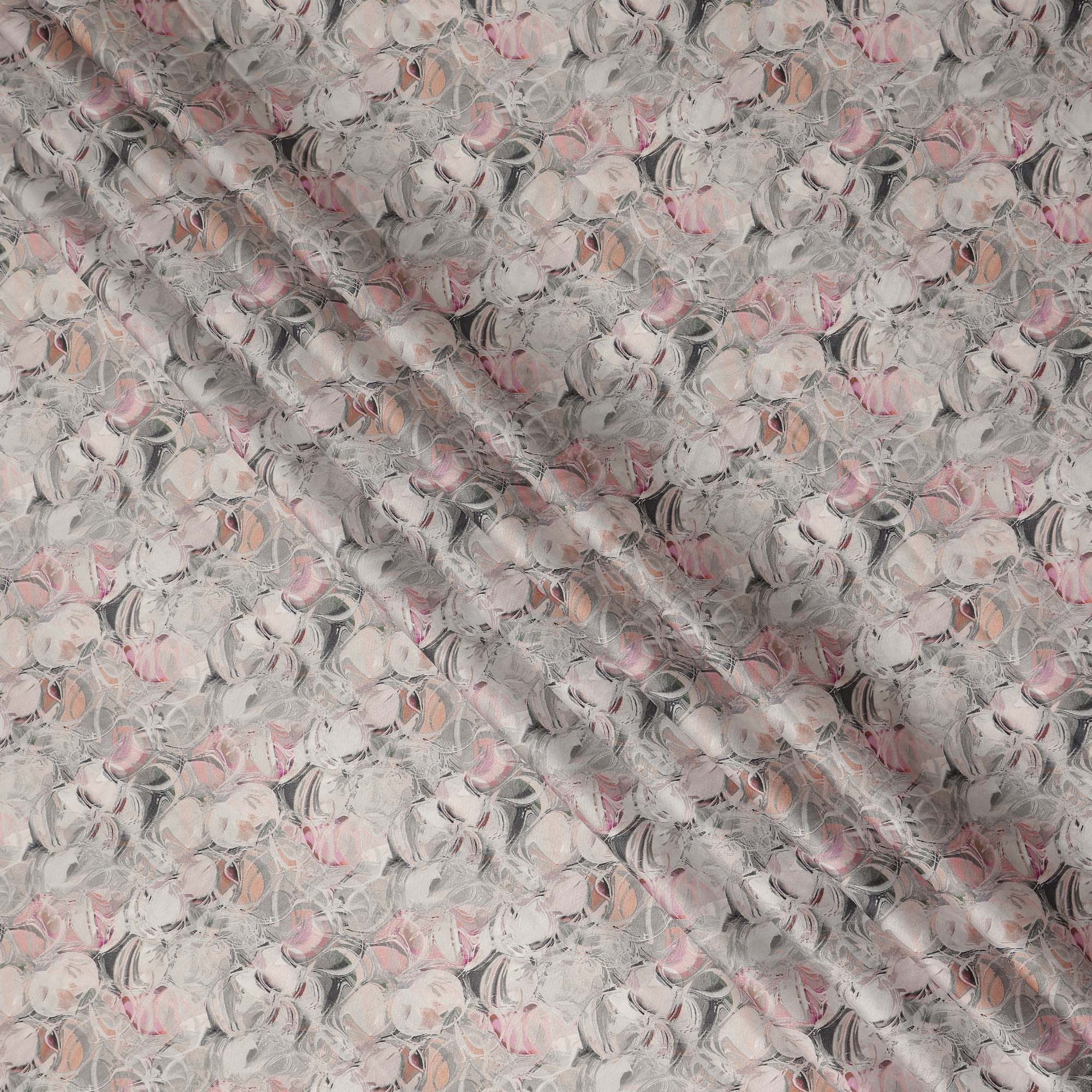 This light grey abstract printed cotton lawn fabric features a contemporary marble swirl design with soft blends of blush pink,... Read more Read more
