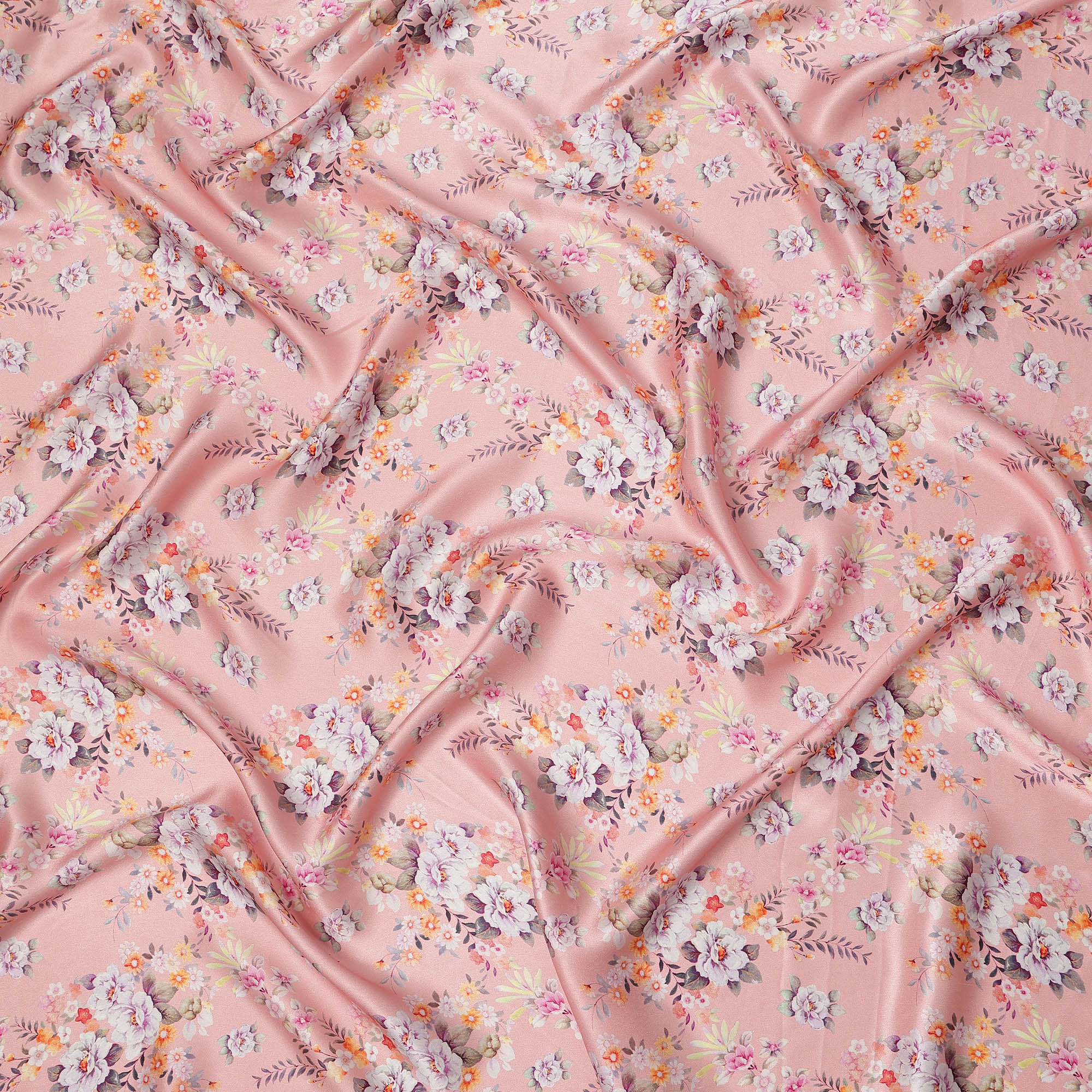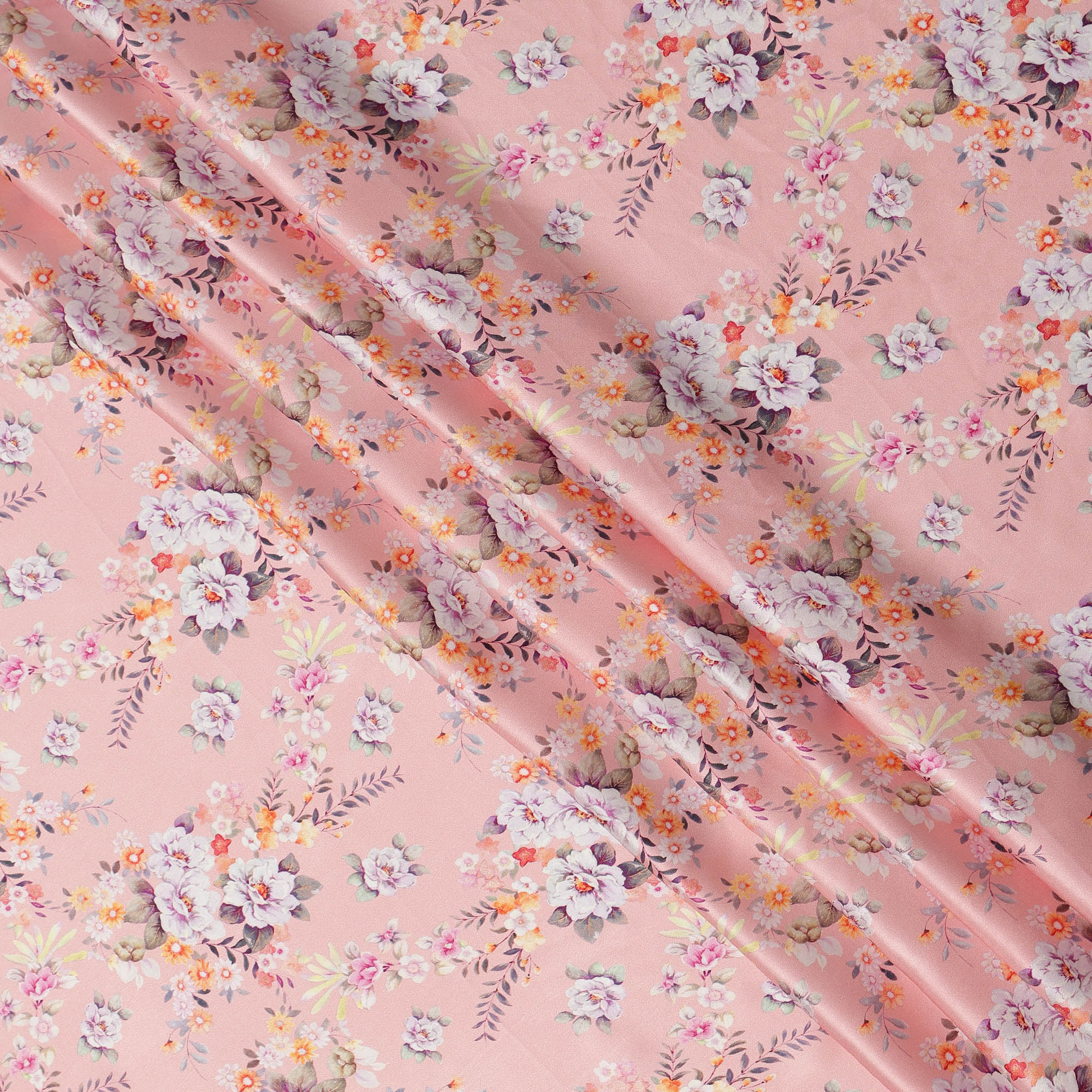 Light Pink Multicolor Floral Print Premium Pure Silk Satin Fabric, 110 cm Width, Delicate Botanical Design, Origin: South Korea-D26820