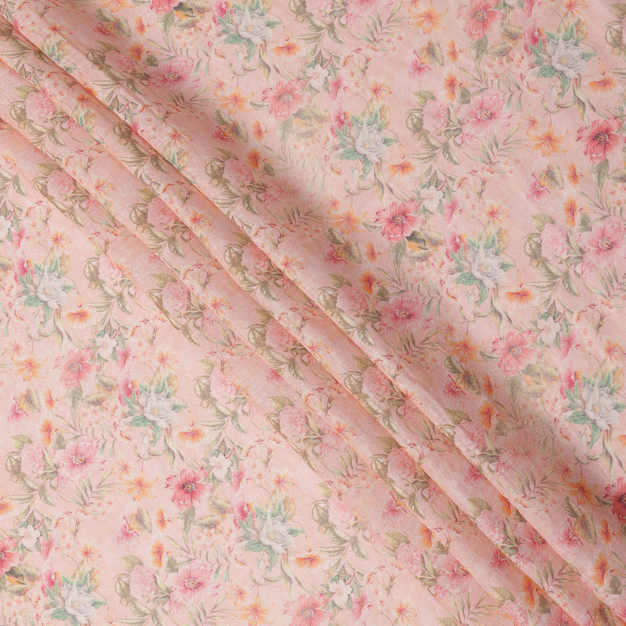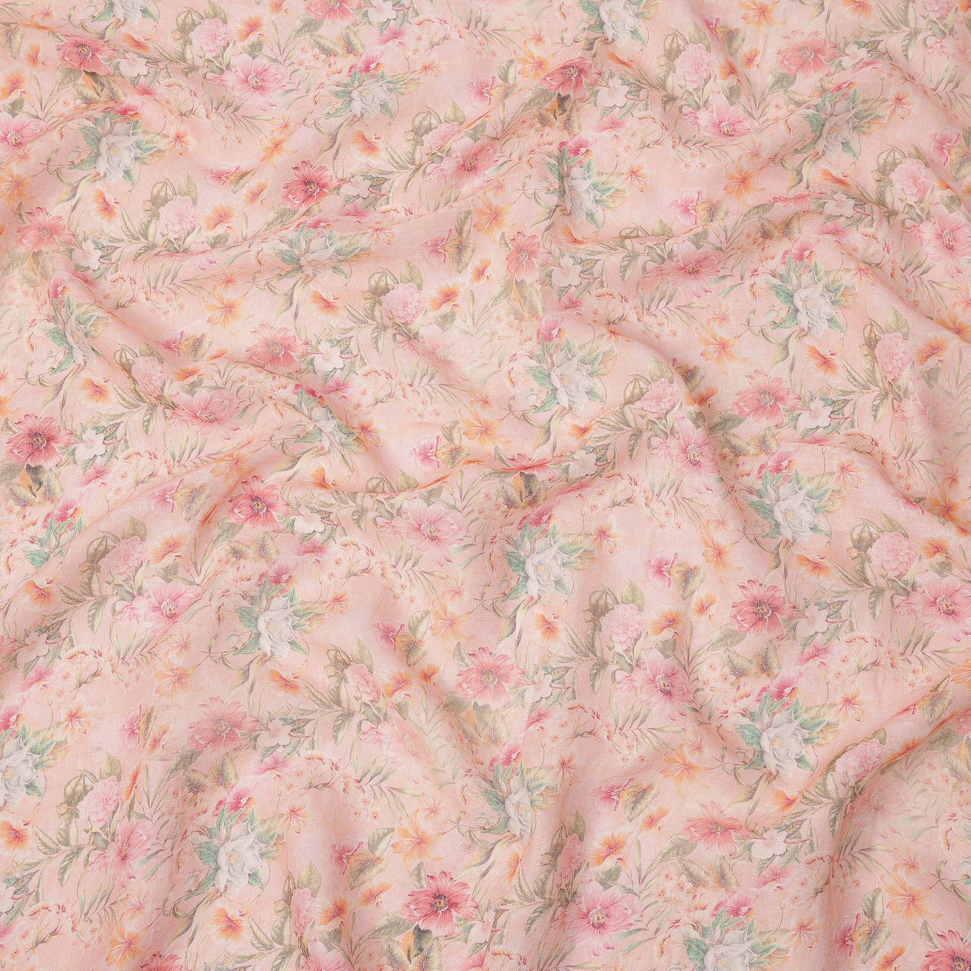 Light Pink Pastel Floral Printed Blended Cotton Linen Fabric, 110 Cms Width, India-D25180