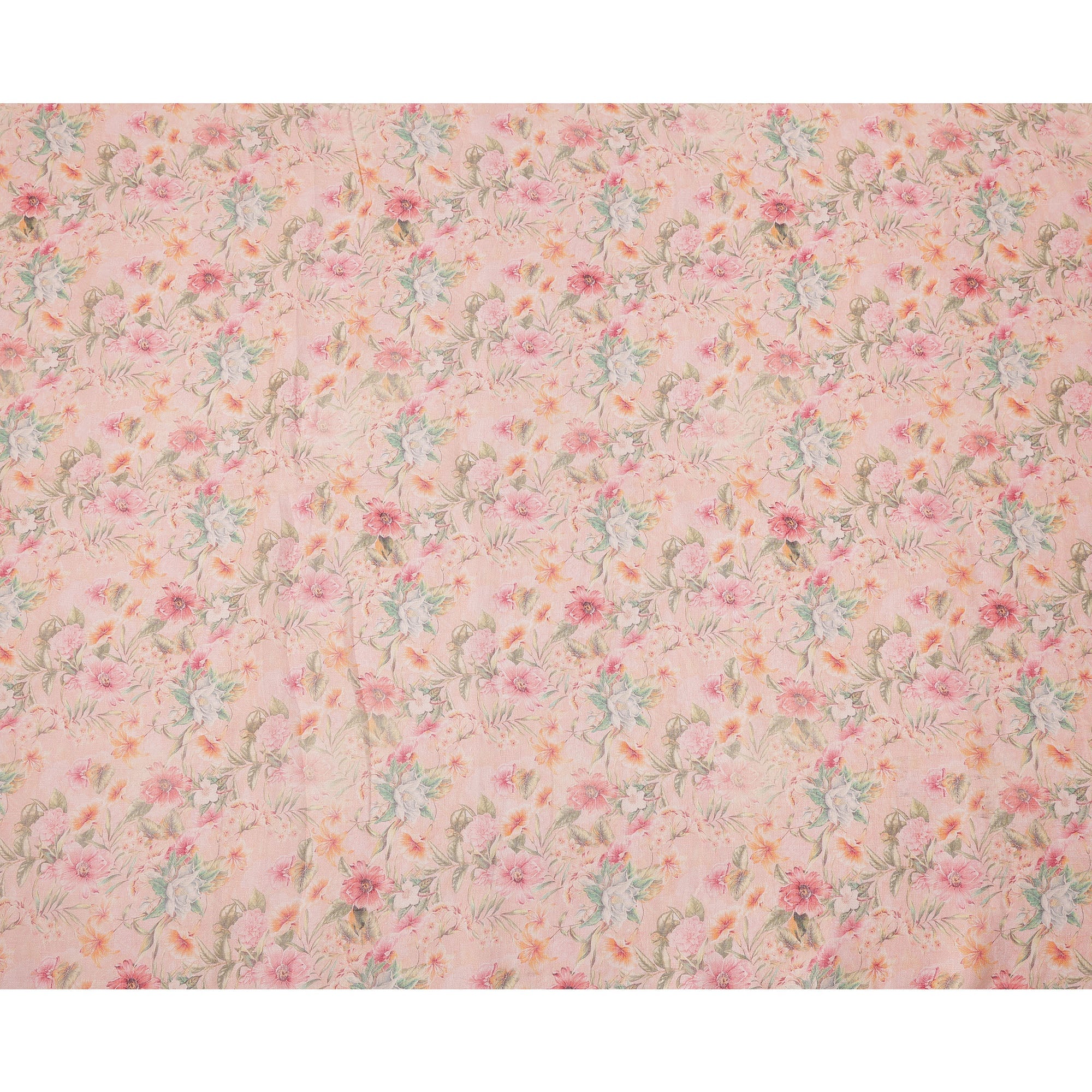 This Light Pink Pastel Floral Printed Blended Cotton Linen Fabric is a graceful and versatile textile that captures the charm of delicate design and premium craftsmanship. The soft pink base is beautifully adorned with pastel floral motifs in shades of peach, green, white, and subtle blue, giving it a refreshing and romantic appeal. Made from a high-quality Blended Cotton-linen blend, this fabric offers the breathability and comfort of Blended Cotton along with the strength and natural sheen of linen, making it an excellent choice for year-round use. With a width of 110 cms, it provides ample fabric for tailoring kurtas, sarees, tunics, dresses, and shirts, while also enhancing interiors with curtains, cushion covers, and table linens. Its lightweight texture and elegant drape make it ideal for summer wear, festive outfits, and stylish home décor projects. Produced in India, renowned for its rich textile tradition, this fabric reflects both artistry and durability. To retain its vibrancy and fine finish, gentle hand washing or dry cleaning is recommended, ensuring long-lasting elegance.