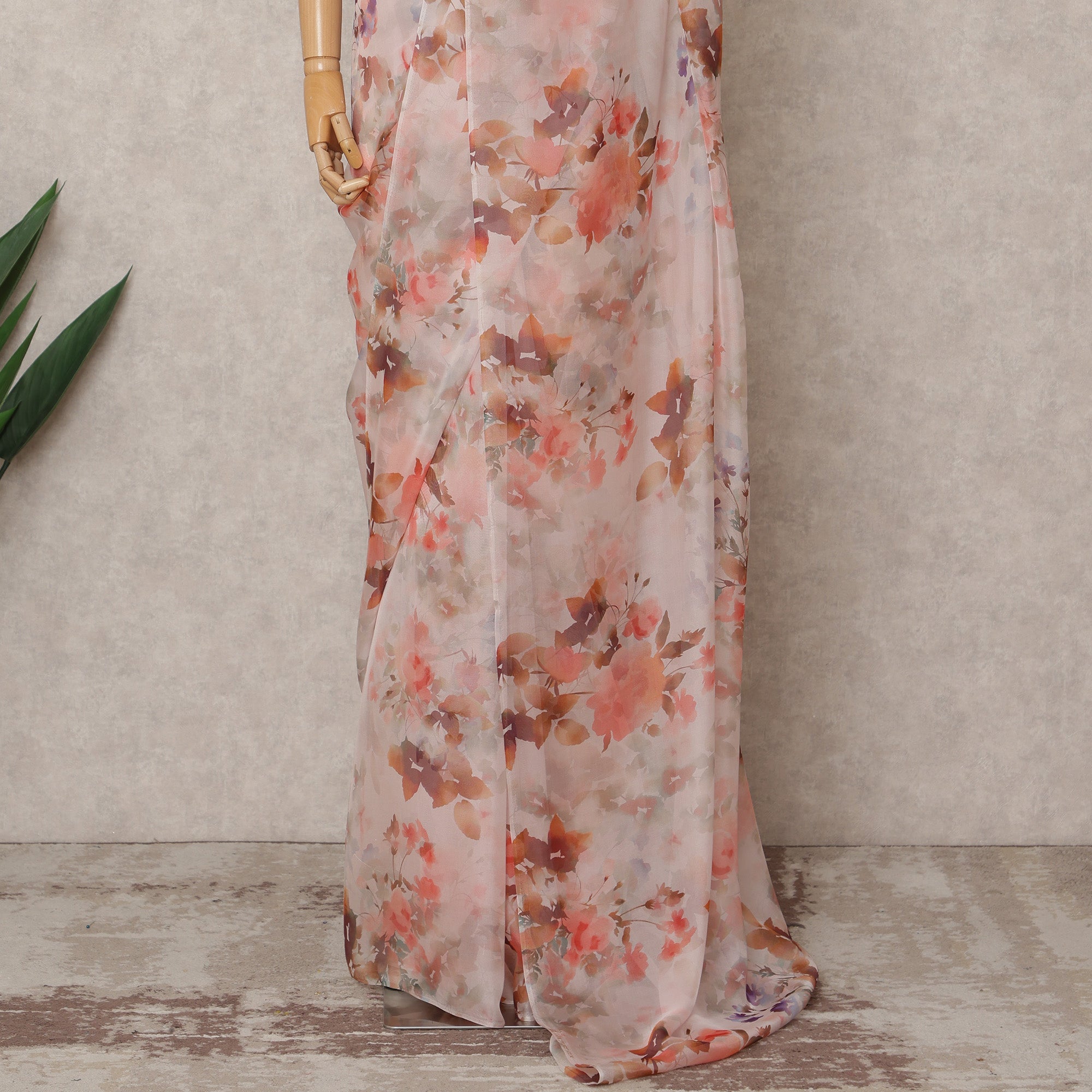 Immerse yourself in understated elegance with this light pink premium pure silk chiffon saree, an exquisite blend of delicate charm and fluid drape. Crafted in India with high-quality silk chiffon, the saree showcases a soft light pink base adorned with blooming floral prints in warm coral, lavender, and earthy brown tones, offering a harmonious play of subtle vibrance. The luxurious chiffon fabric lends a breezy and weightless feel, draping the body effortlessly while ensuring comfort through every occasion. With a generous length of 5.5 meters and a width of 110 centimeters, this saree provides ample room for creative pleating and styling. The sheer silk fabric with a gentle sheen adds an air of refinement, making it a perfect pick for festive gatherings, semi-formal events, or elegant daytime affairs. Pair it with a contrast blouse for a chic, modern look. Blouse piece not included. Dry clean or gently hand wash to preserve its grace and fabric quality.