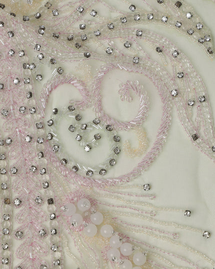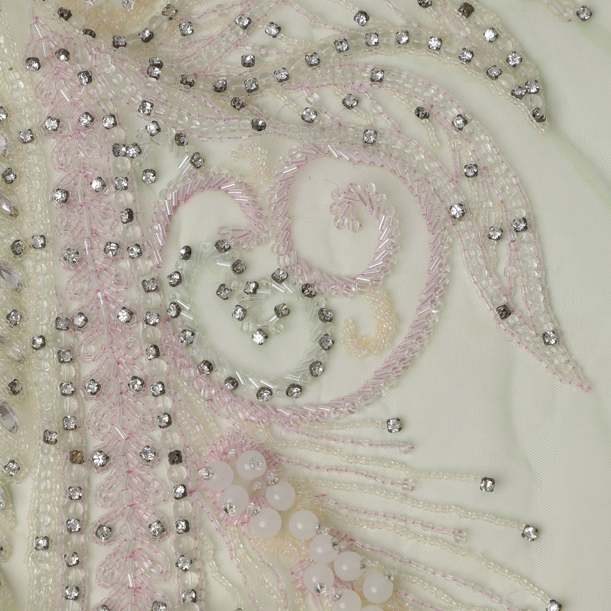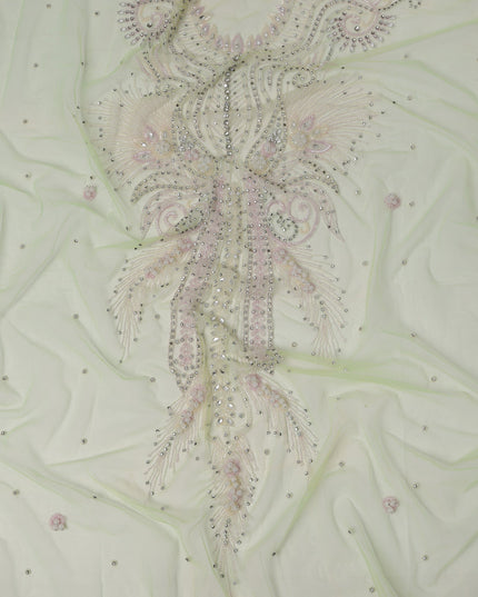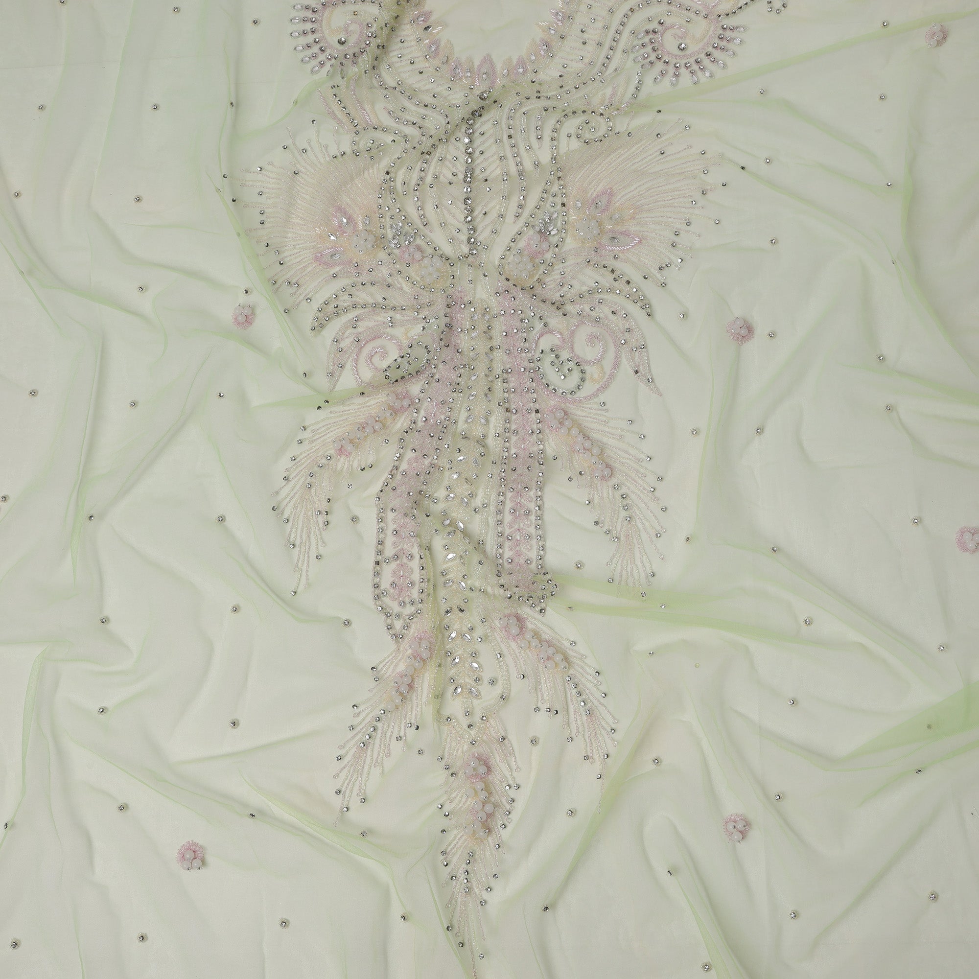 This light pistachio nylon tulle fabric showcases a luxurious blend of shimmer and artistry through pastel multicolor embroidery, sequin detailing, and delicate threadwork. The central cascading motif in soft pinks, ivories, and silver tones is enhanced by scattered miniature floral accents across the sheer tulle base, making it ideal for sophisticated Fustaann dresses or designer couture. With a width of 140 cm and offered in a 3-meter length, this fabric allows for fluid silhouettes and structured ethnic styles alike. Handcrafted in India, the embroidery reflects precision and elegance with a contemporary pastel twist. Whether for bridal events or exclusive occasions, this fabric brings a soft yet radiant expression to designer wardrobes. Buy online to add refined craftsmanship to your ethnic or fusion creations.