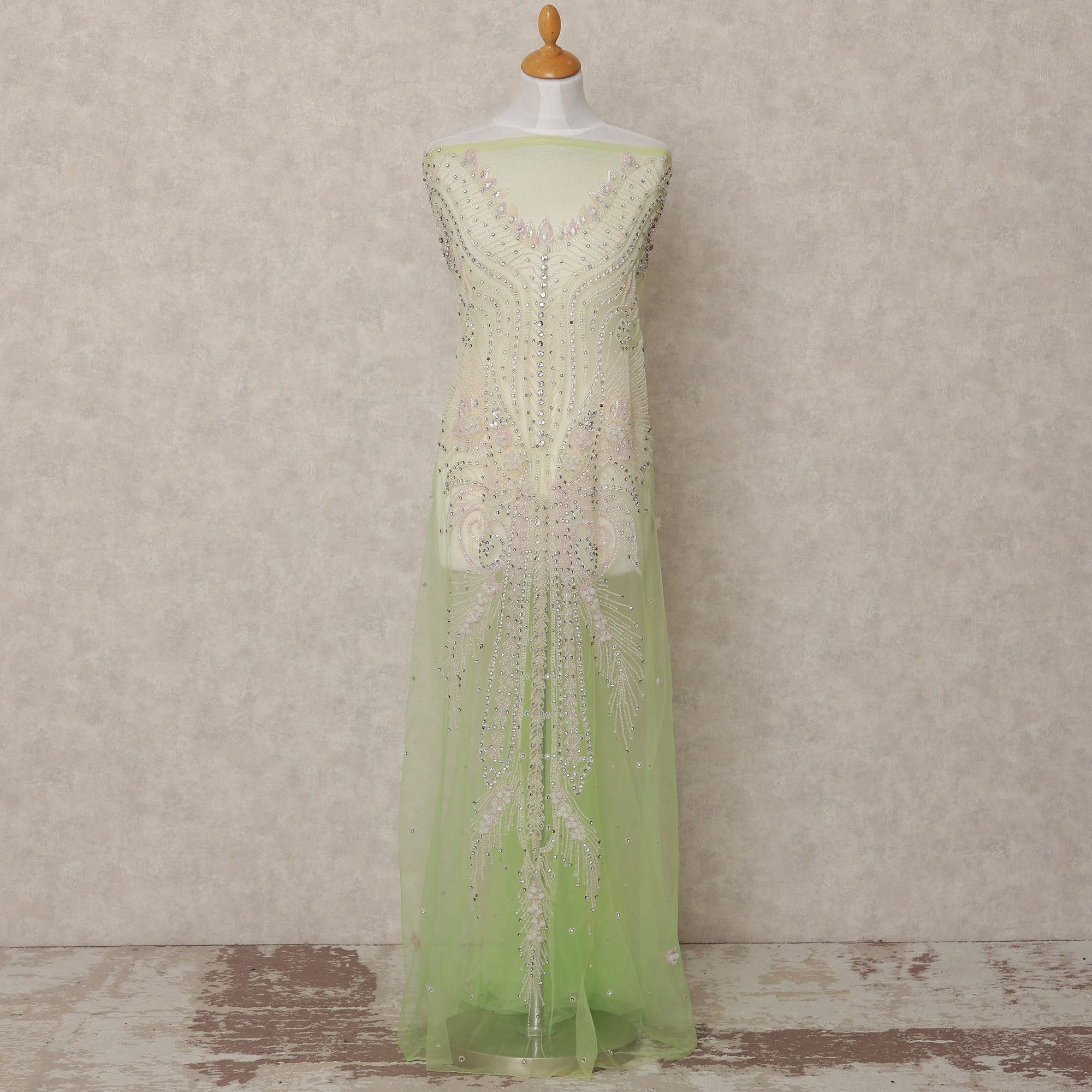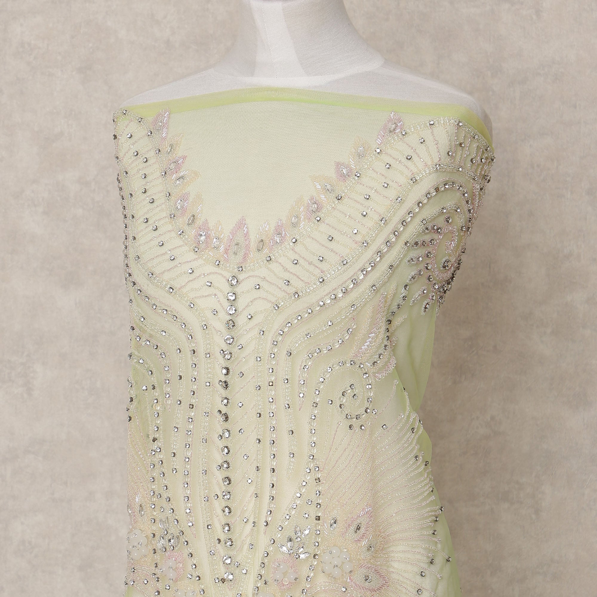 This light pistachio nylon tulle fabric showcases a luxurious blend of shimmer and artistry through pastel multicolor embroidery, sequin detailing,... Read more Read more