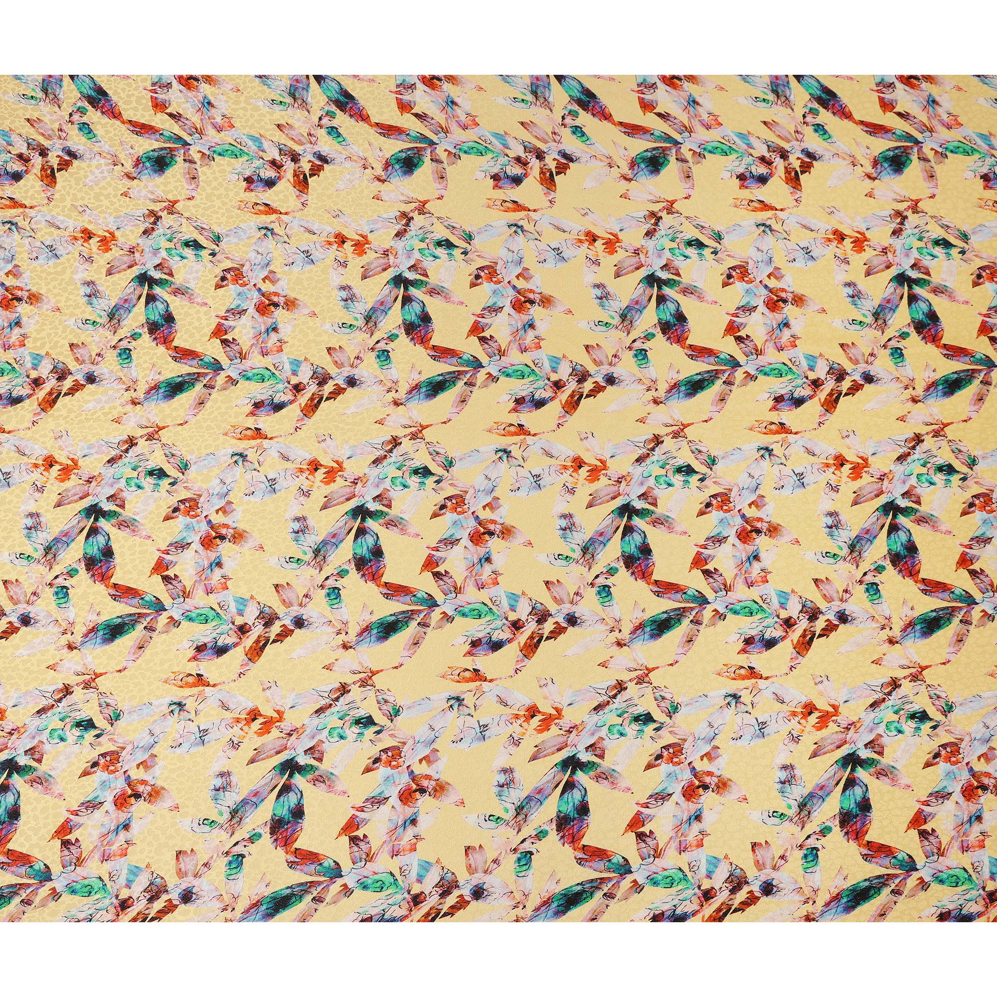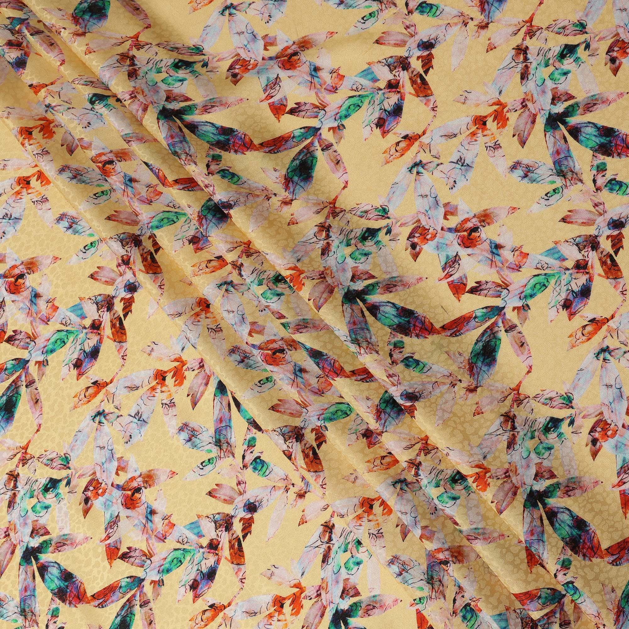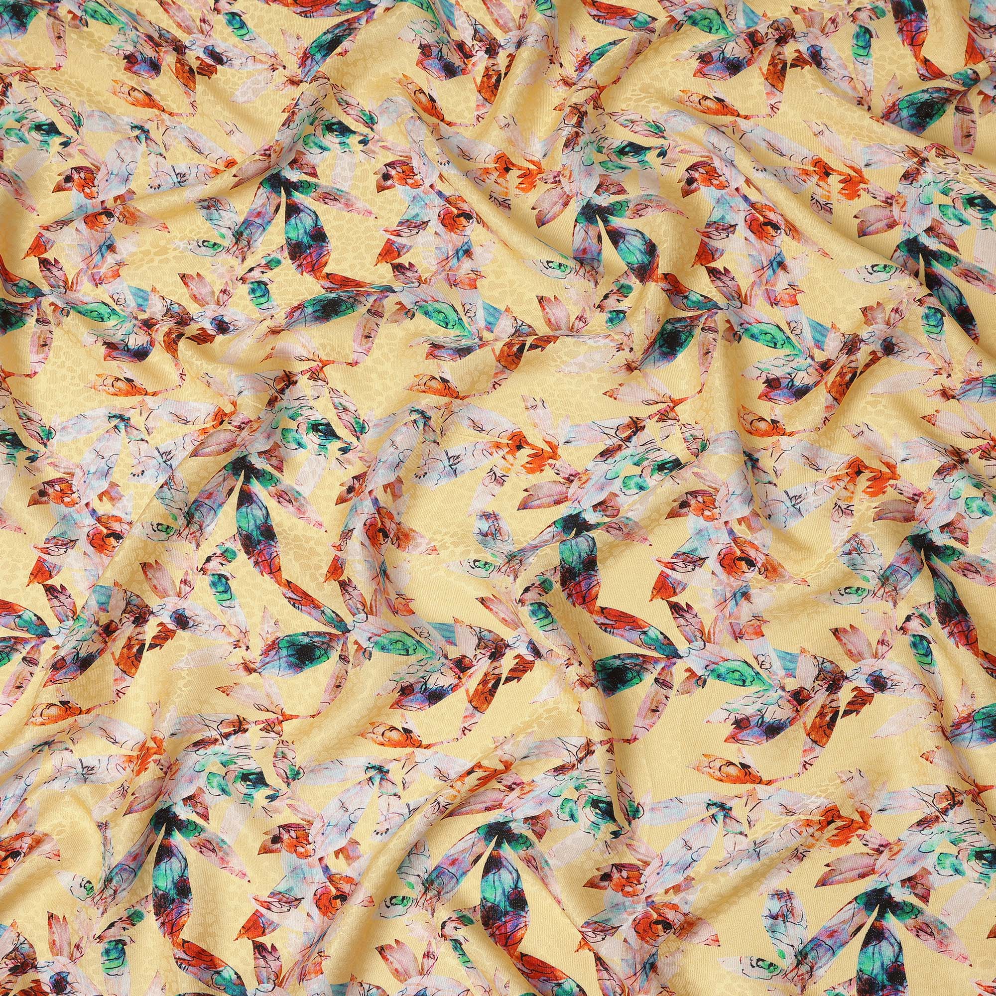 This light yellow abstract printed viscose crepe fabric features a vibrant mix of artistic multicolor motifs in shades of teal, orange, and soft pink beautifully scattered across a warm pastel yellow base. Crafted in 110 cms width, the crepe weave offers a smooth, fluid texture with an elegant drape that moves gracefully, making it ideal for dresses, kurtis, tops, tunics, and coordinated outfits. The lightweight viscose composition ensures breathable comfort and a soft feel against the skin for all day wear. Perfect for designers, boutiques, and sewing enthusiasts, this fabric blends contemporary artistic charm with practical versatility for creating standout fashion pieces effortlessly.