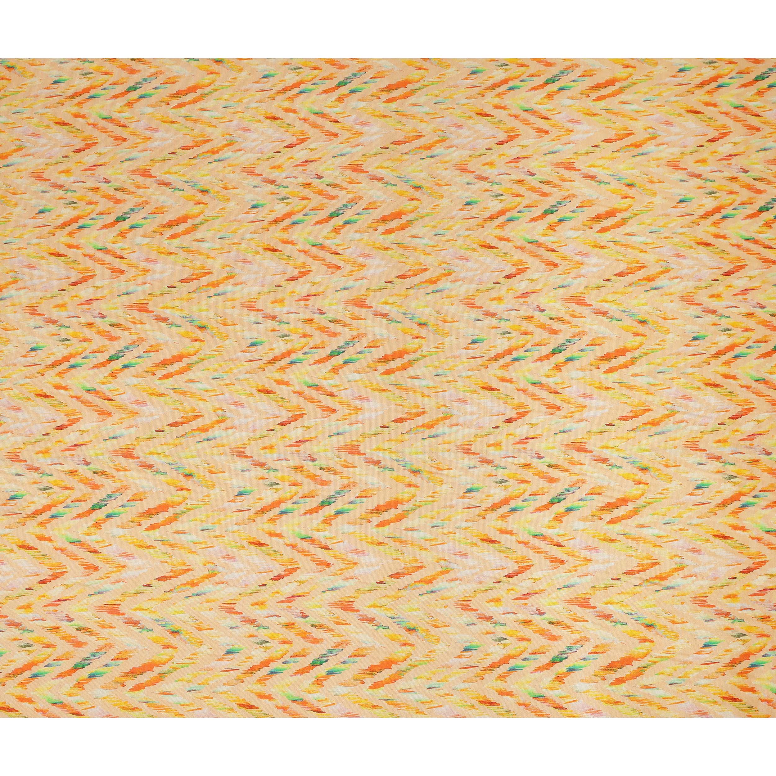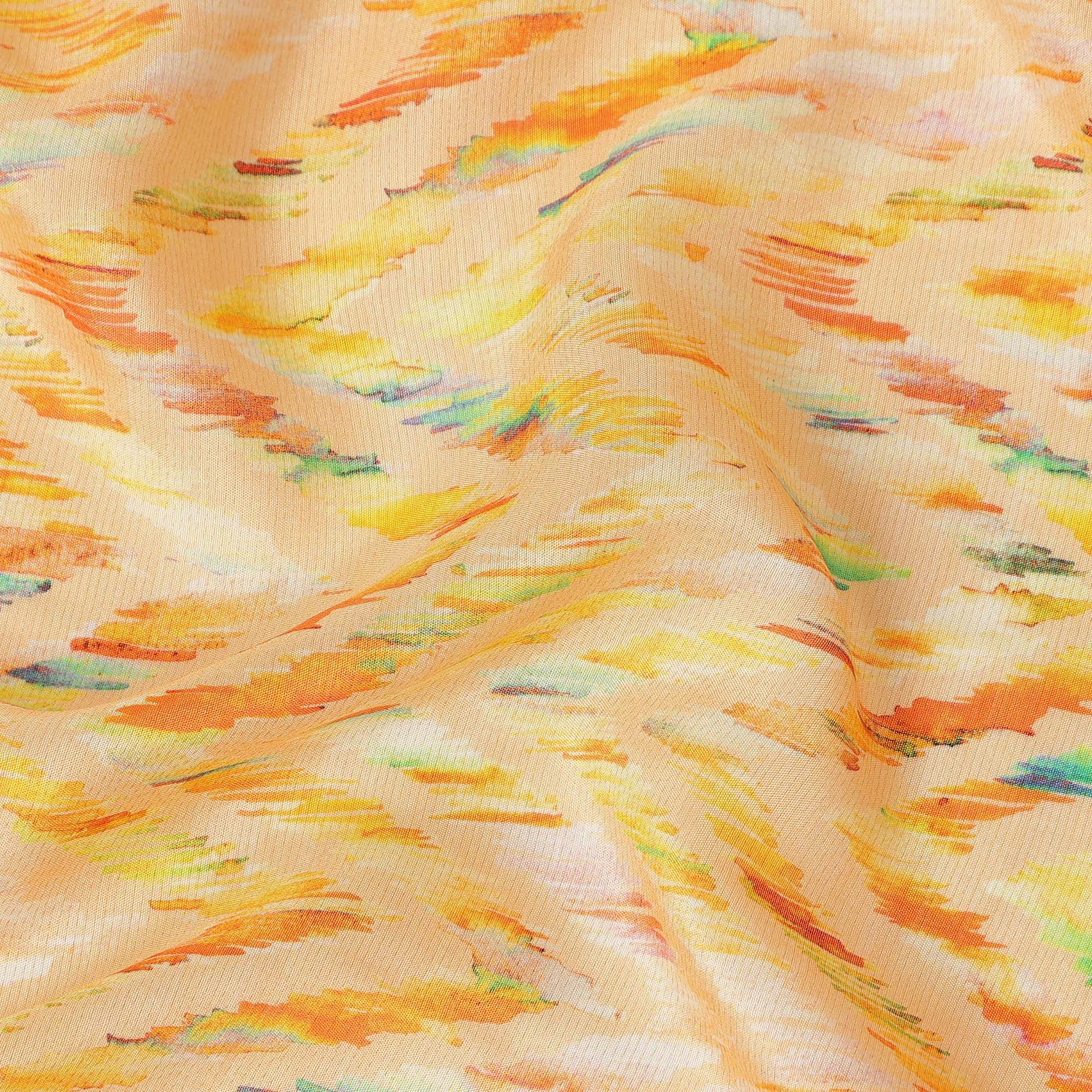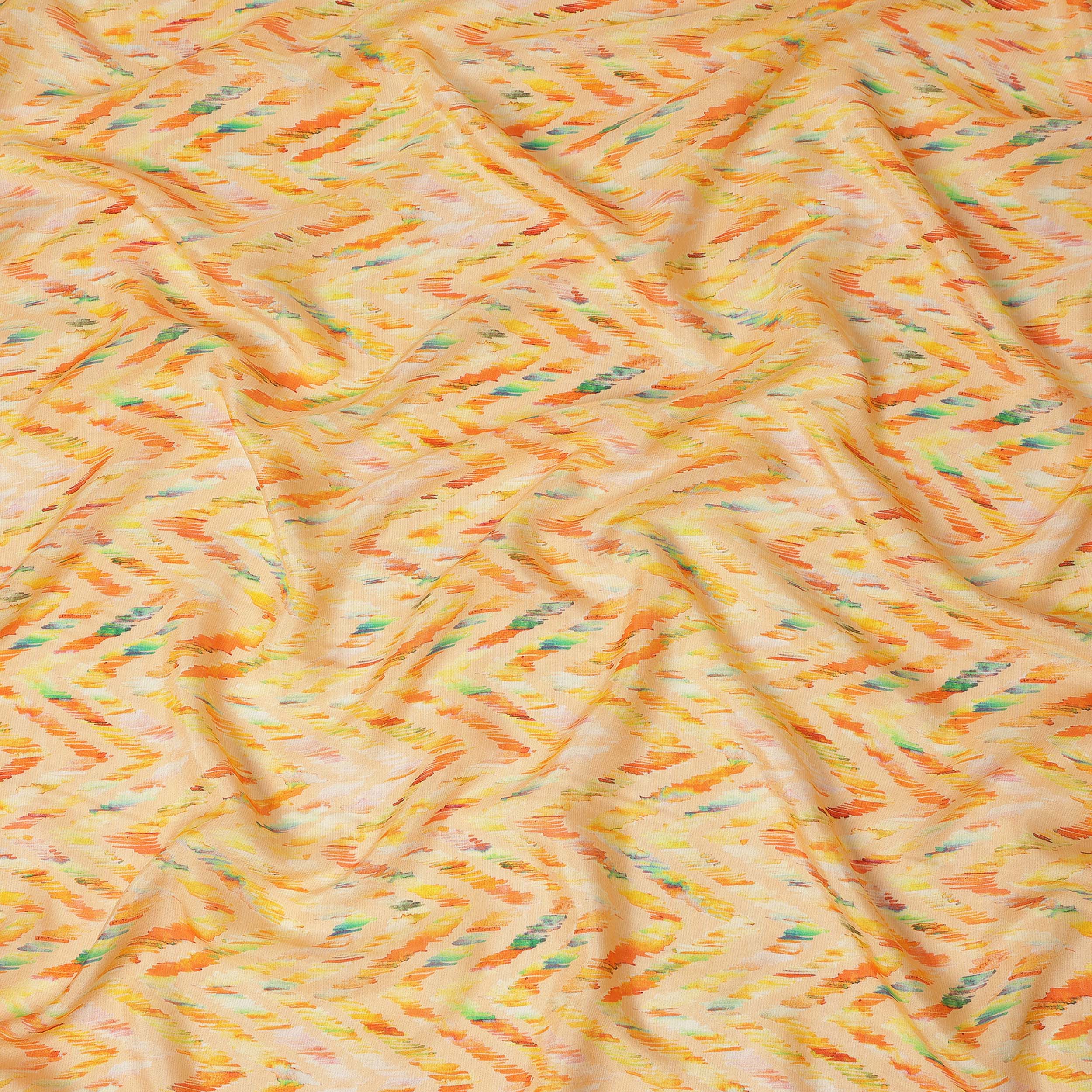 This light yellow chevron printed viscose modal satin fabric features a vibrant multicolor zigzag ikat inspired pattern gracefully layered across a soft light yellow base. Accented with lively tones of orange, green, and subtle coral, the design creates a fresh and energetic visual appeal while maintaining a refined balance. Crafted from premium viscose modal satin, the fabric offers a silky smooth texture with a gentle satin sheen that enhances its elegant finish. Lightweight and breathable, it ensures comfortable all day wear and delivers a fluid, graceful drape that flatters dresses, blouses, skirts, co ord sets, and scarves. With a width of 110 cms, it provides versatile flexibility for creative tailoring and designer collections. Ideal for festive looks and chic everyday outfits, this fabric beautifully combines softness, color vibrancy, and contemporary style.
