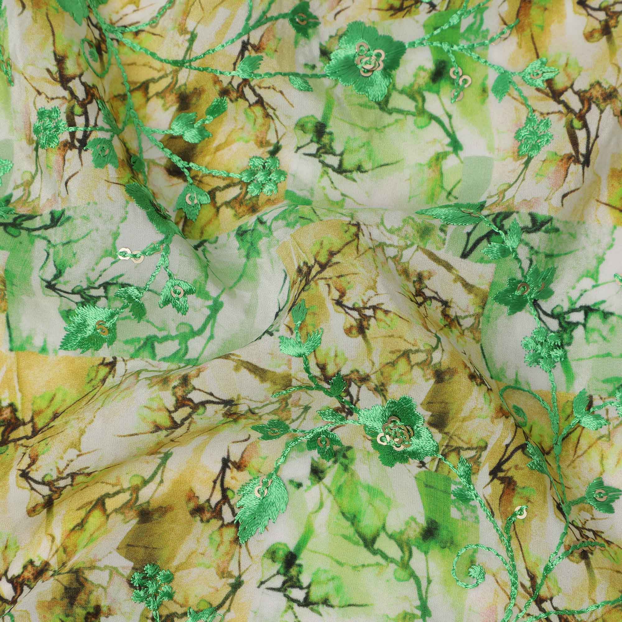 Refreshingly vibrant and effortlessly elegant, this lime green and yellow abstract floral digital print viscose crepe fabric brings a lively... Read more Read more