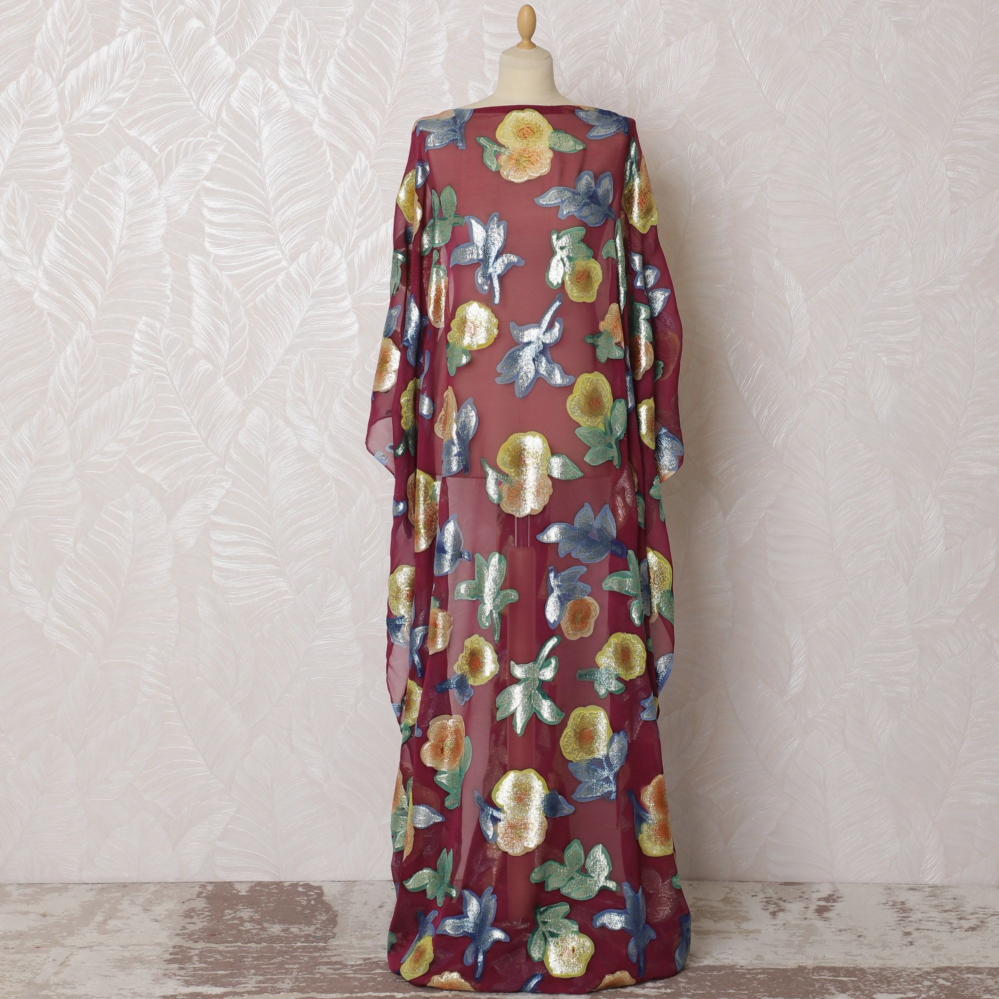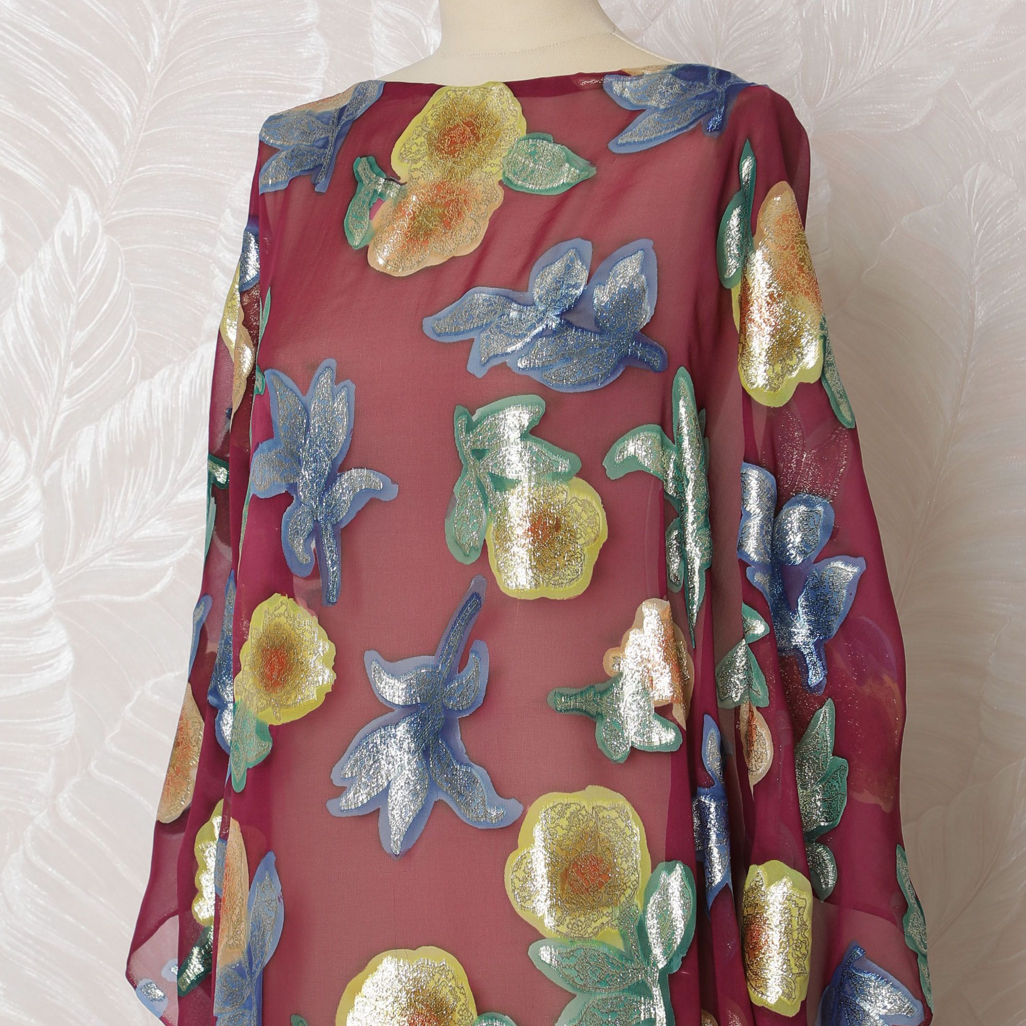 Elegant burgundy silk chiffon with golden metallic floral lurex accents.