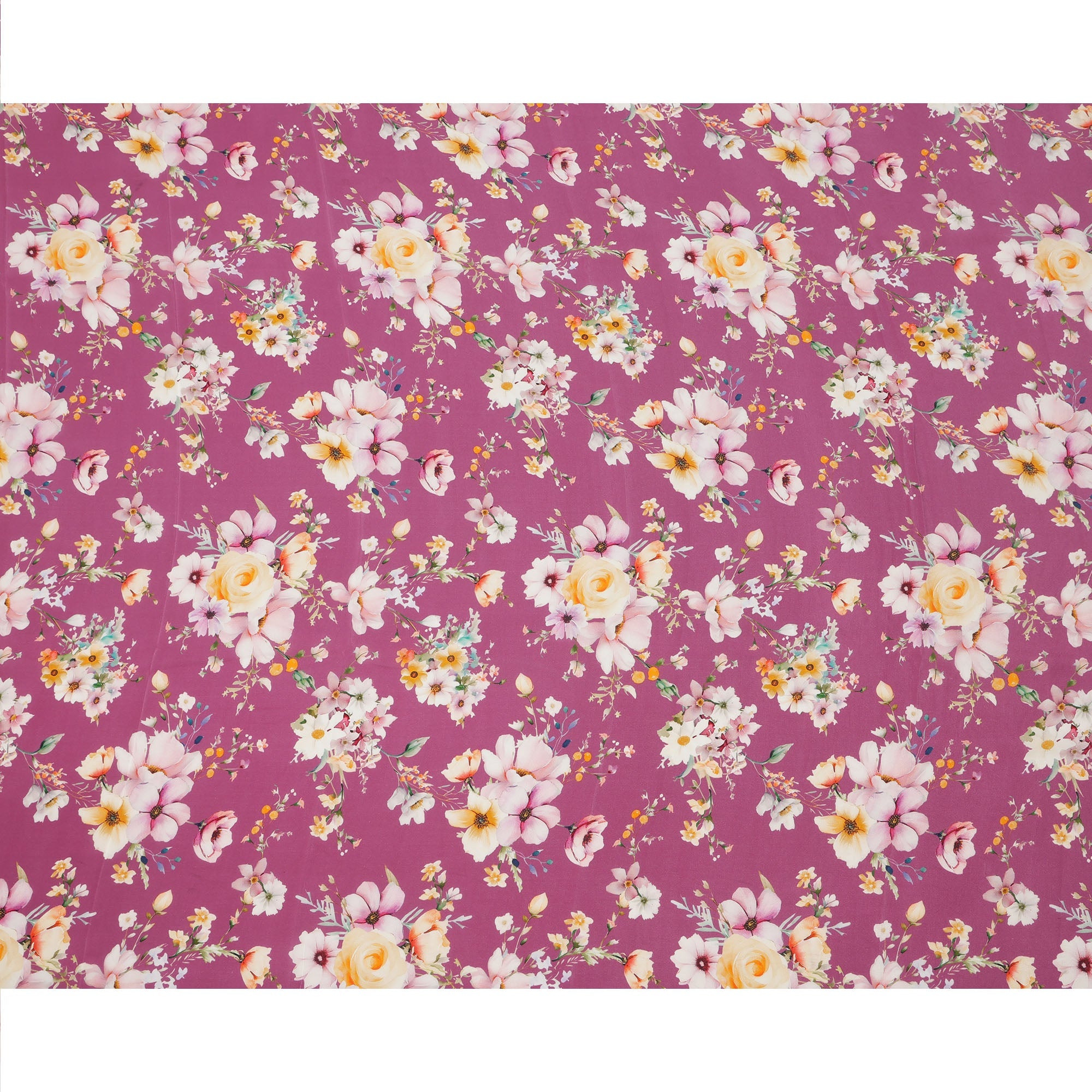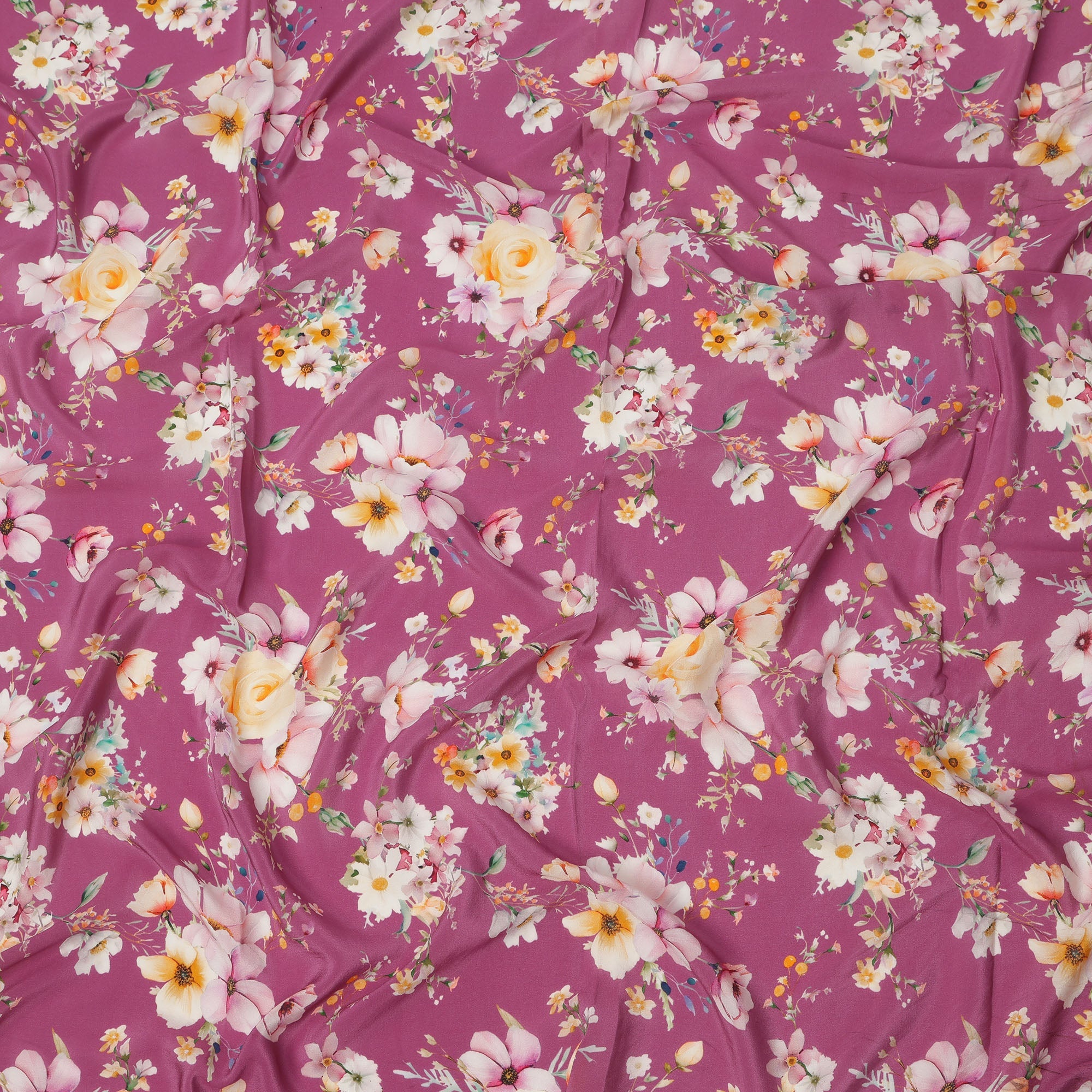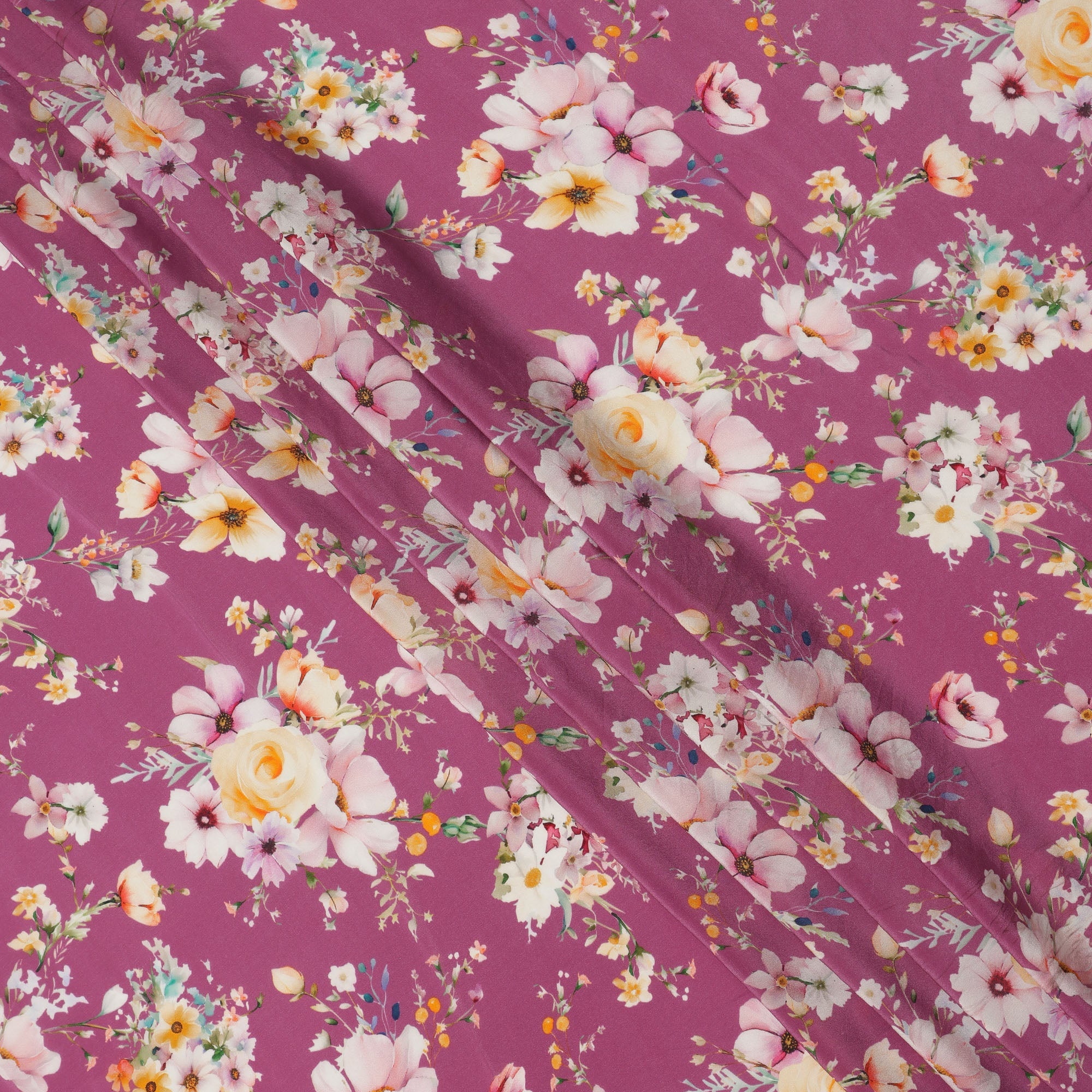 Magenta Base Multicolor Bloom Floral Printed Pure Silk Crepe Fabric, 110 Cms Width, Made in India-D23959