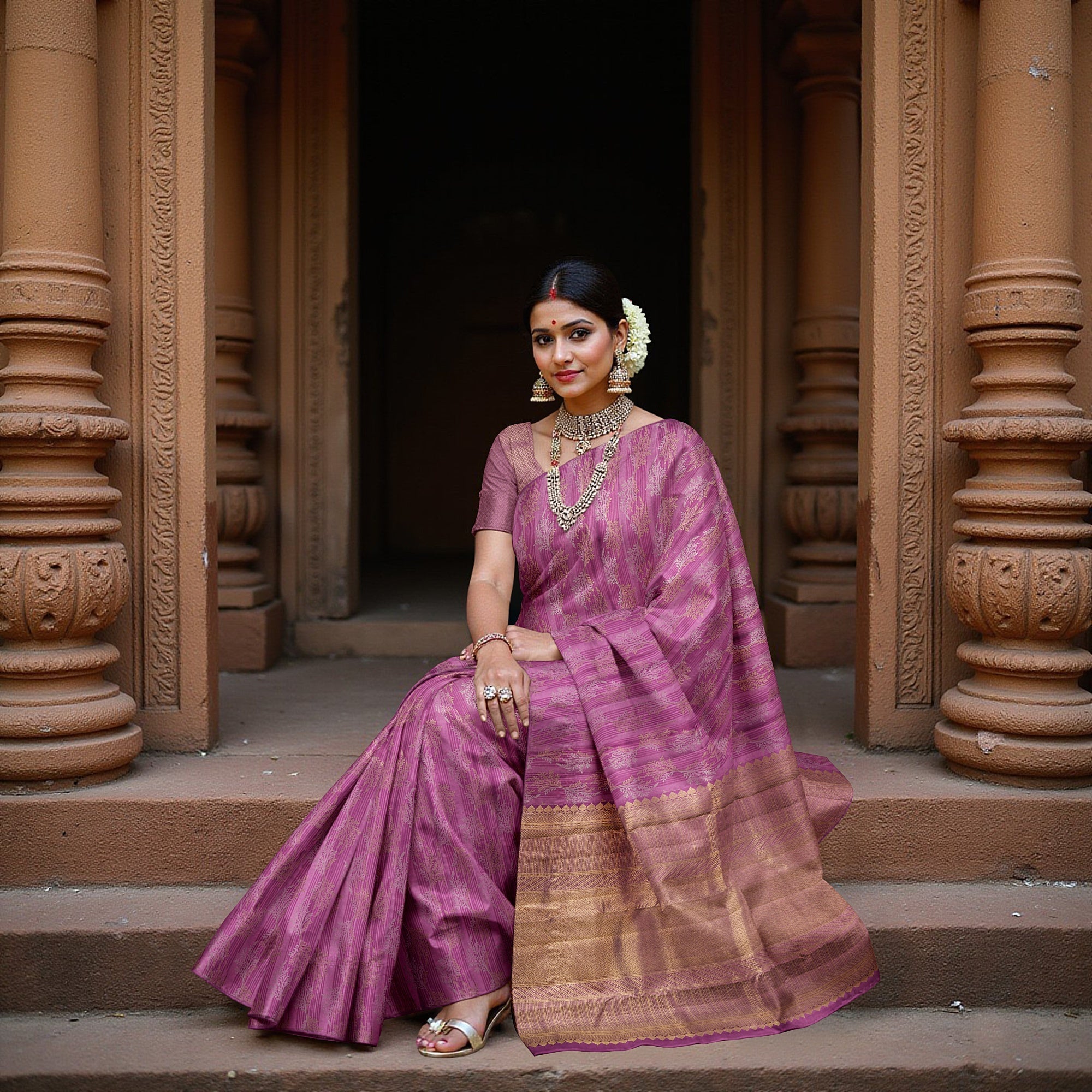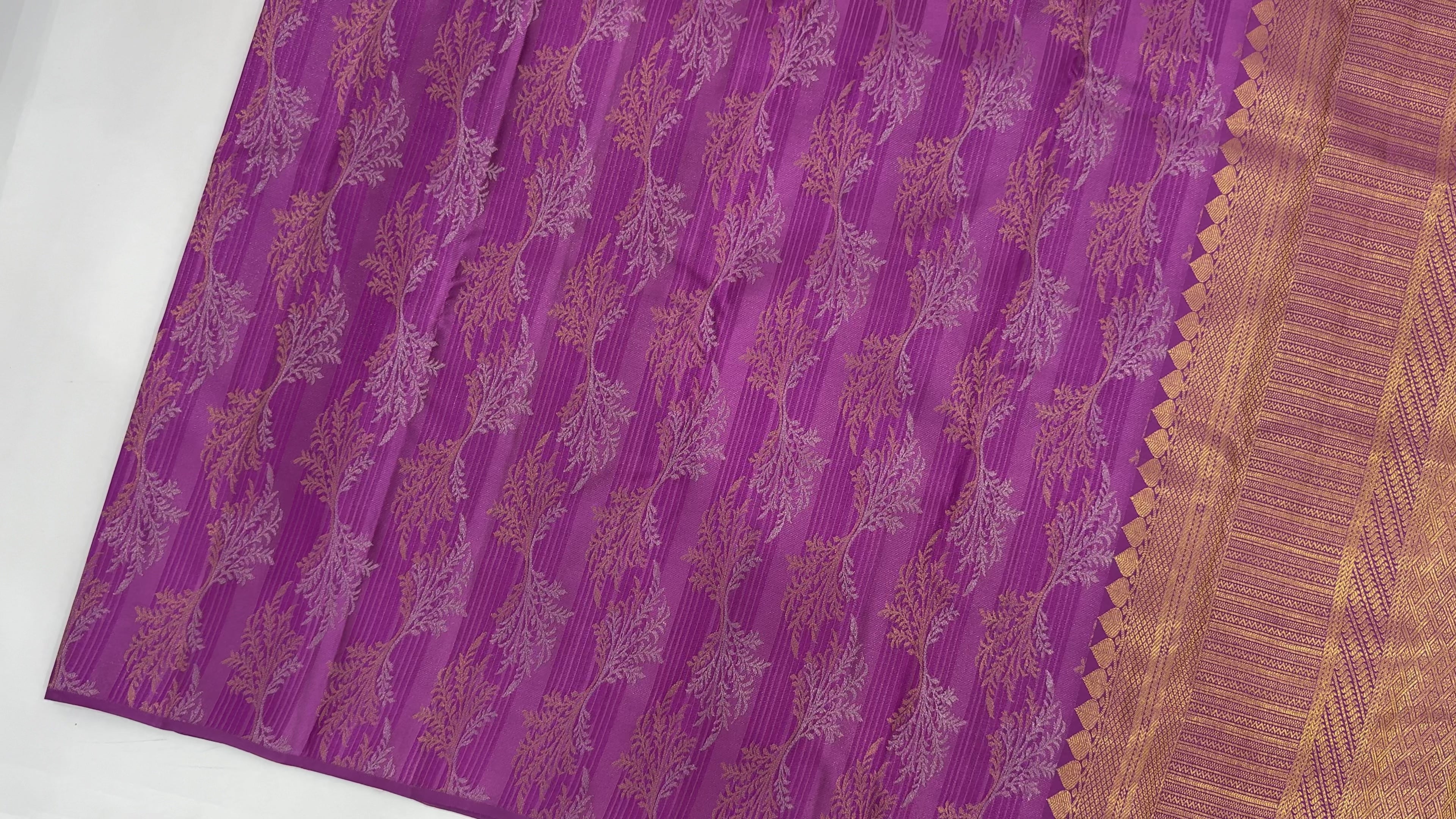 Magenta body with horizontal zari motifs offers classic elegance.