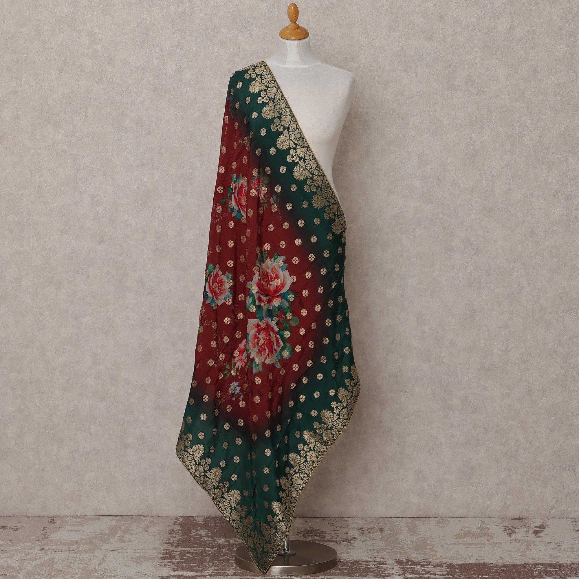 This maroon and green floral design synthetic brocade dupatta with golden polka and ornate border is a timeless accessory that blends rich colors with intricate artistry. The dupatta features a stunning maroon base gradually transitioning into green, highlighted with bold floral prints in shades of pink and teal, creating a vibrant yet elegant statement. Accentuated with golden polka motifs spread across the fabric, it adds a subtle shimmer that enhances its festive charm. The ornate golden border with delicate patterns frames the dupatta beautifully, adding a regal finish. Crafted from premium-quality synthetic brocade, the fabric is lightweight, durable, and drapes effortlessly, making it comfortable for all-day wear. With its versatile size of 210X90 cms, this dupatta can be styled in multiple ways with lehengas, salwar suits, or sarees, making it an ideal pick for weddings, festivals, and grand celebrations. Designed in India, it reflects a perfect balance of tradition and modernity.