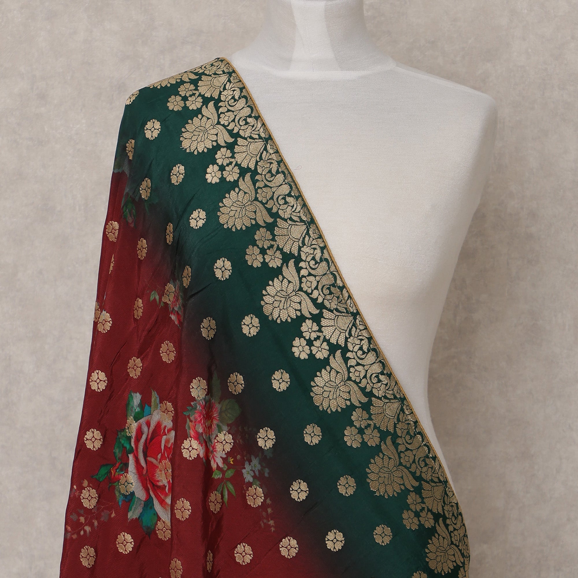 Maroon and Green Floral Design Synthetic Brocade Dupatta with Golden Polka and Ornate Border, Size 210X90 Cms, India-D24855