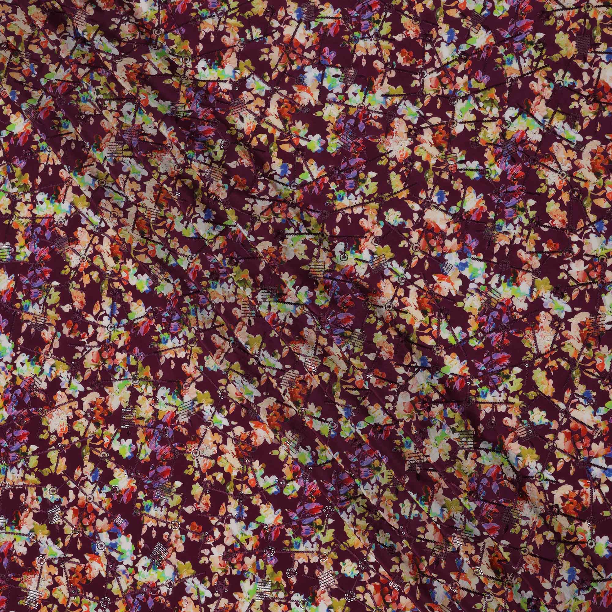 This maroon base viscose crepe fabric is beautifully enhanced with a digital print of multicolor abstract florals and scattered leaf... Read more Read more