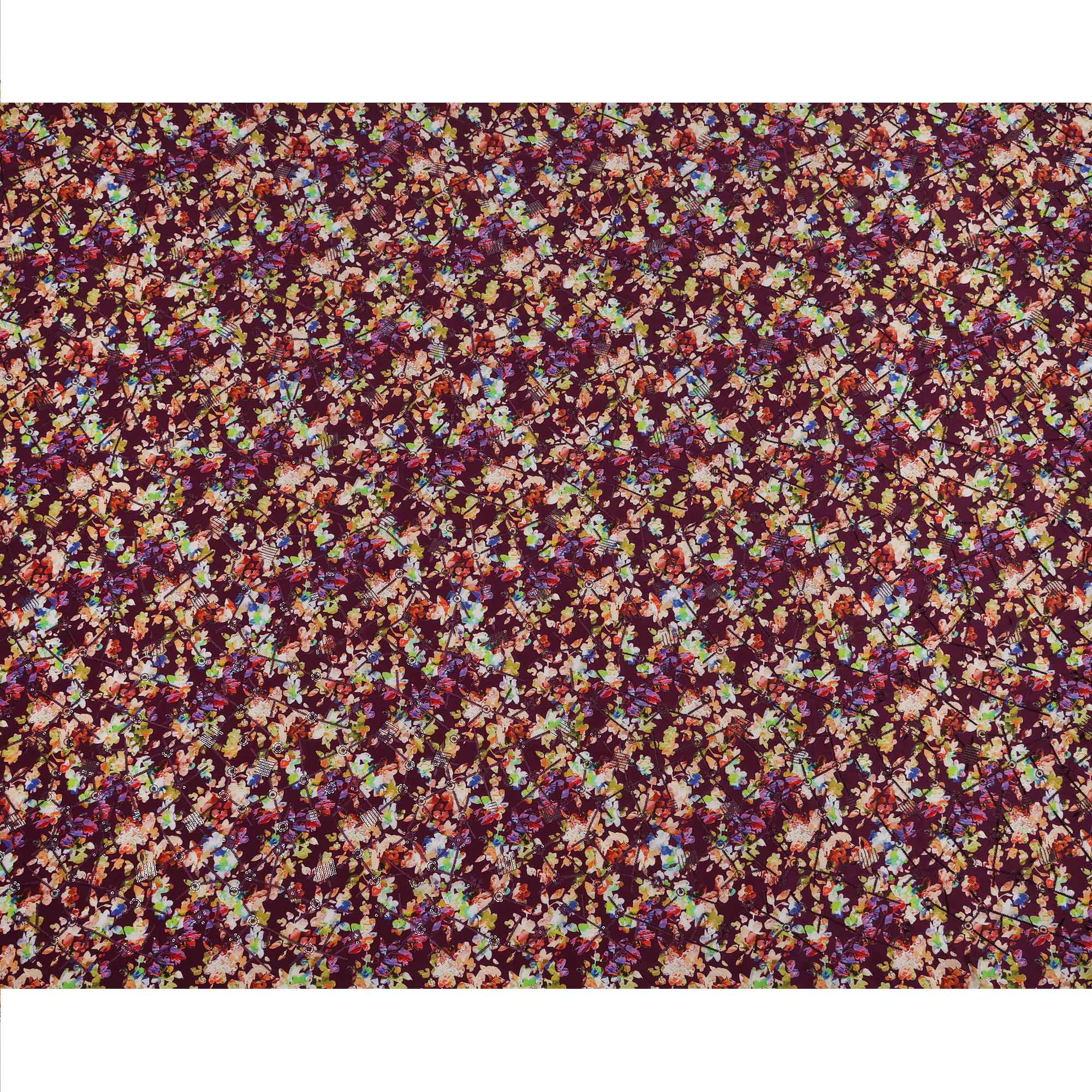 Maroon Base Multicolor Abstract Floral Digital Print Viscose Crepe Fabric, 110 Cms Width, Made in India-D23615