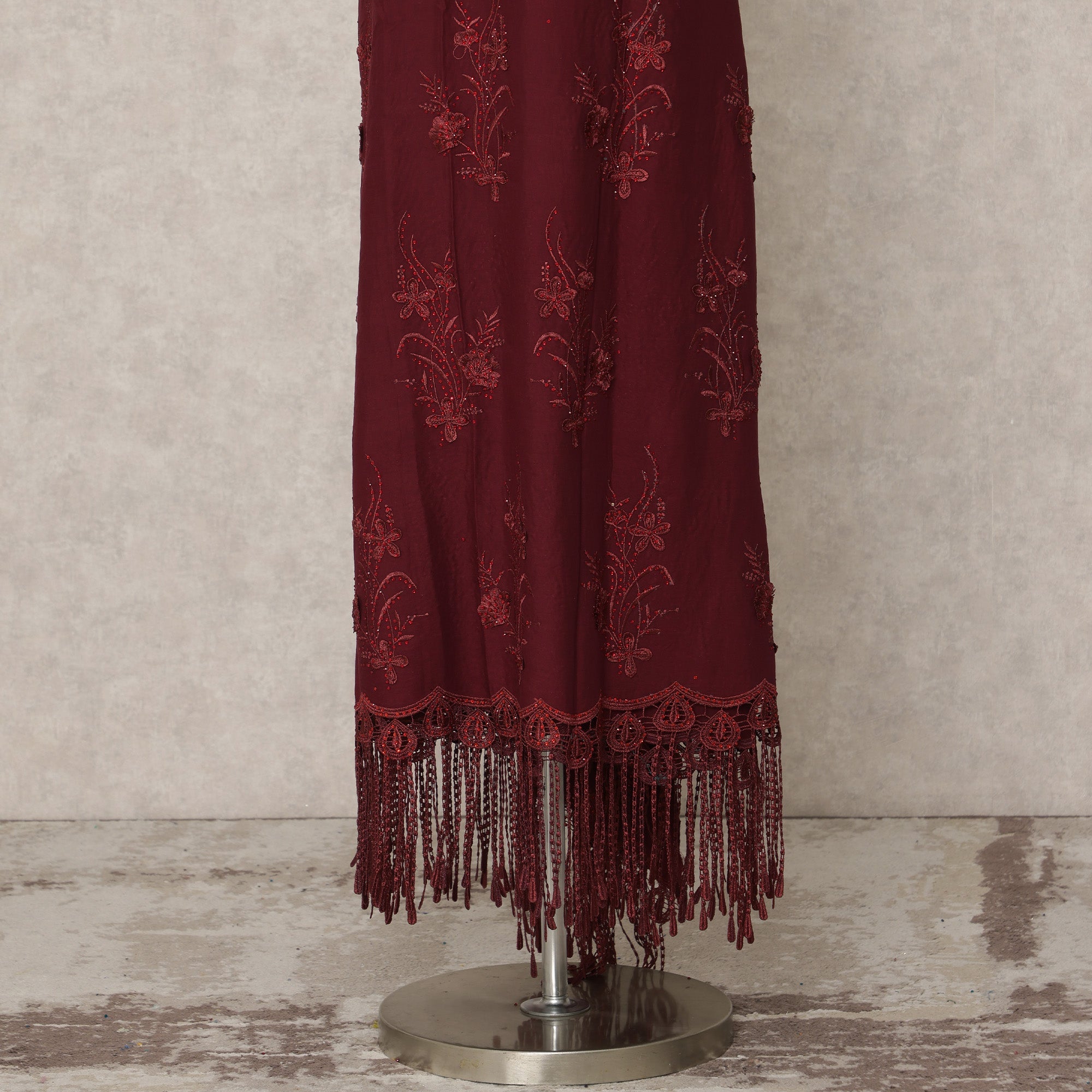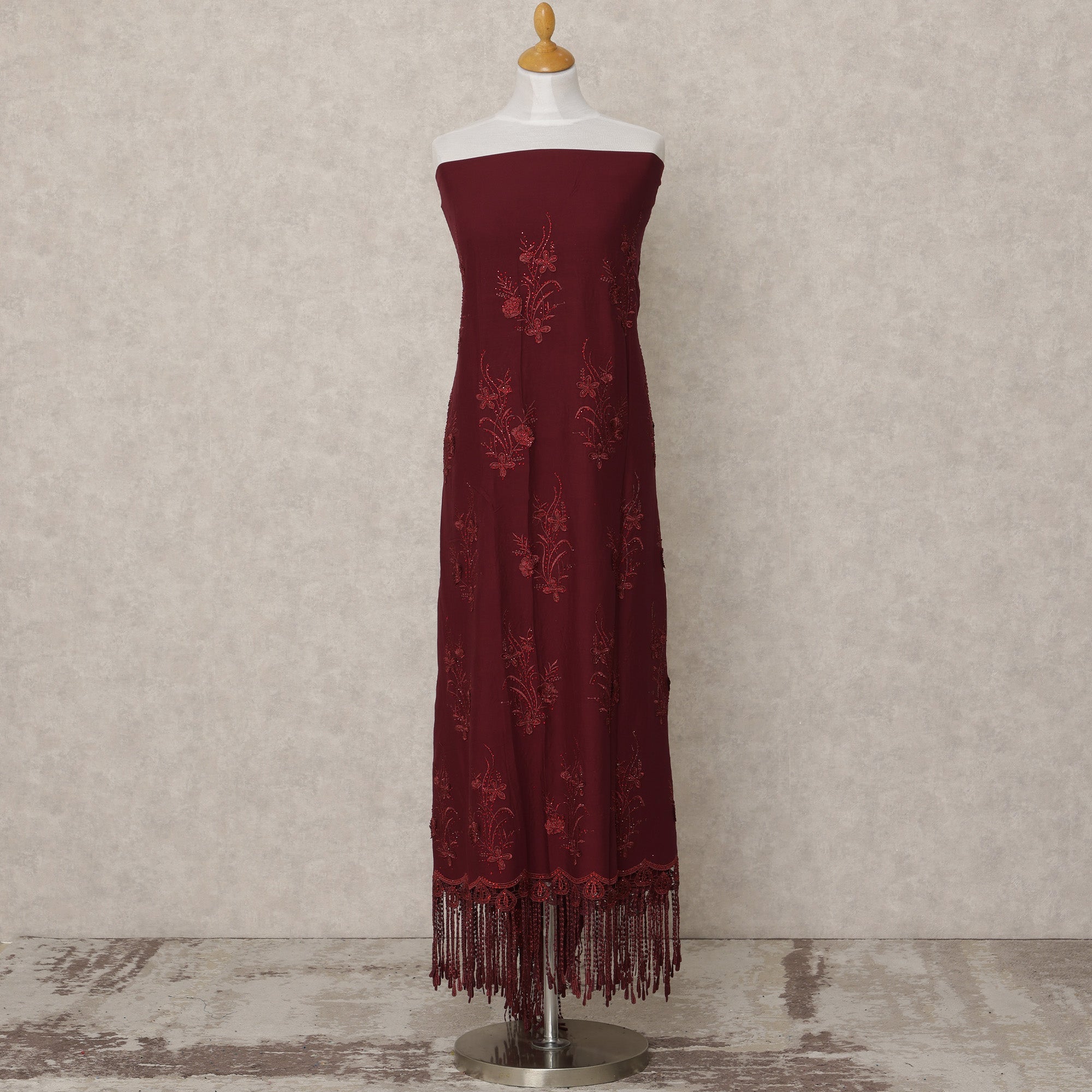 Rich maroon base with intricate tone-on-tone floral thread embroidery