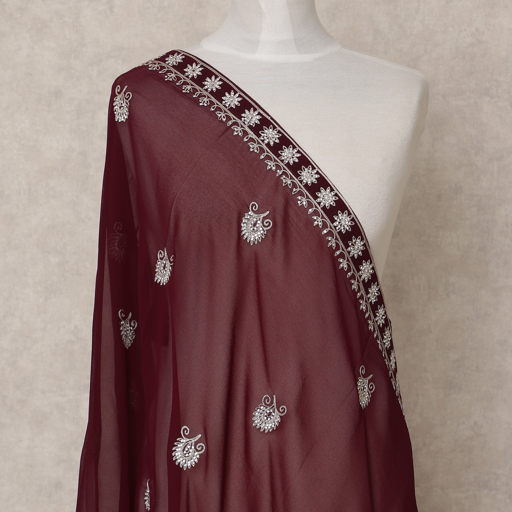 Premium Chiffon Dupatta featuring silver floral embroidery on maroon base