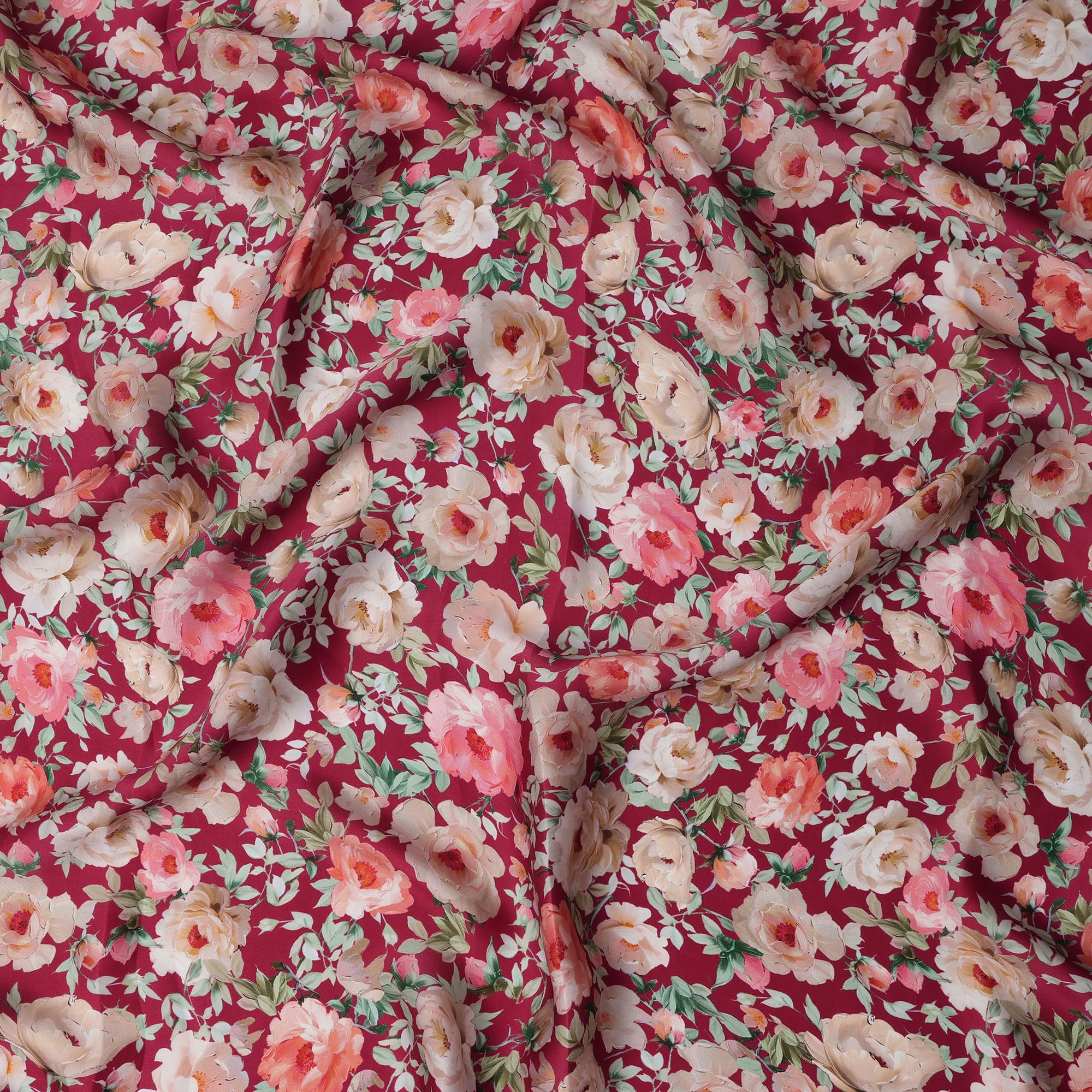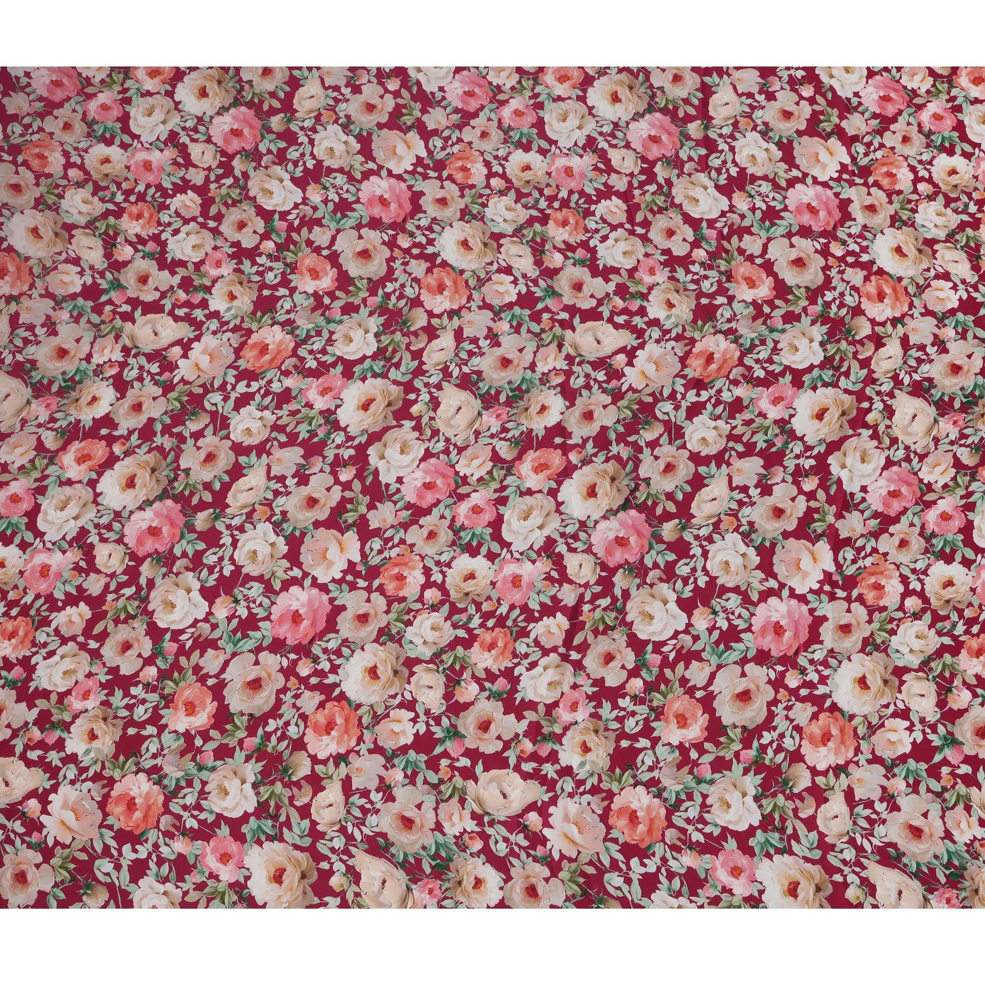 Unveil elegance with this Maroon Floral Printed Synthetic Modal Satin Fabric, adorned with lush rose motifs in soft cream, blush, and coral hues, crafted in India for vibrant fashion and décor applications. The rich maroon base adds warmth and drama, while the digitally printed floral design infuses romantic charm and visual depth. Made from high-quality synthetic modal satin, this fabric delivers a smooth, silky finish with a soft hand feel and fluid drape that enhances both structured and flowing silhouettes. With a width of 110 cms, it is ideal for creating feminine dresses, blouses, scarves, and decorative accents. The print holds color beautifully, making it perfect for special occasion wear and stylish interiors. Lightweight, wrinkle-resistant, and easy to handle, it combines aesthetic appeal with practicality. Buy online now to transform your creations with luxurious maroon florals and refined satin sheen. Shop online to explore timeless floral elegance.