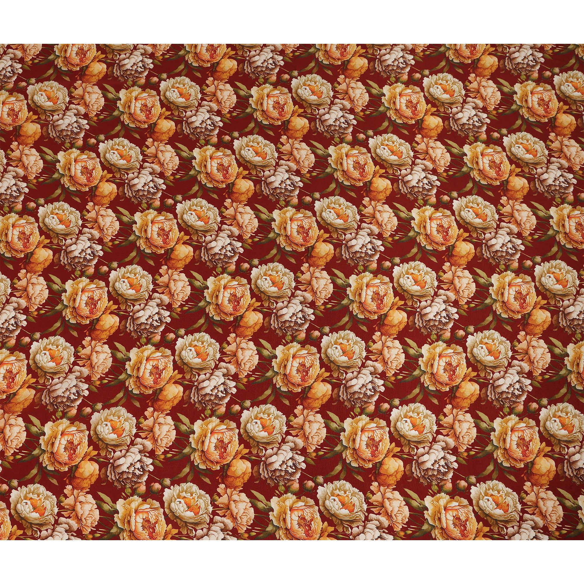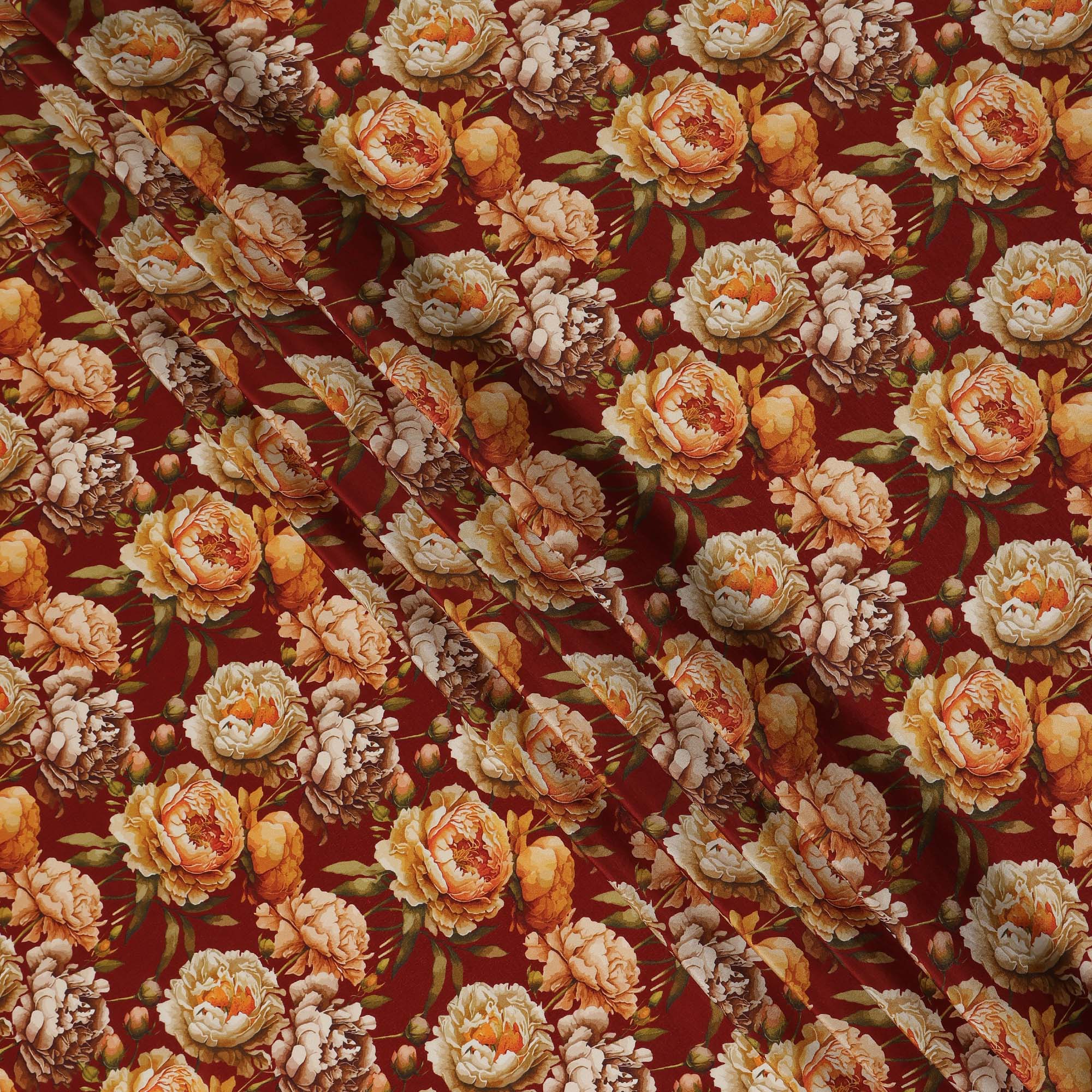 This maroon floral printed viscose crepe fabric features a rich and elegant deep maroon base highlighted with detailed blooming floral... Read more Read more