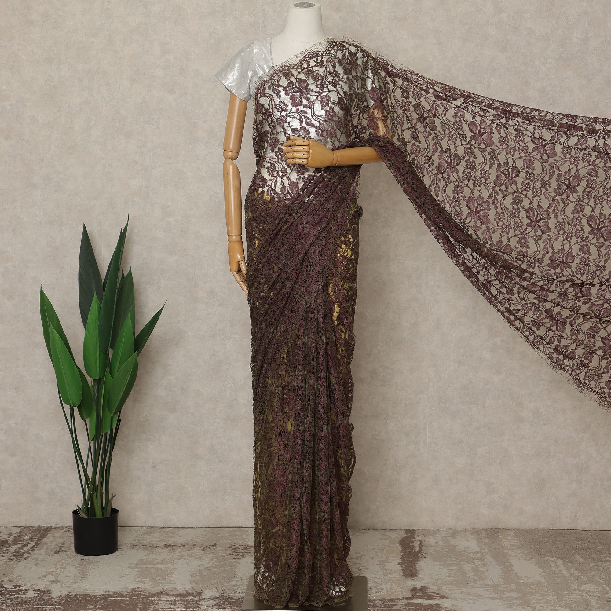 This Maroon-Green Premium French 2 Tone Chantilly Saree Lace is a luxurious fusion of deep maroon lace enriched with shimmering gold undertones, creating an opulent two-tone effect that highlights the intricate floral motifs and delicate transparency characteristic of authentic French Chantilly craftsmanship; crafted in France with exceptional finesse, this approximately 5.5-meter saree lace drapes gracefully with a soft, lightweight fall that enhances its couture appeal, making it ideal for high-end sarees, bridal ensembles, evening wear, and designer occasion outfits, offering both refined elegance and lasting quality—blouse not included.