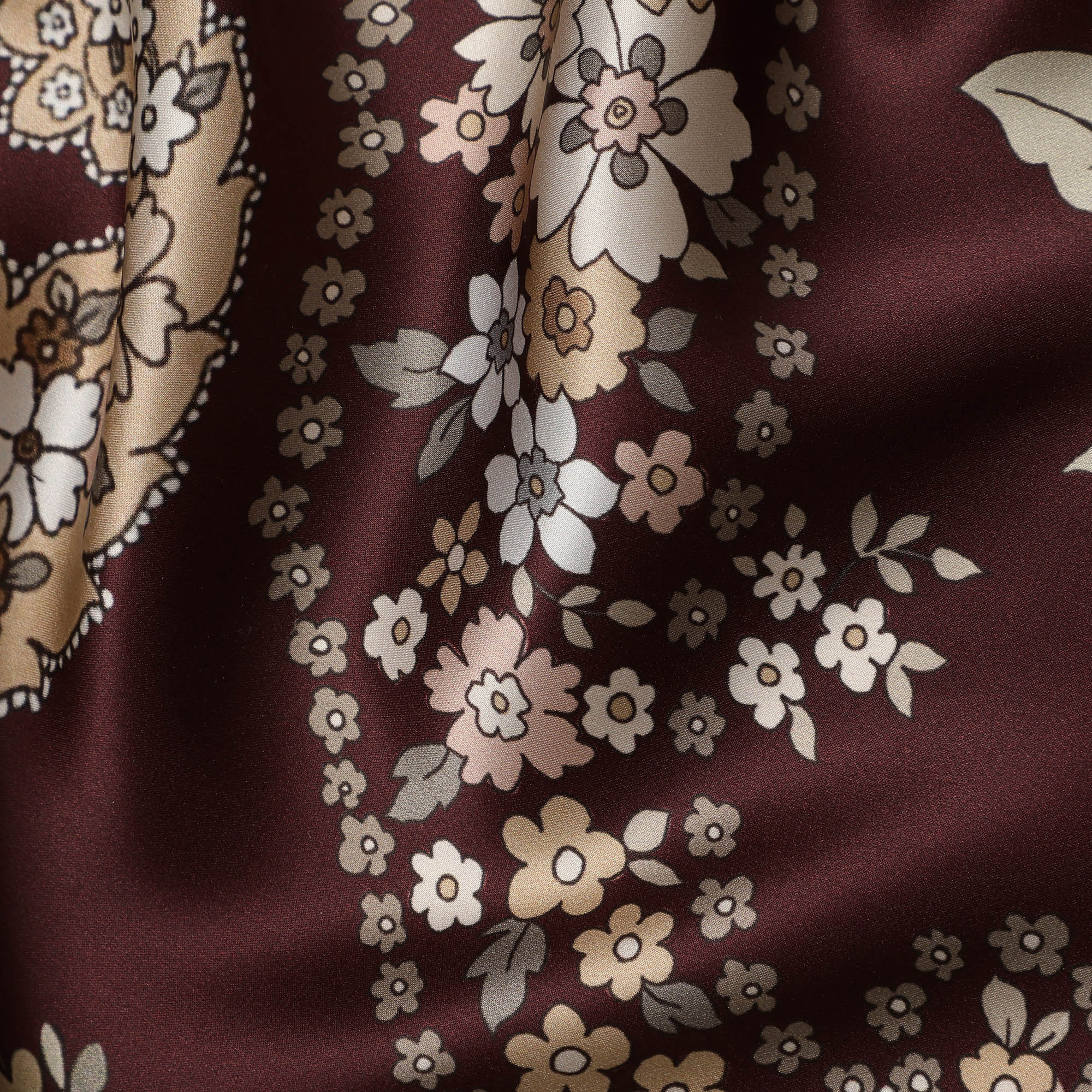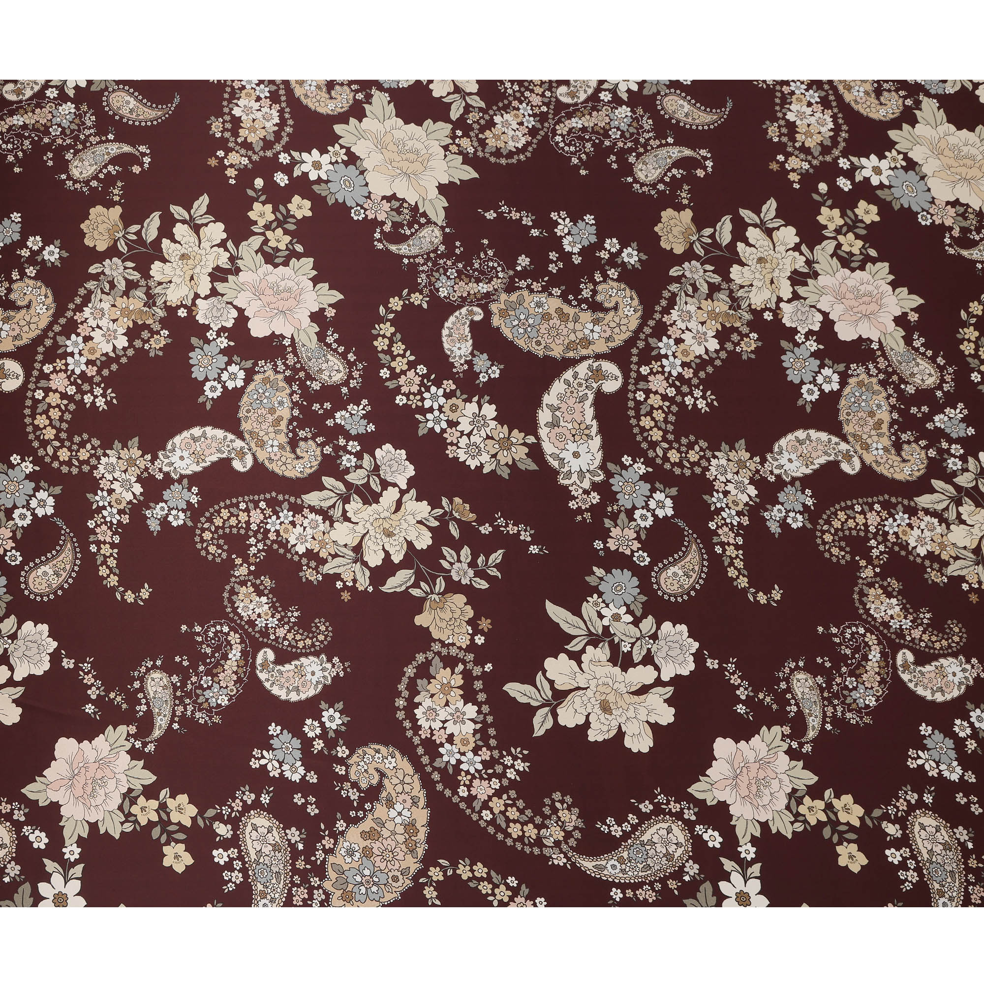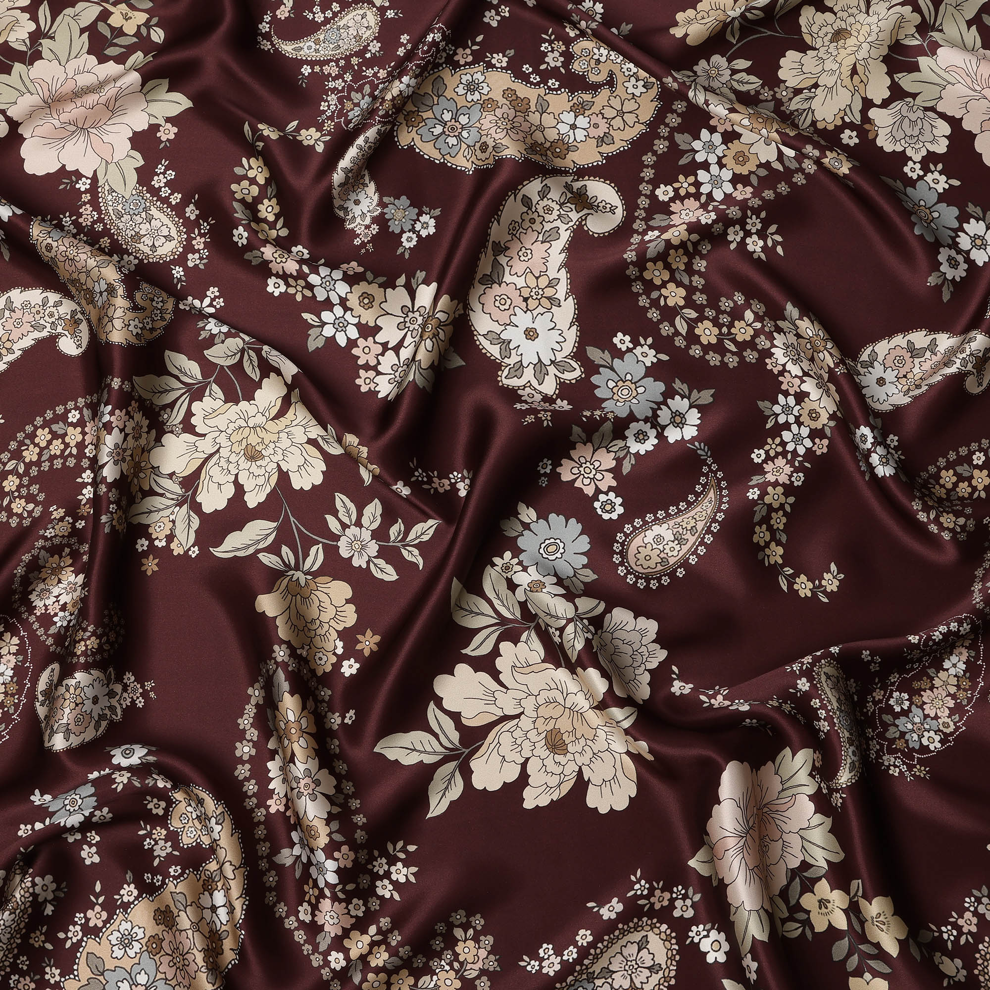 Maroon Multicolor Floral Paisley Print Premium Pure Silk Satin Fabric, 110 cm Width, Intricate Designer Pattern, Origin: South Korea-D26814
