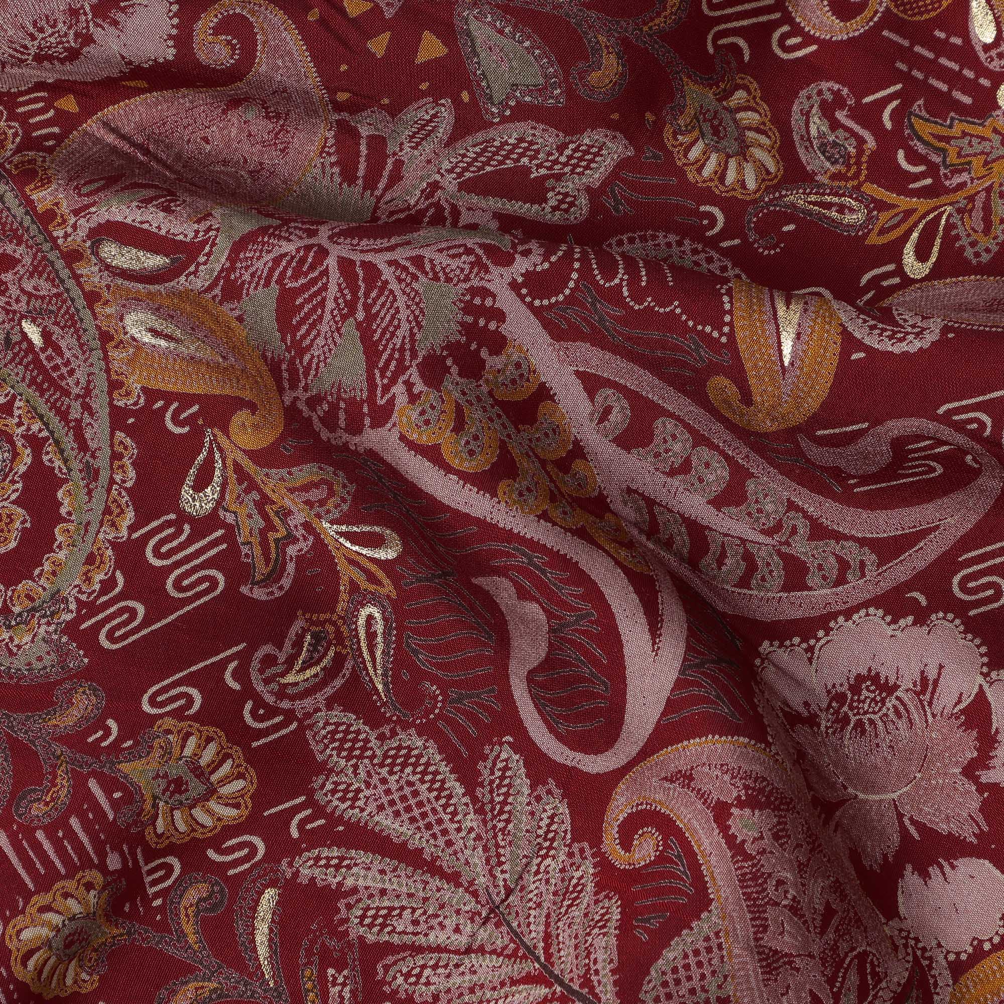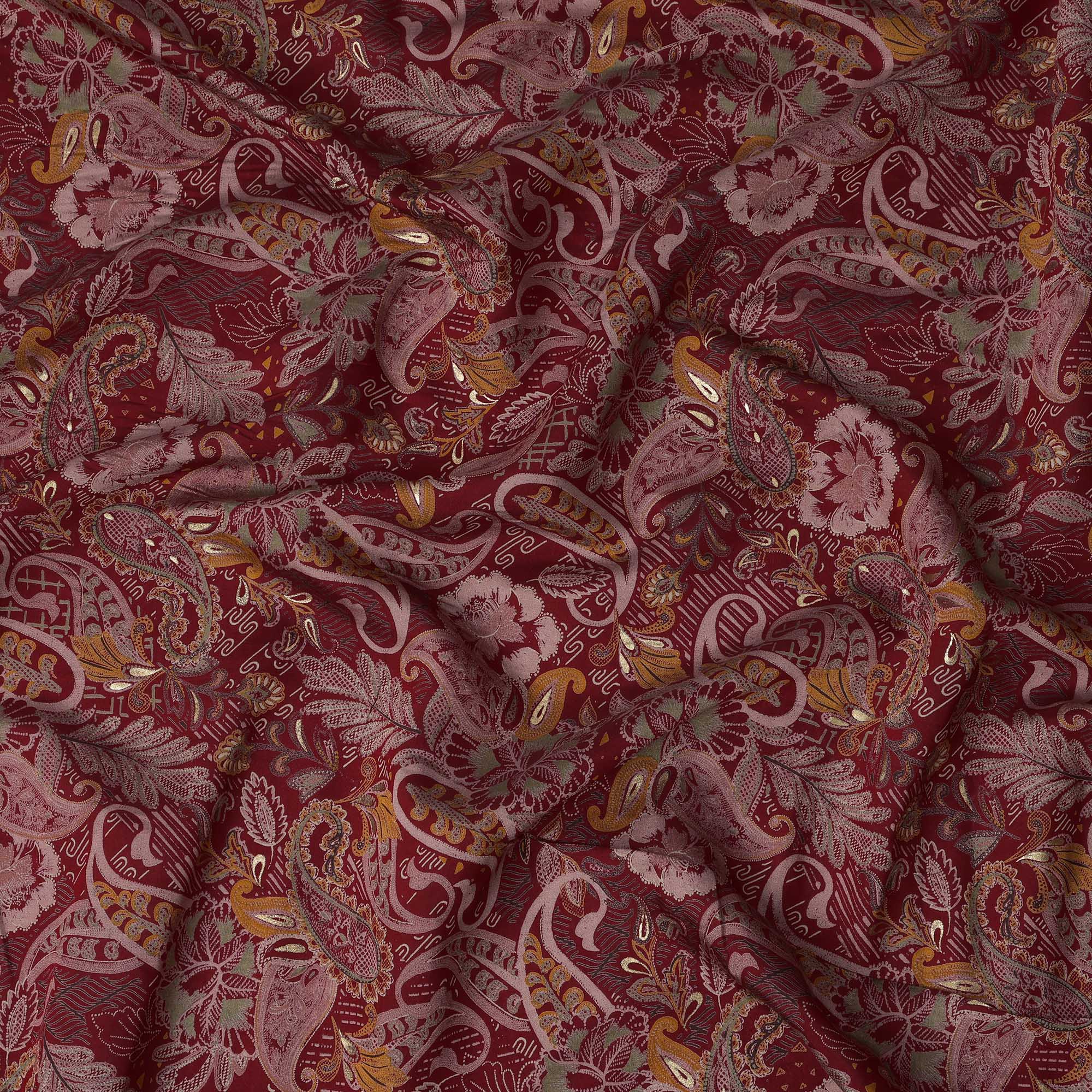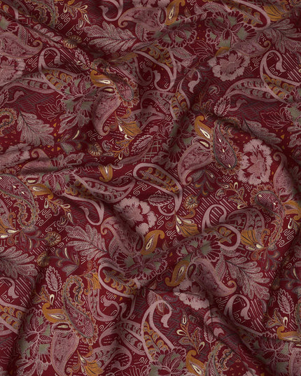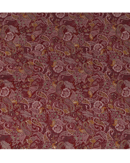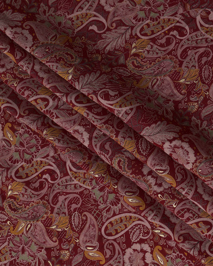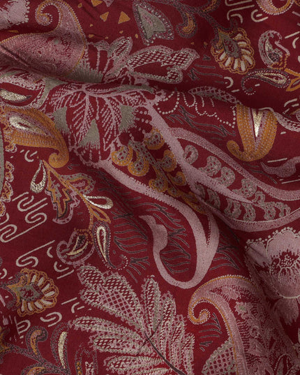 Maroon Paisley and Floral Printed Blended Viscose Fabric with Gold Accents and Intricate Detailing, 110 Cms Width, Made in India-D22812