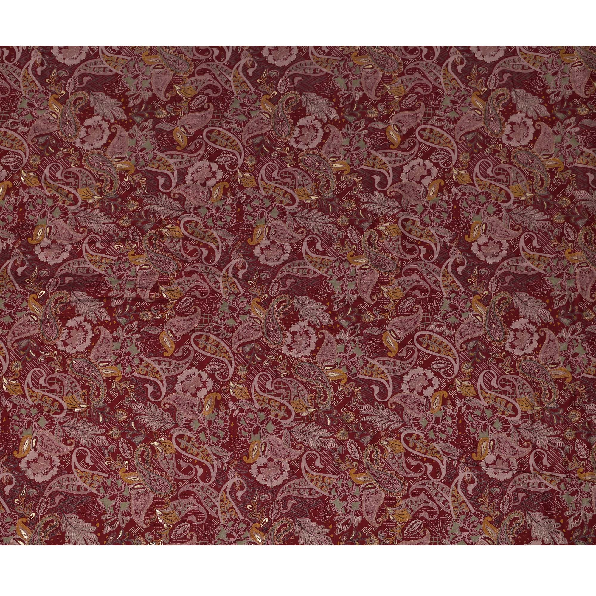 Maroon base with intricate paisley and floral motifs in earthy and pastel tones.