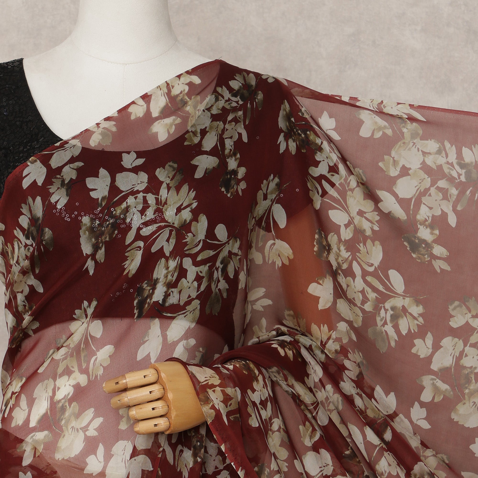 This maroon premium pure silk chiffon saree is a celebration of elegance and lightweight luxury, designed for the modern woman who appreciates the finesse of traditional artistry. Crafted from high-quality chiffon sourced from India, this saree flows effortlessly, creating an ethereal silhouette that complements every body type. The fabric is adorned with delicate floral prints in soft beige and olive tones, giving it a graceful yet understated appeal perfect for both daytime functions and evening soirees. With a generous width of 110 cms and a length of 5.5 meters, this saree allows for versatile draping styles while ensuring maximum comfort. The translucent texture of the chiffon enhances its fluidity, making it a breathable and flattering choice for festive wear, weddings, or elegant gatherings. The exquisite floral detailing pays homage to classic botanical motifs, adding a subtle vintage charm to your ethnic wardrobe. Blouse piece not included. Easy to maintain with gentle hand wash or dry cleaning recommended. Pair it with a sequin or embroidered blouse to complete the look and make a lasting impression.