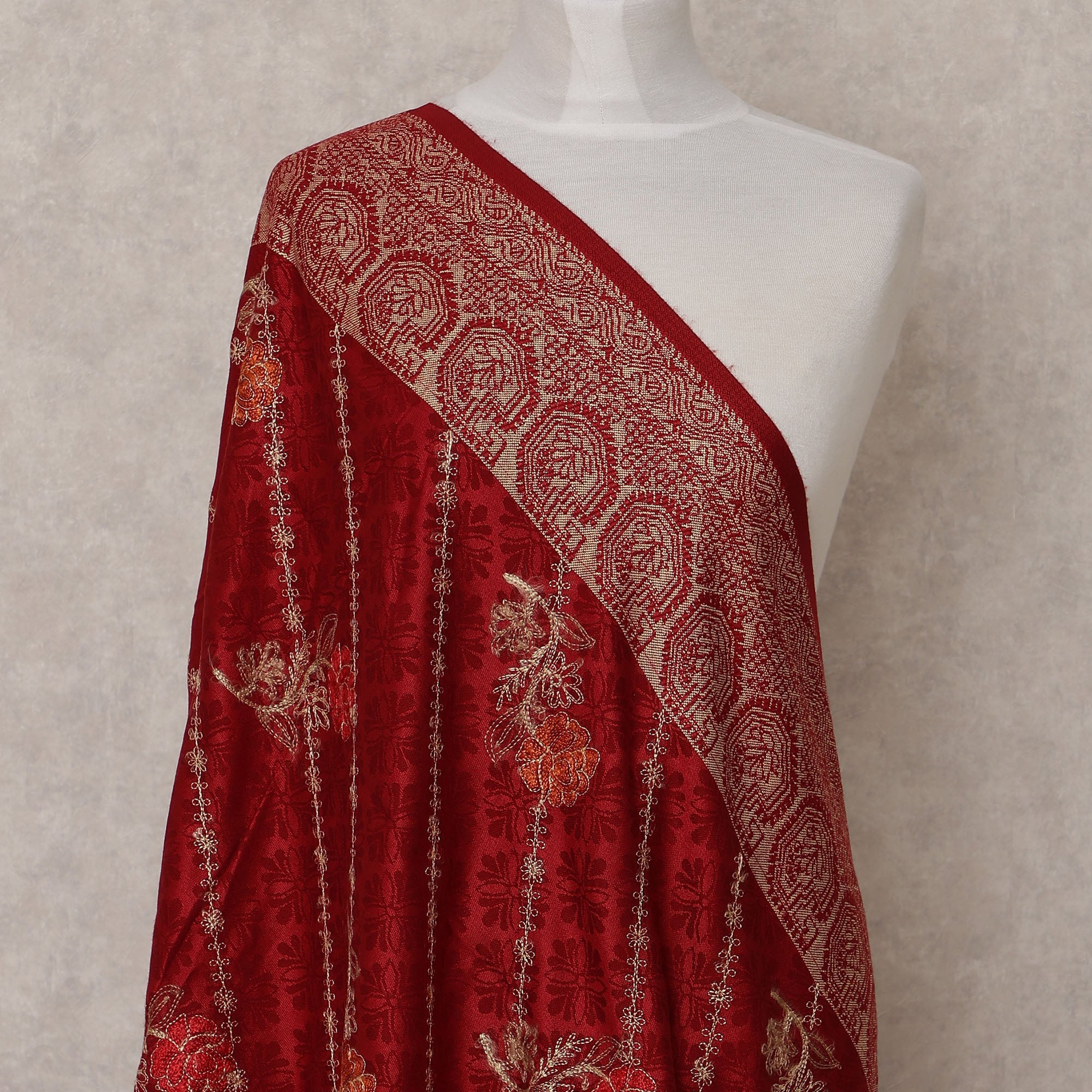 Detailed woven border enhances the richness and elegance of the shawl