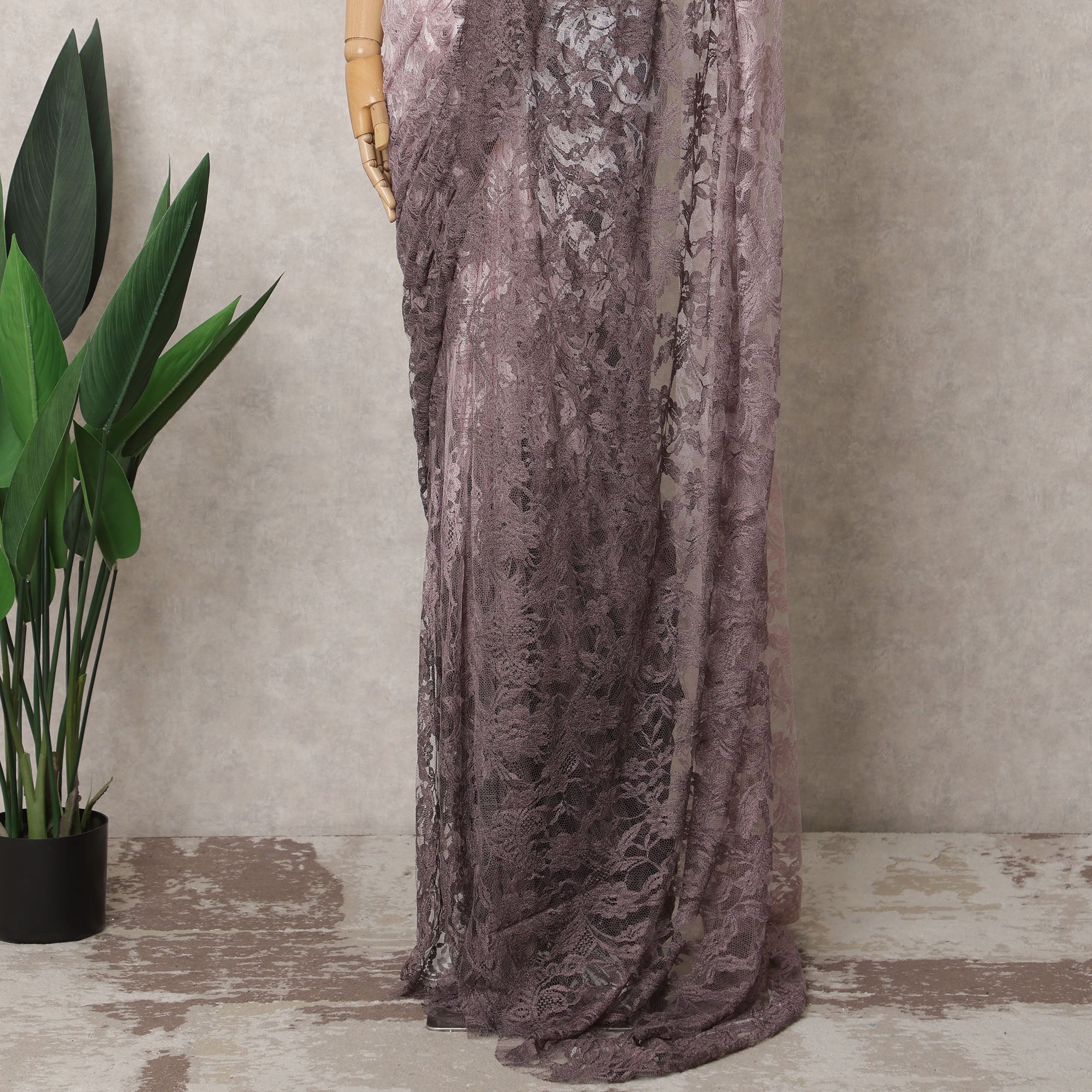 This exquisite mauve and lavender ombre French Chantilly lace saree is a perfect blend of elegance and sophistication. Crafted from premium Chantilly lace, the fabric features a seamless gradient transitioning from deep mauve to soft lavender, adorned with intricate floral patterns for a luxurious appeal. The lightweight, sheer texture ensures a graceful drape, making it an ideal choice for weddings, festive occasions, and evening events. With a width of 110 cm and a length of 5.5 meters, this unstitched saree provides ample fabric for versatile styling, ensuring a timeless and refined look. Please note that the blouse is not included.