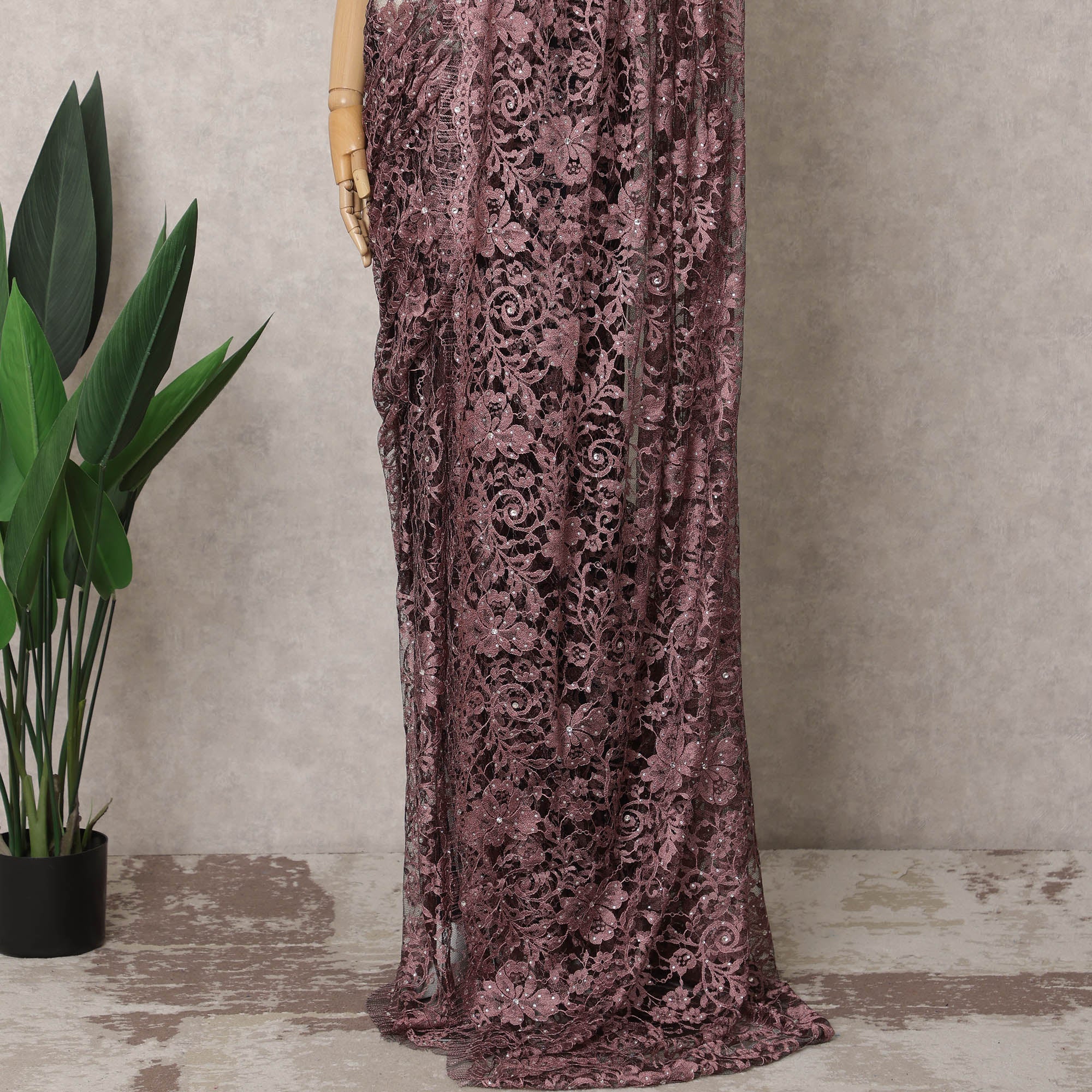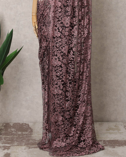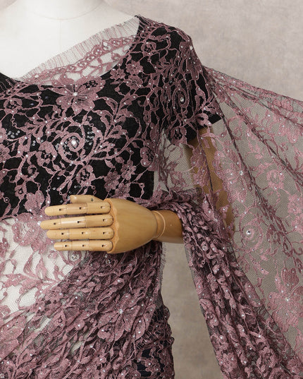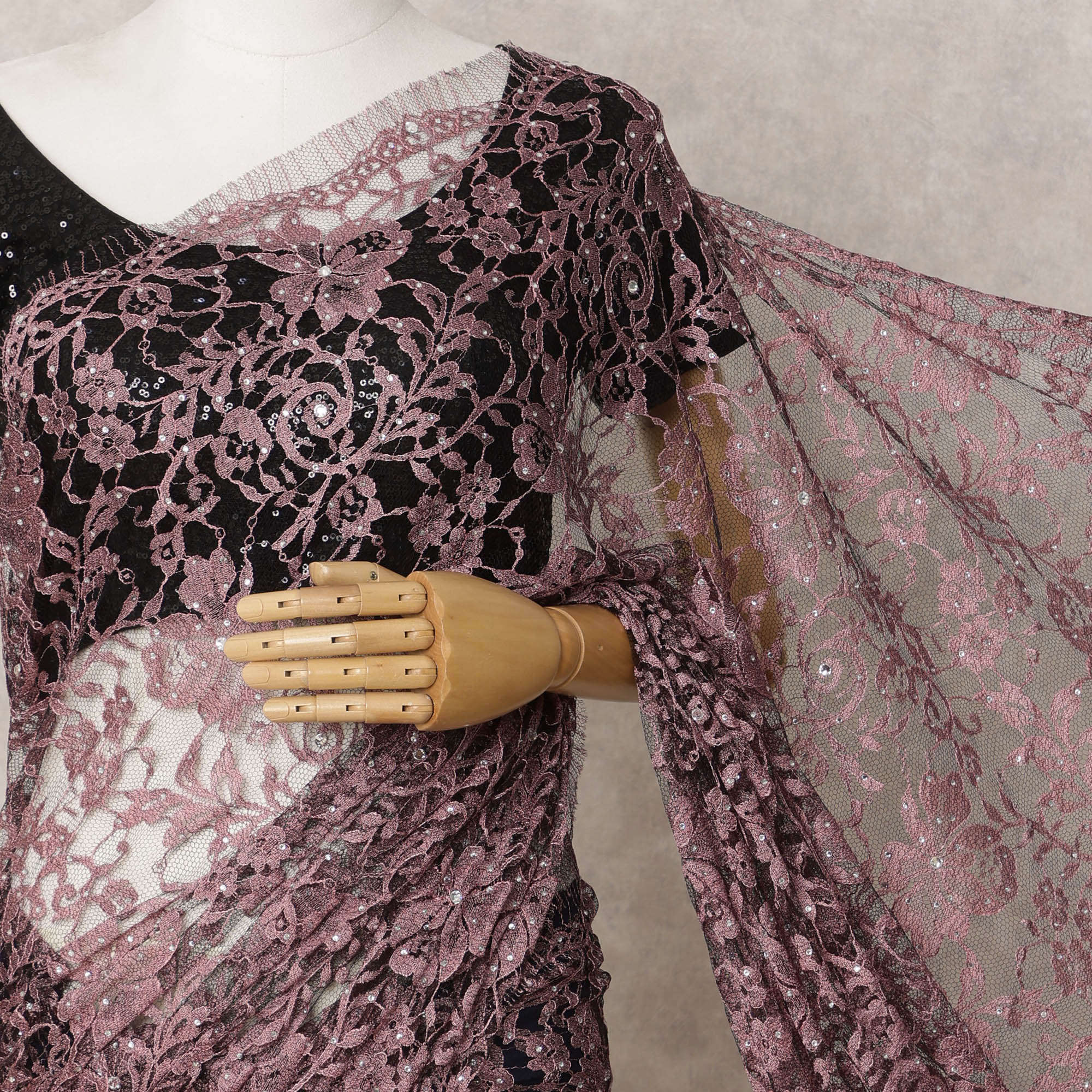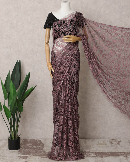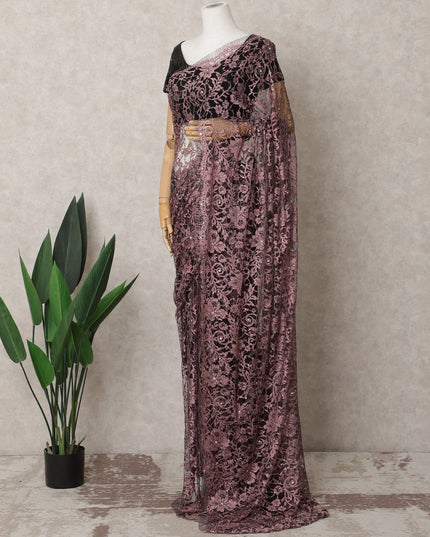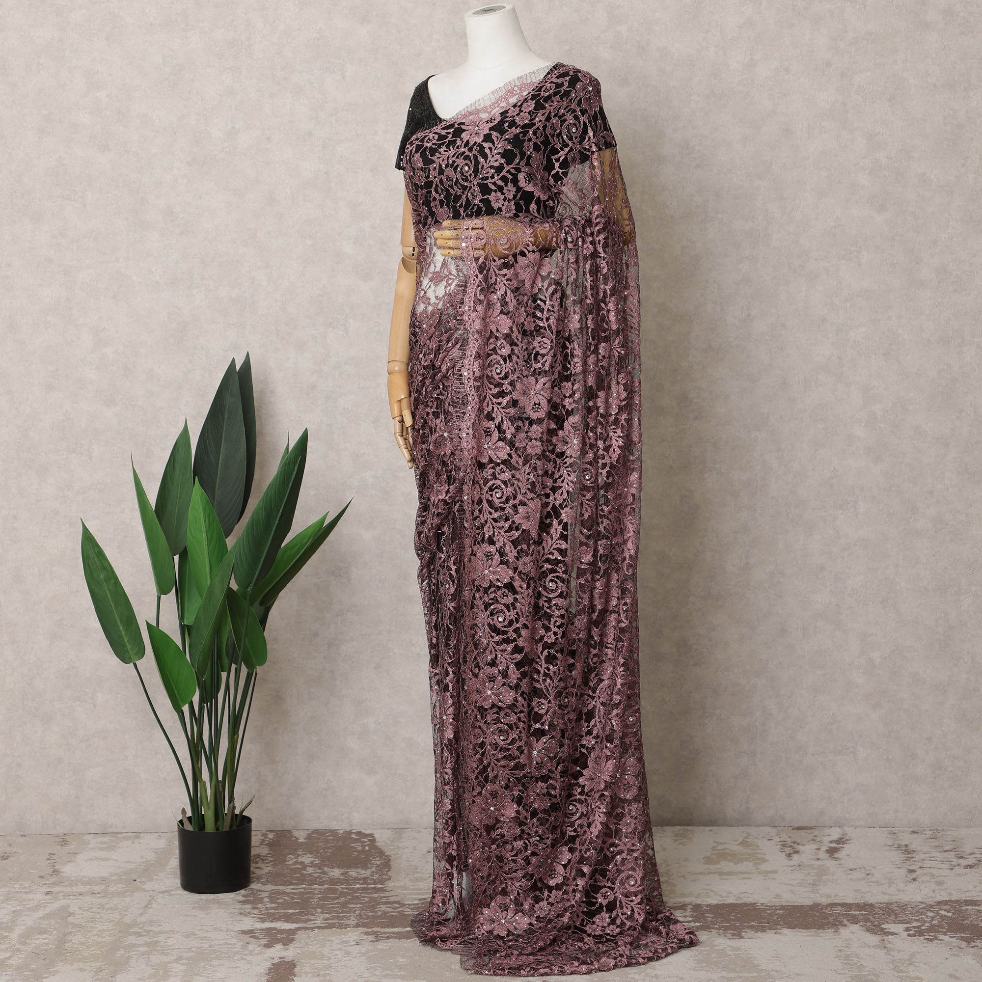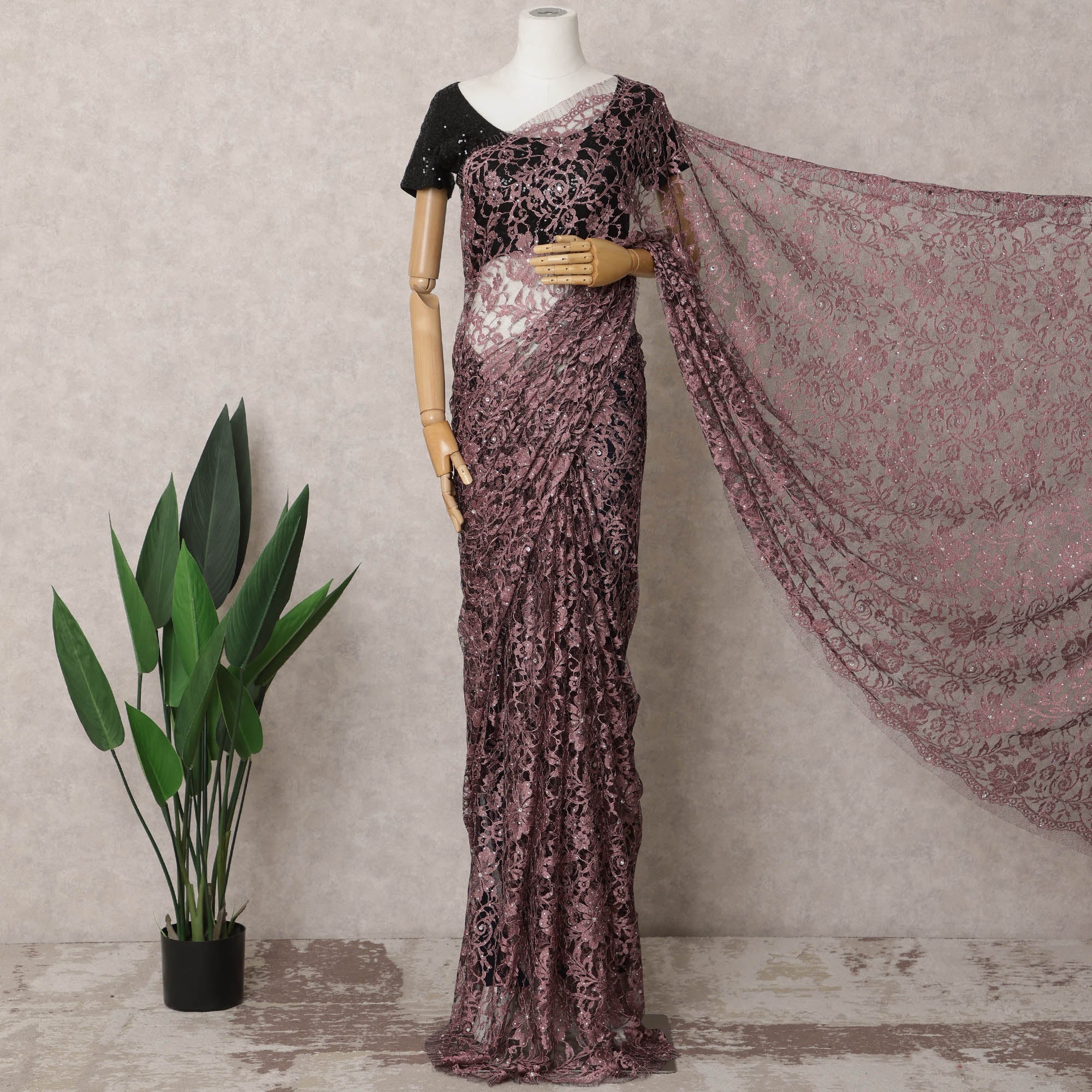 Mauve Pink & Black Premium French 2-Tone Chantilly Lace Saree – 5.5 Meters, Stone Work-D21870