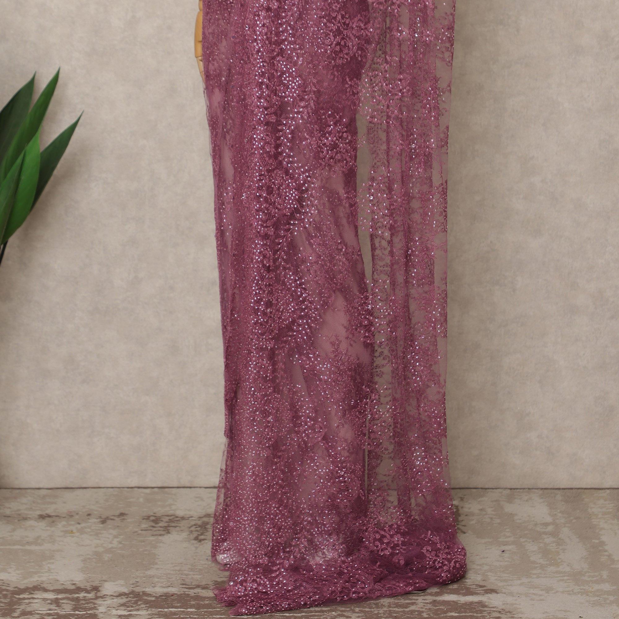 Mauve Premium French Metallic Chantilly Saree Lace with Stone Work 5.5 Mtrs Length, Width 110 Cms and Made in France-D27185