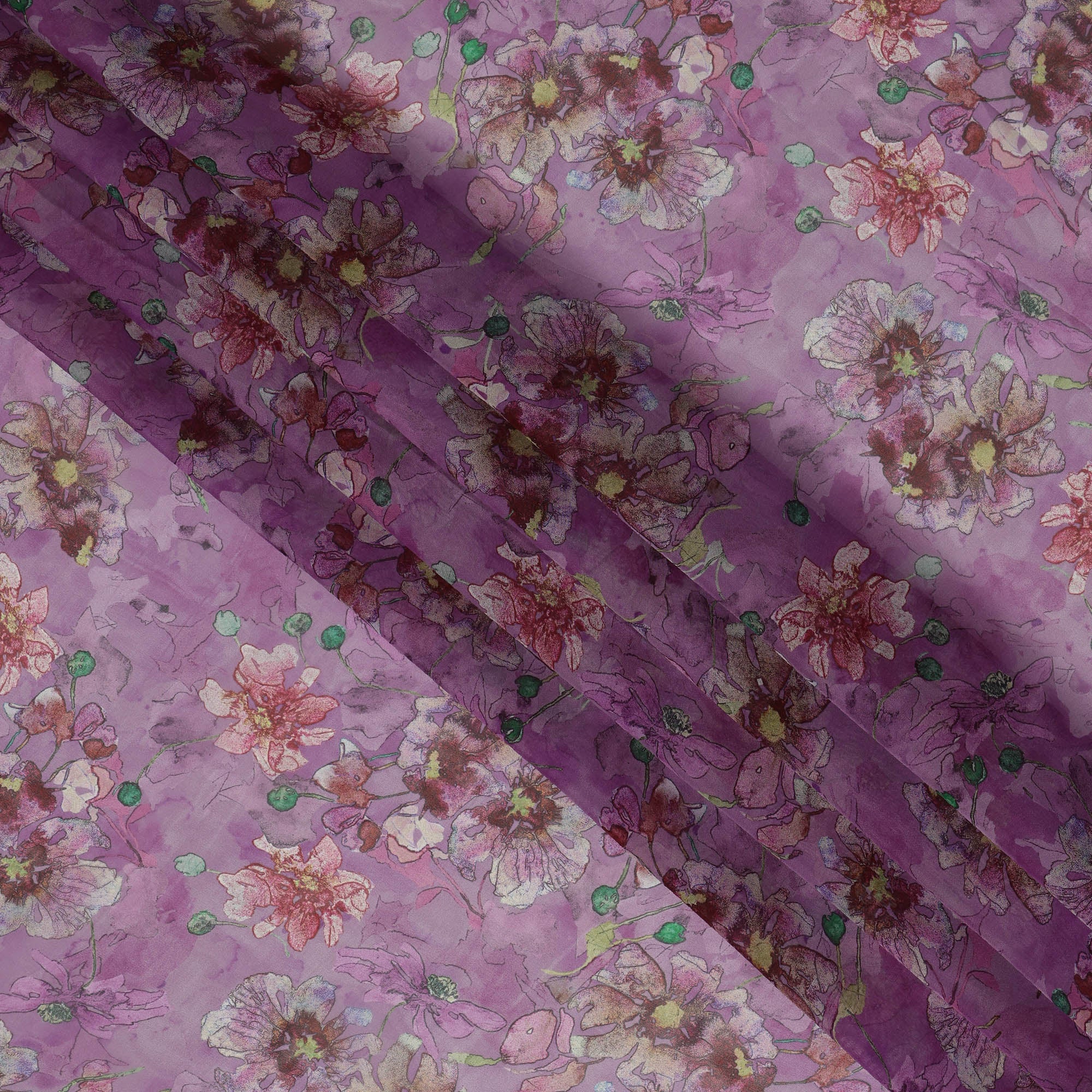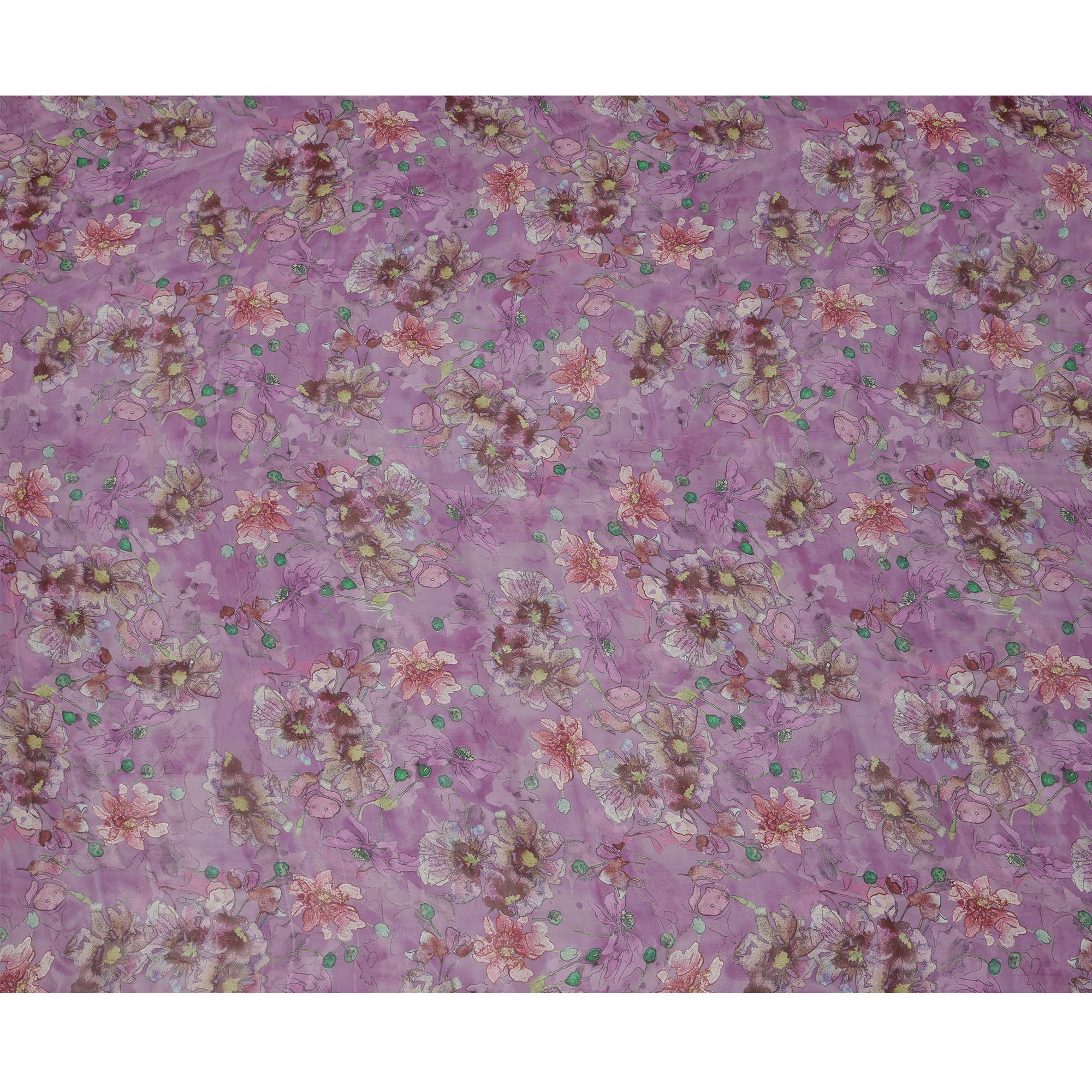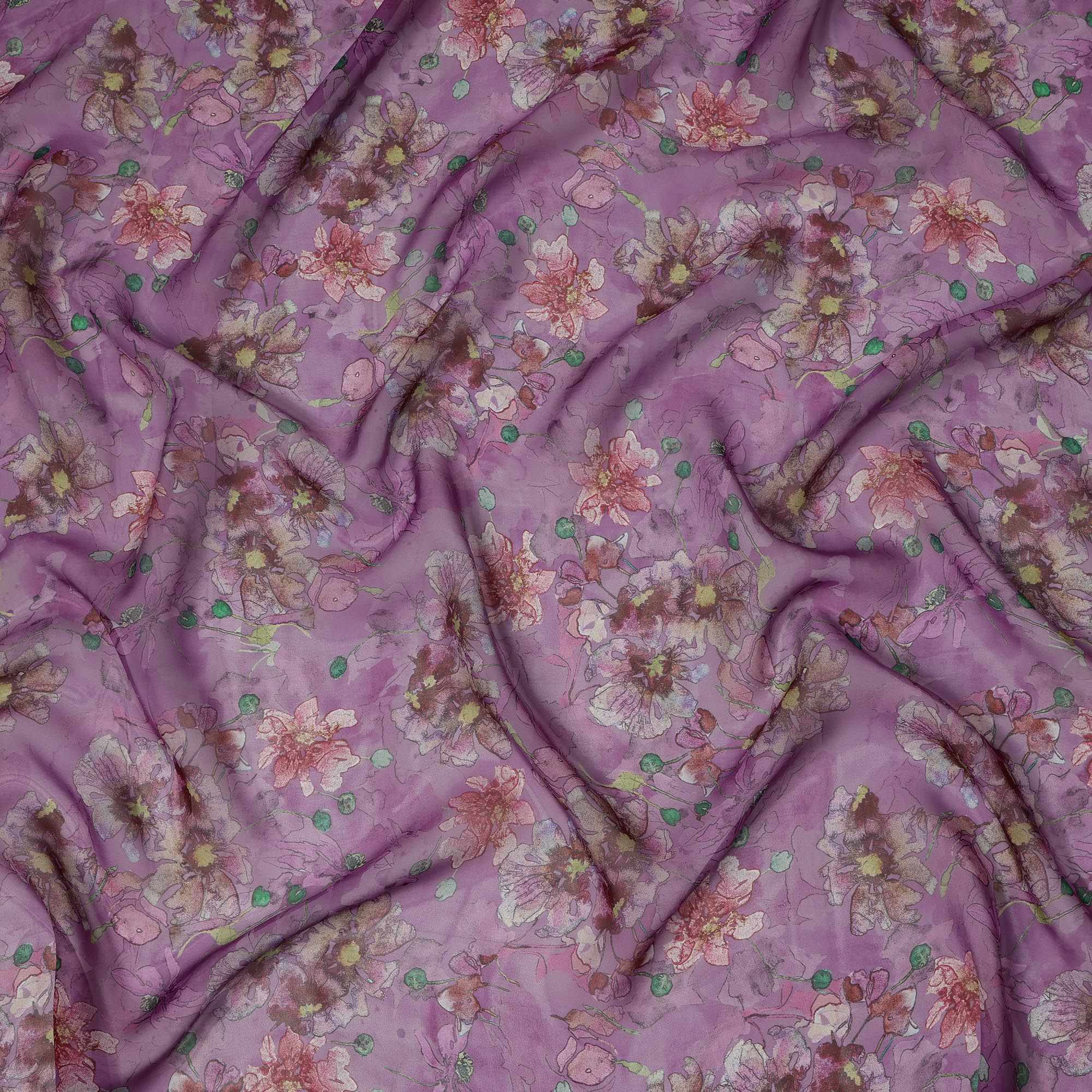 Add a touch of ethereal charm to your wardrobe with this mauve purple synthetic organza fabric showcasing an artistic floral print in soft shades of rose pink, plum, ivory, yellow, and green. The watercolor-like bloom detailing scattered gracefully across the sheer mauve base evokes a romantic and whimsical feel, perfect for designing flowy sarees, elegant dupattas, or festive overlays. Crafted with a light, semi-sheer texture and a crisp drape, the fabric enhances silhouette fluidity while maintaining its graceful structure. With a 110 cms width, it offers ample space for versatile ethnic and contemporary creations. Made in India with premium synthetic yarns and refined print precision, this fabric combines feminine floral aesthetics with wearable elegance. Shop online and elevate your occasion wear with this artistic, dreamlike organza fabric.