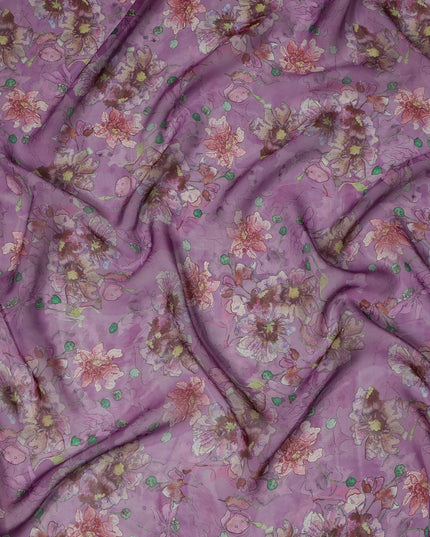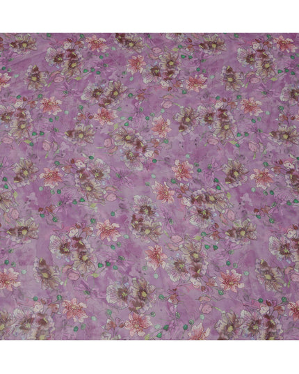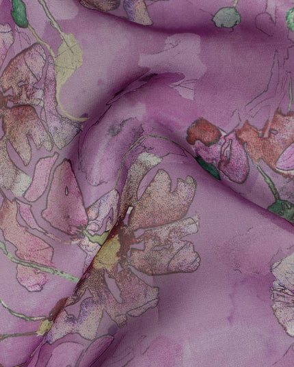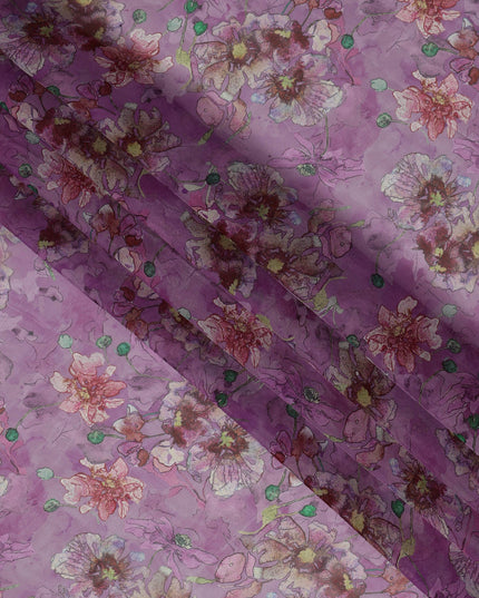 Mauve Purple Multicolor Floral Printed Synthetic Organza Fabric with Artistic Bloom Detailing, Width 110 Cms, Made in India-D23324