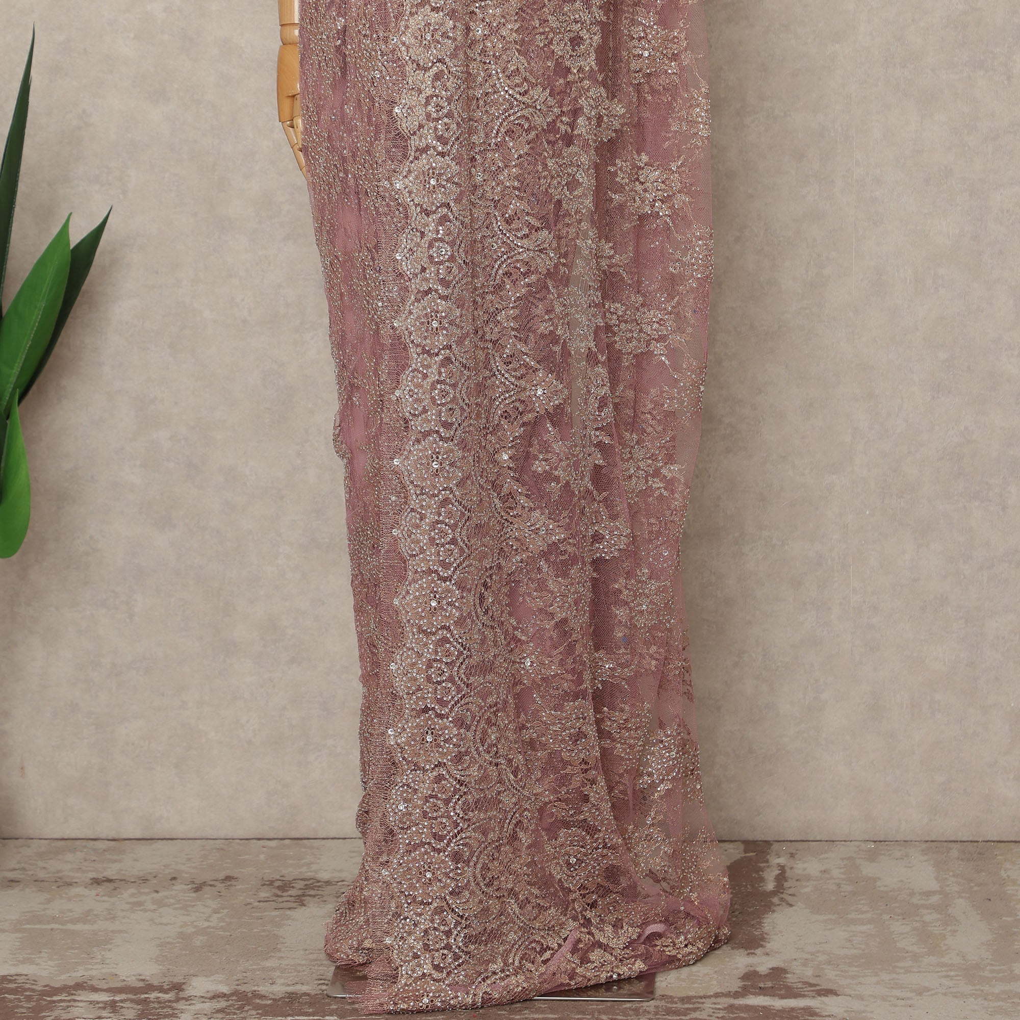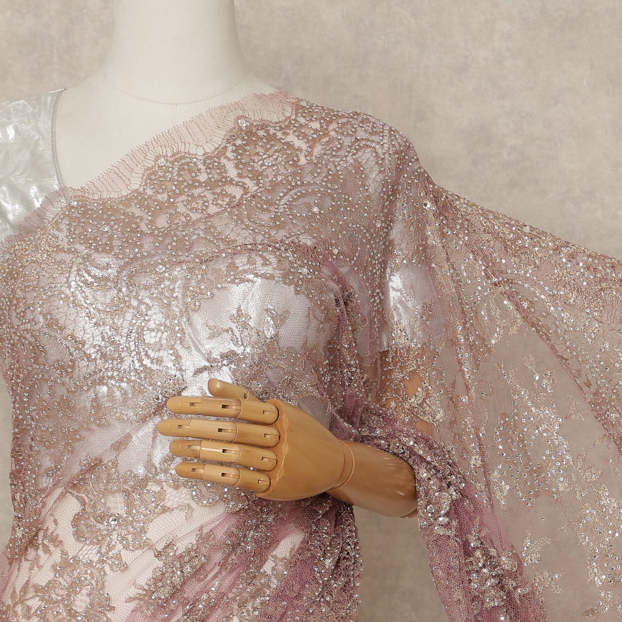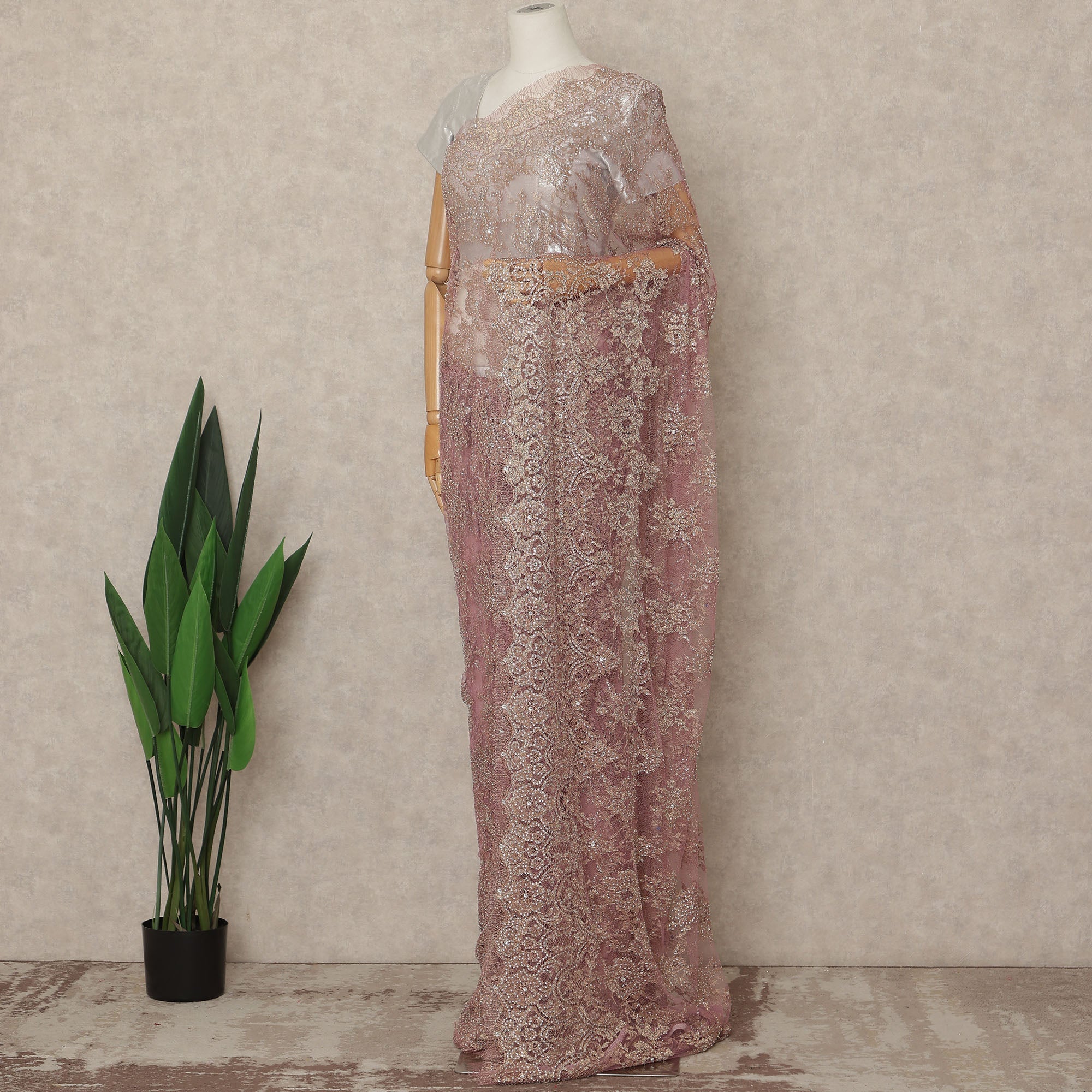 Mauve Rose Premium French 2 Tone Chantilly Saree Lace With Stone Work Fabric 5.5 Meters Length 110 Cms Width Imported From France Elegant Designer Lace Blouse Not Included-D27374