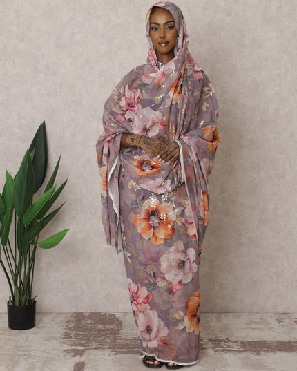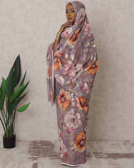 Elevate your style with this exquisite mauve traditional Sudanese thobe, crafted from premium pure cotton voile fabric for a soft, breathable, and lightweight feel. The 4.5-meter-long fabric drapes gracefully, offering a sophisticated and modest silhouette perfect for cultural gatherings, festive occasions, and daily wear. Featuring a mesmerizing floral print in shades of orange, pink, and white with delicate gold shimmer accents, this thobe beautifully blends tradition with modern elegance. With a width of 140 cm, it ensures full coverage while maintaining an airy and comfortable fit. Expertly crafted in India, this high-quality thobe is easy to care for, retaining its vibrant colors and fabric softness even after multiple washes, making it a timeless addition to any wardrobe.