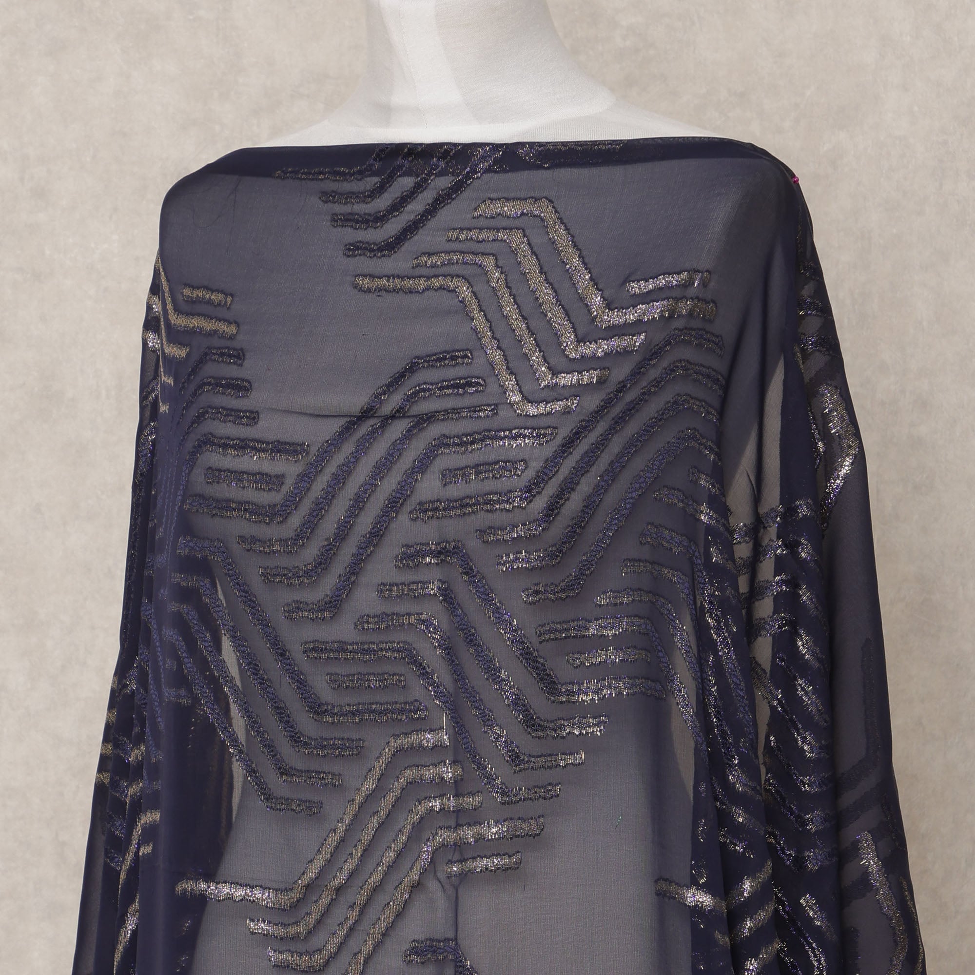 This midnight blue pure silk chiffon Somali dirac fabric with metallic lurex features a captivating geometric shimmer that radiates elegance... Read more Read more