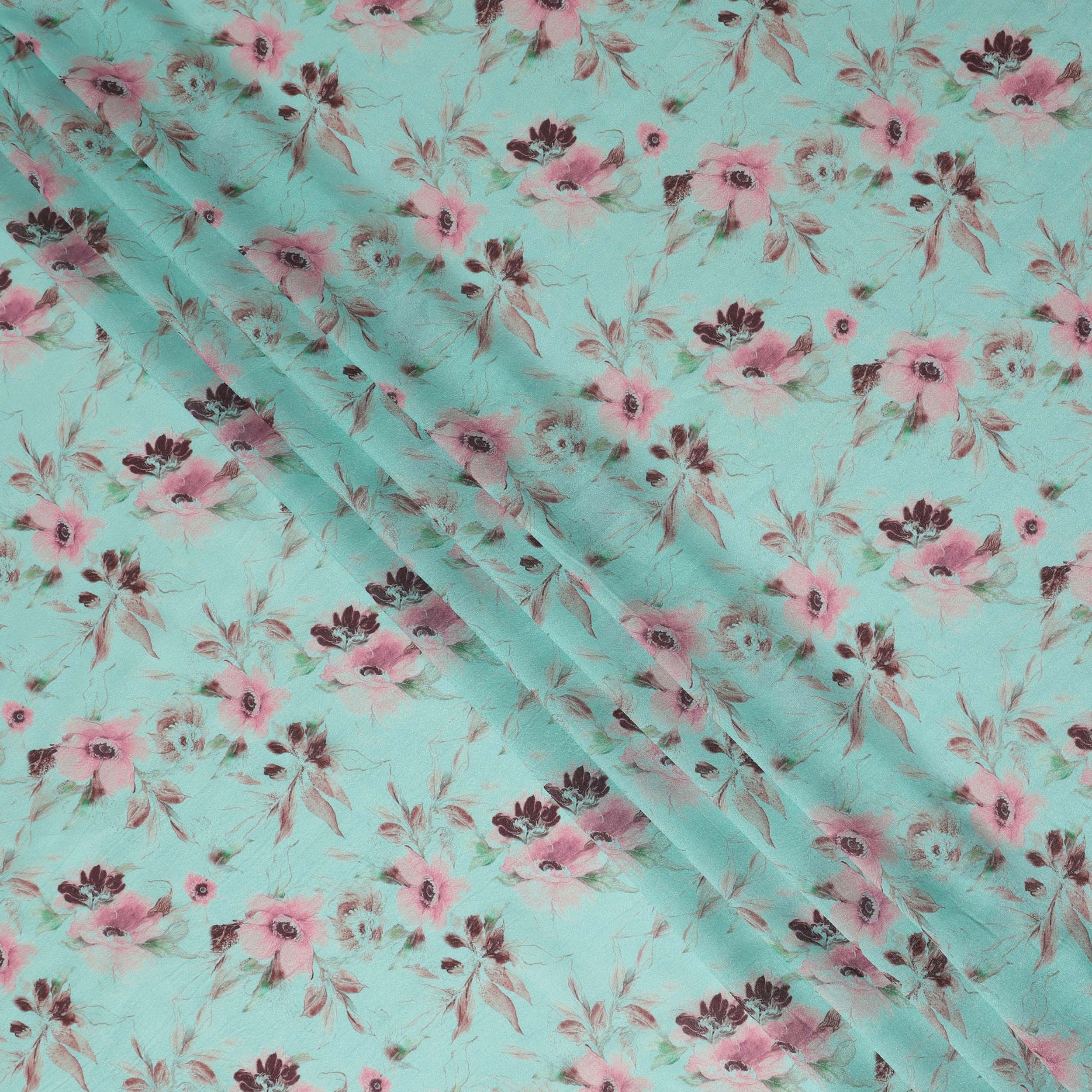 Mint Aqua Floral Printed Viscose Modal Satin Fabric Soft Smooth Lightweight Watercolor Botanical Flower Pattern Elegant Dress Sewing Fabric 110 Cms Width Made In India-D28315