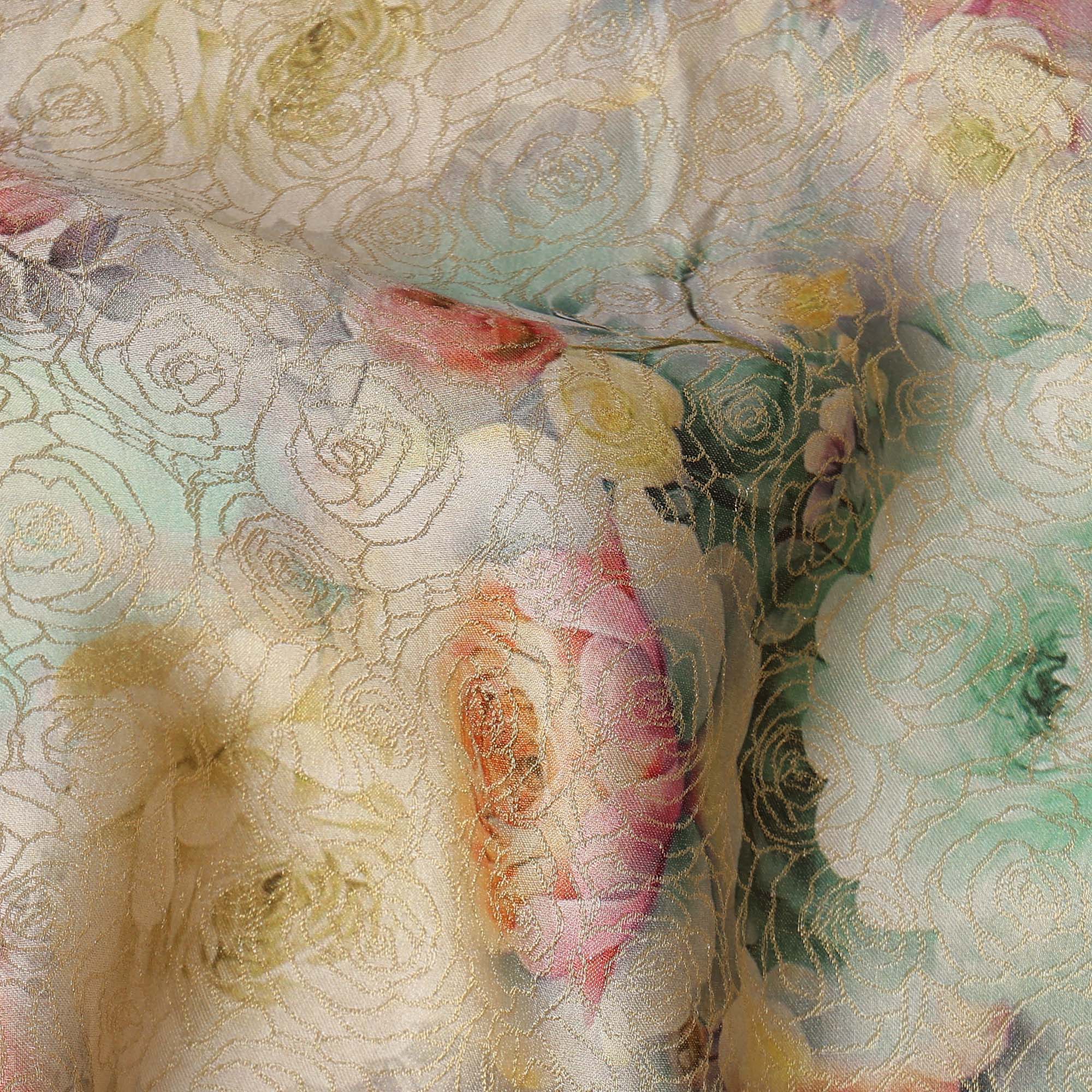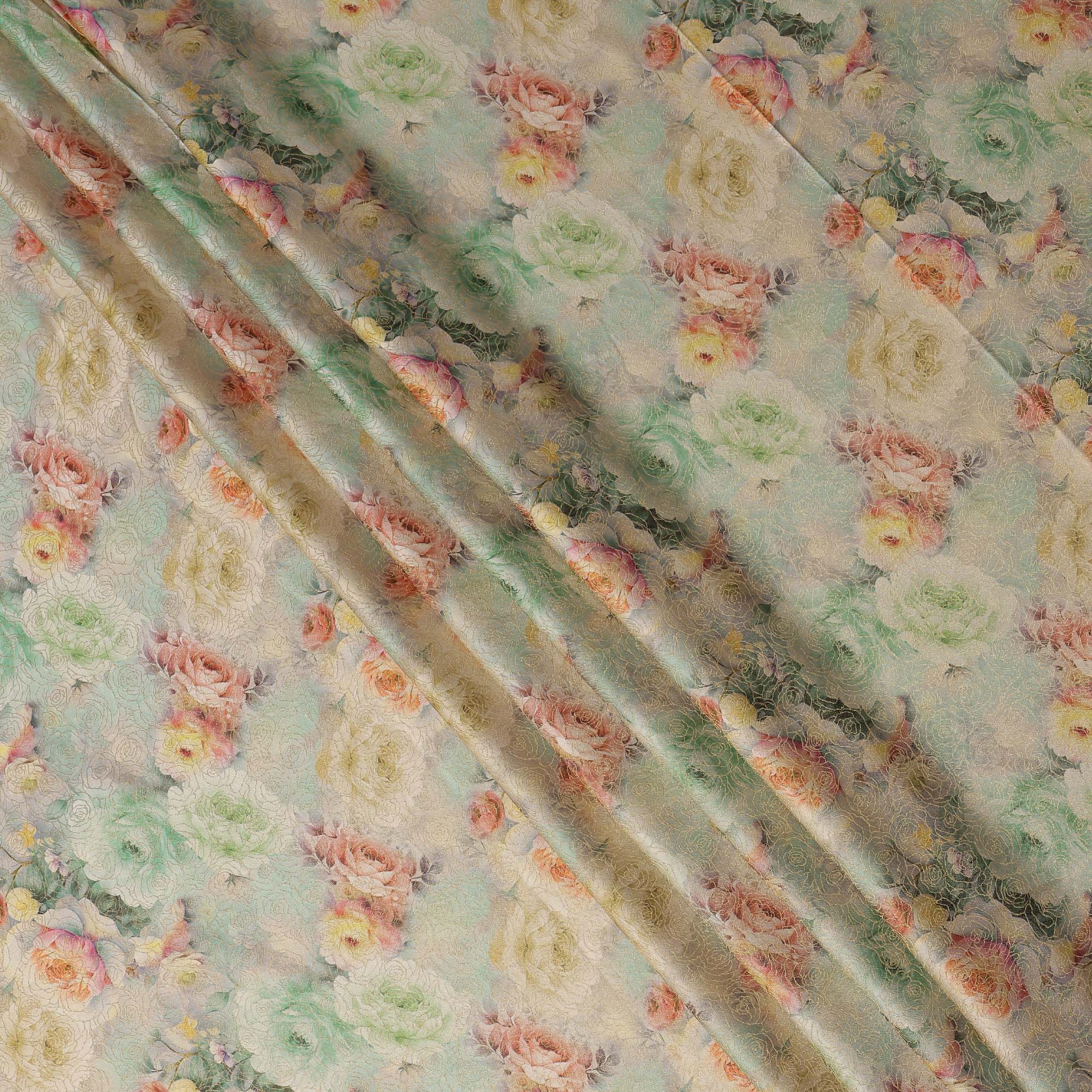 Mint Beige Floral Printed Viscose Jacquard Metallic Fabric, 110 Cms Width, Made in India-D26212