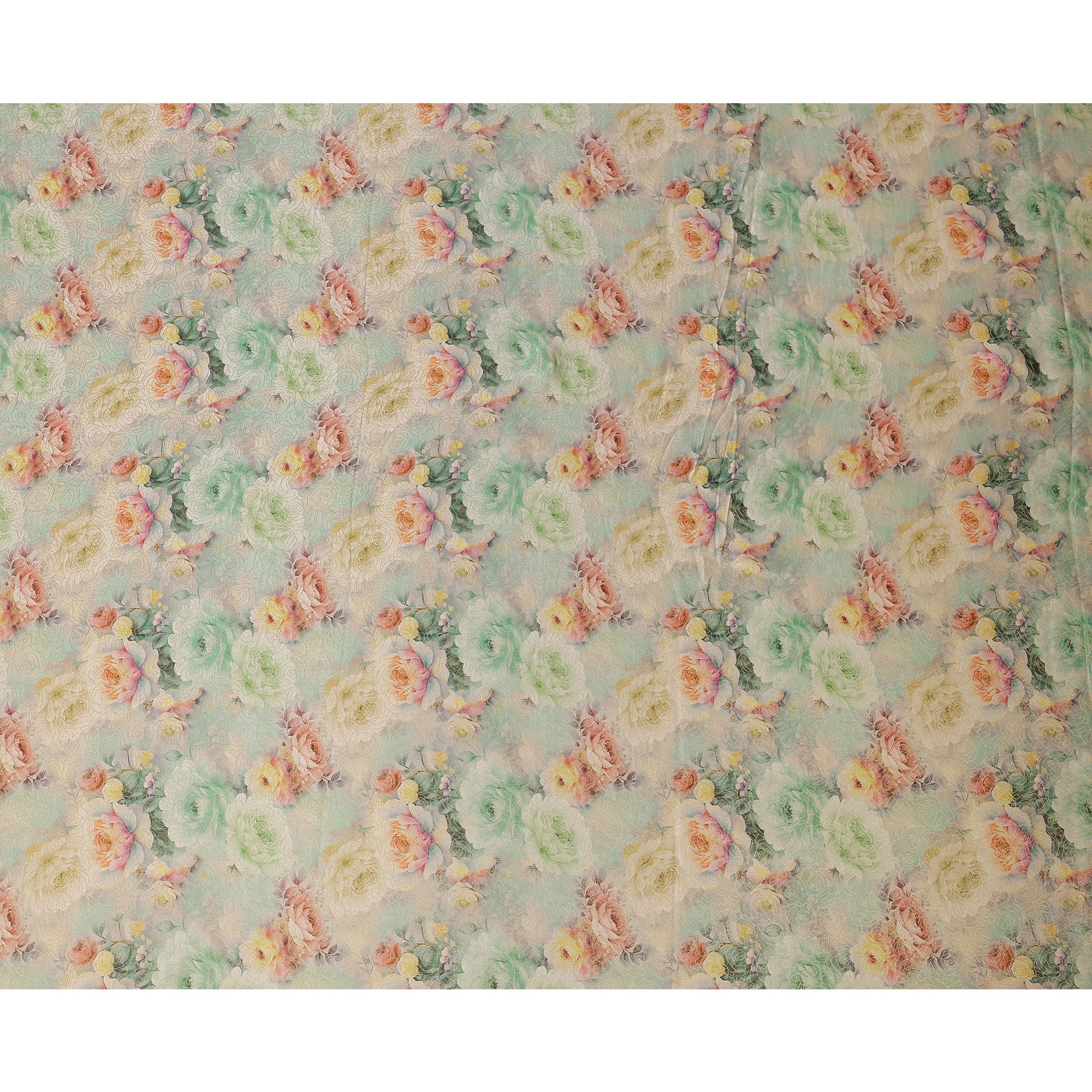 This Mint Beige Floral Printed Viscose Jacquard Metallic Fabric embodies sophistication, freshness, and charm in every thread. Expertly crafted in India, the fabric features a soothing mint-beige base that beautifully complements the soft floral design in pastel tones of peach, yellow, and ivory. The intricate jacquard weave adds a subtle texture that enhances depth, while the metallic finish infuses a refined sheen for a luxurious touch. With a width of 110 cm, this premium viscose fabric is smooth, breathable, and drapes effortlessly, making it ideal for sarees, kurtas, dupattas, gowns, and festive dresses. The interplay of delicate floral motifs against the elegant jacquard base creates a timeless appeal suitable for both traditional and contemporary ensembles. Lightweight yet rich in feel, it offers a perfect combination of comfort, structure, and glamour. The metallic undertones catch light beautifully, giving your designs a graceful shimmer that elevates any occasion wear with understated elegance.