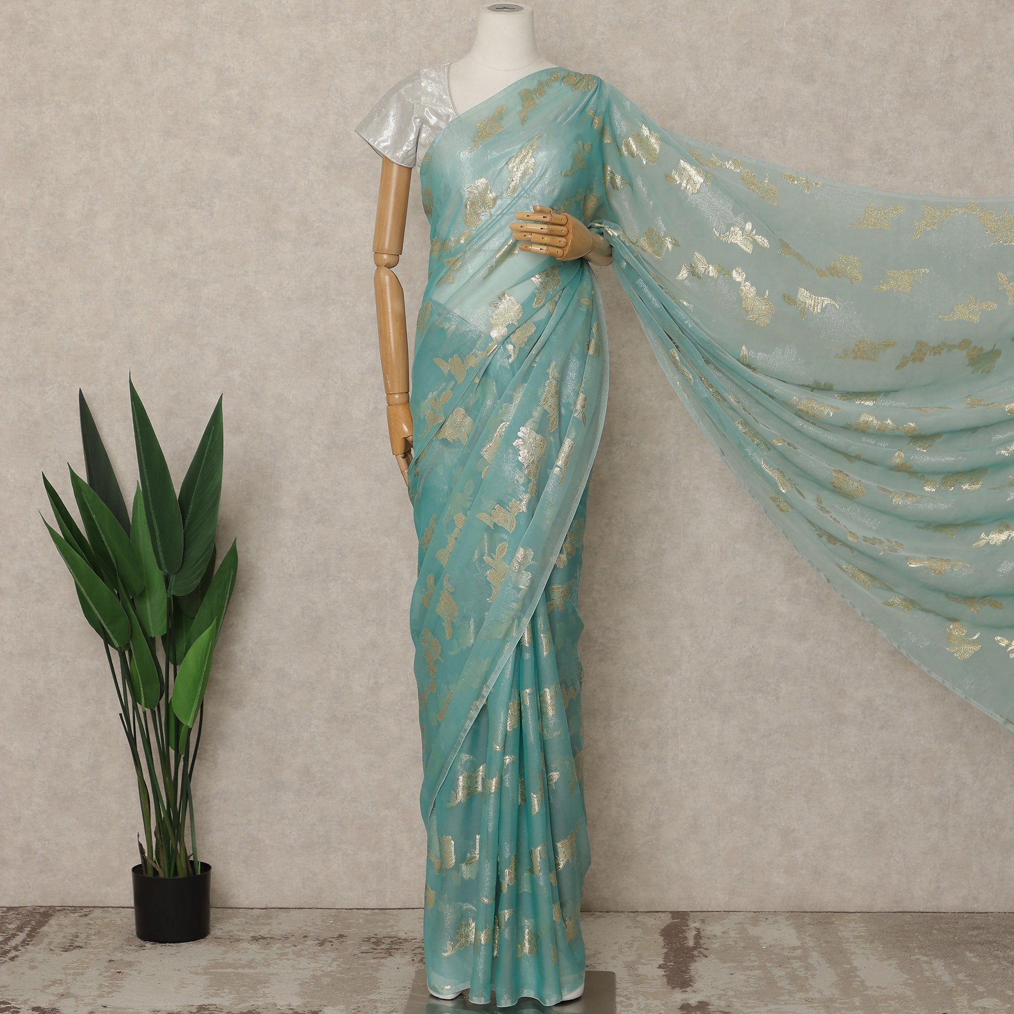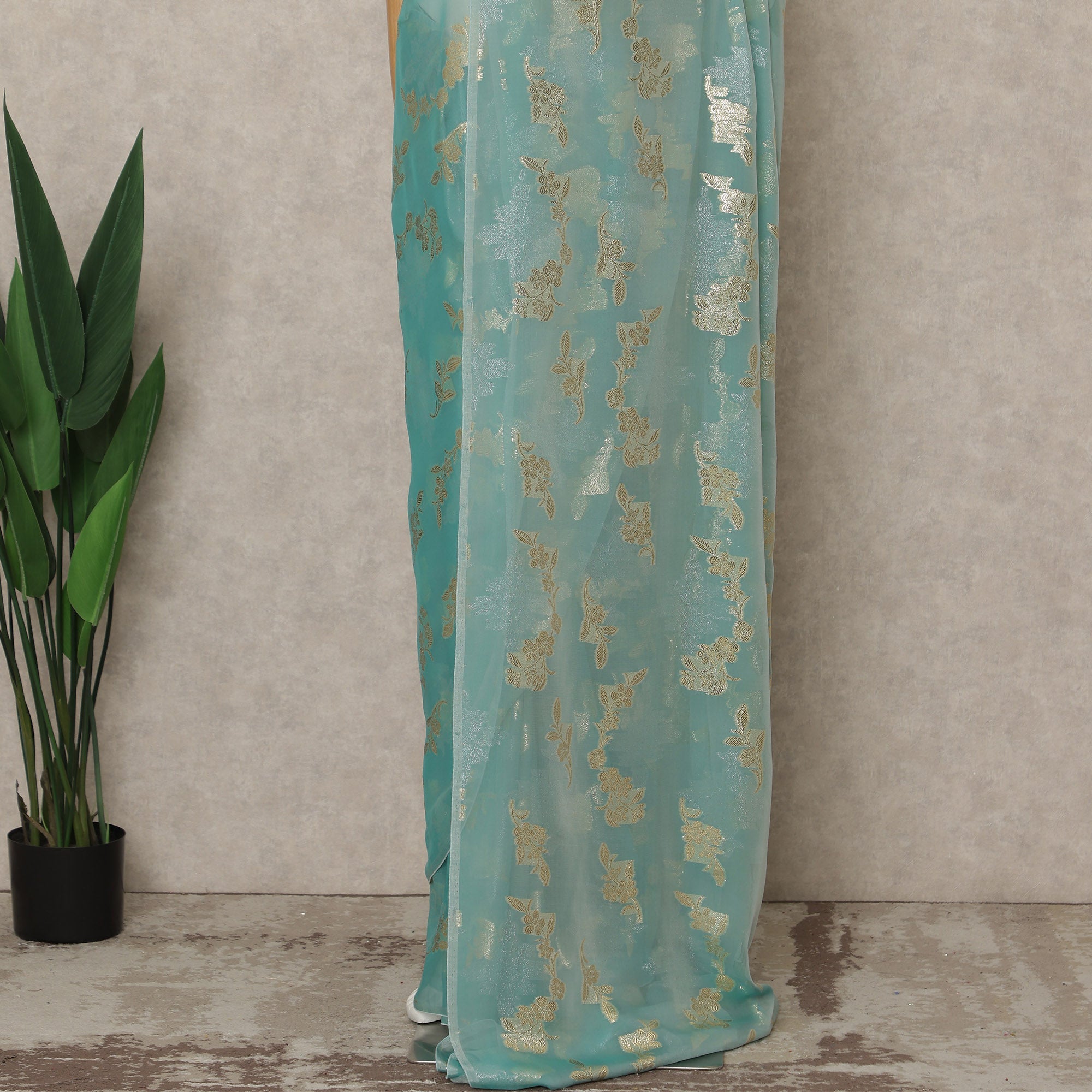 This premium French silk chiffon saree in a refreshing mint Blue shade is adorned with elegant gold woven floral motifs that add a soft shimmer and graceful charm. Made from high-quality chiffon sourced from France, the fabric is lightweight, airy, and fluid, ensuring a beautiful fall and effortless drape throughout the day. The subtle contrast of mint Blue and gold creates a refined look suitable for weddings, festive gatherings, receptions, and sophisticated daytime occasions. Measuring approximately 5.5 meters in length and 110 cms in width, this saree offers ample fabric for neat pleats and versatile draping styles while maintaining comfort and elegance. Blouse piece is not included, allowing you to customize the look with your preferred blouse design.