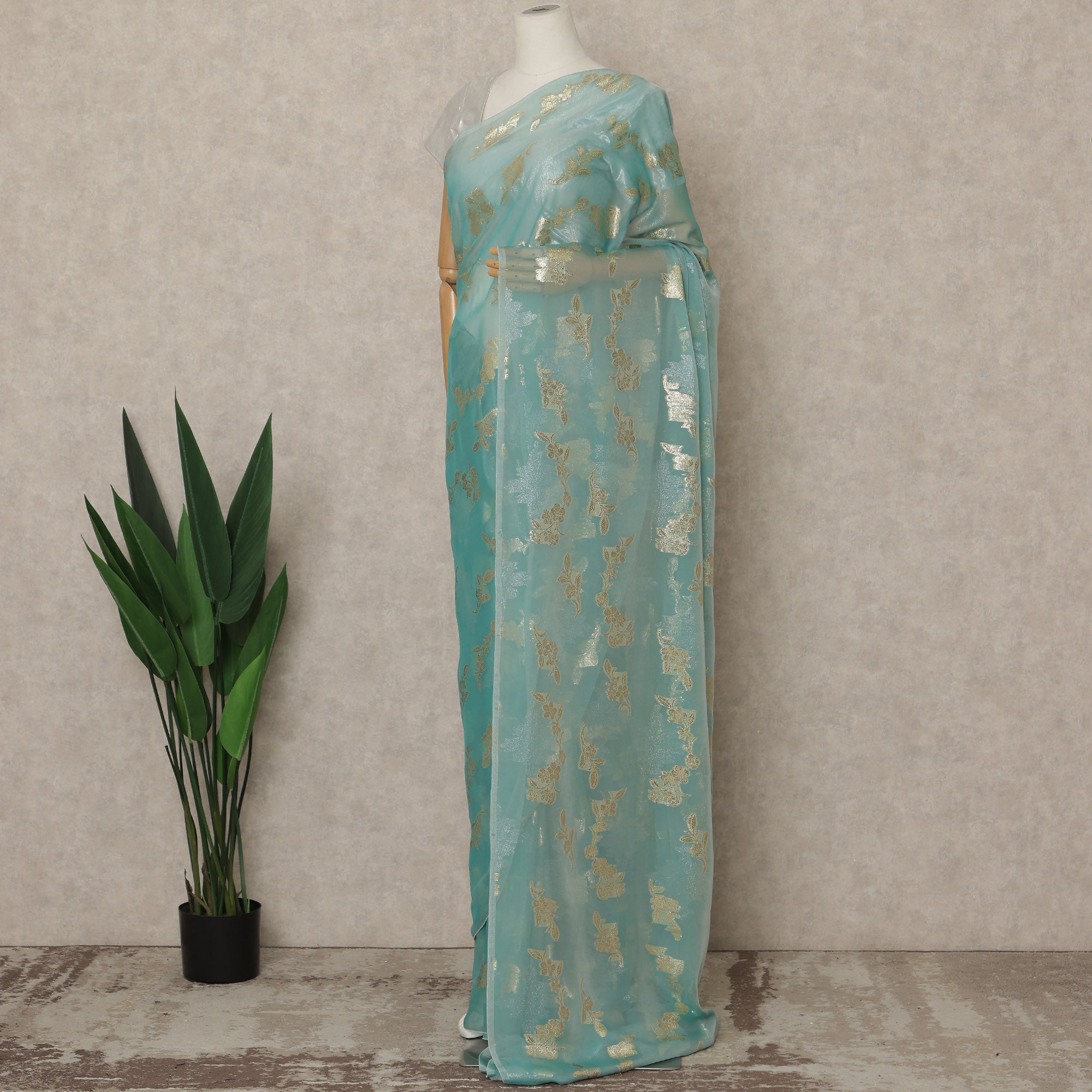 Mint Blue base with gold woven floral motifs adds a graceful and elegant appeal.
